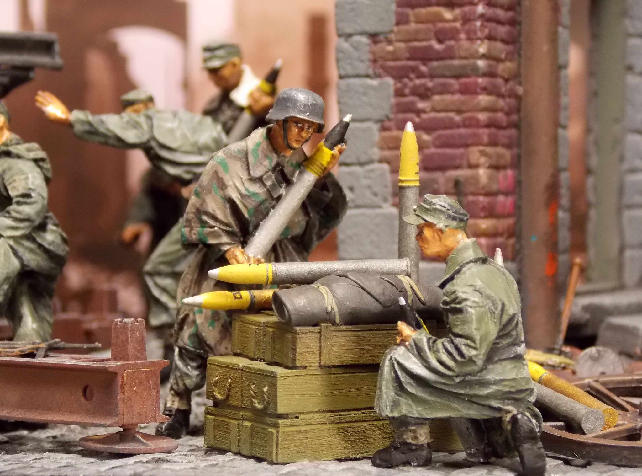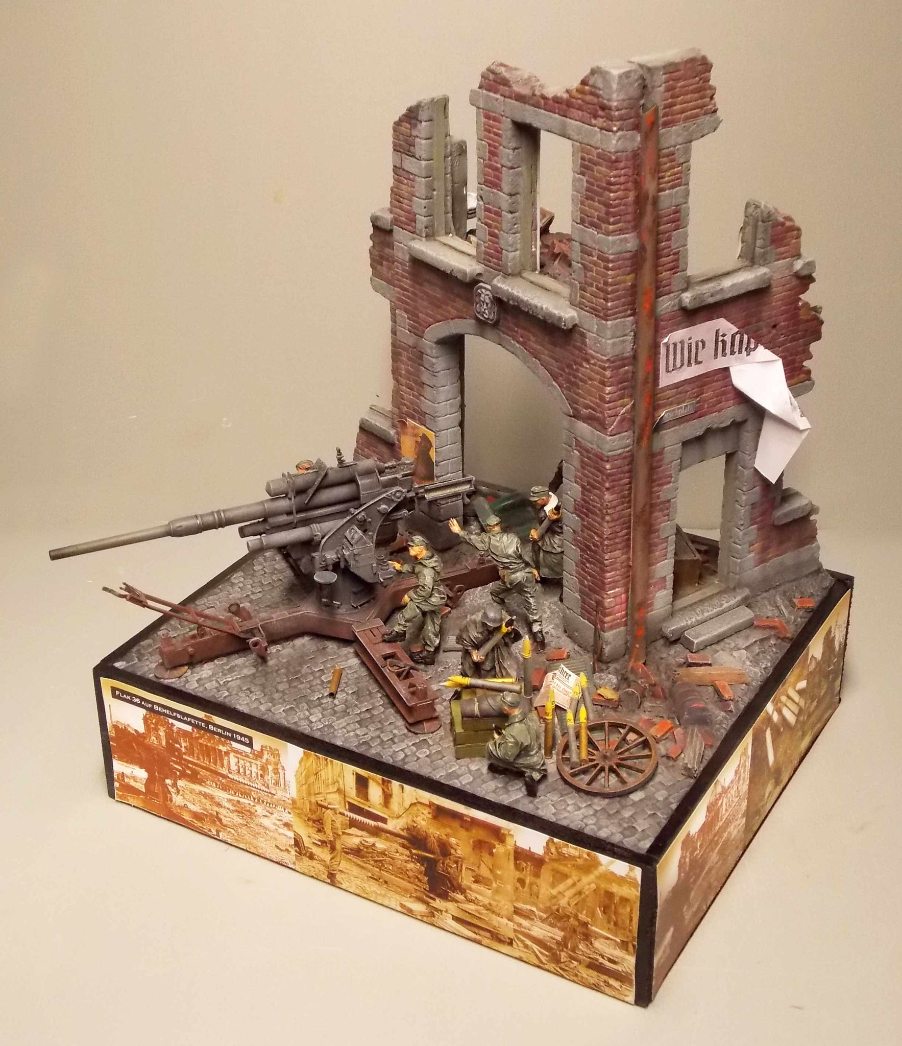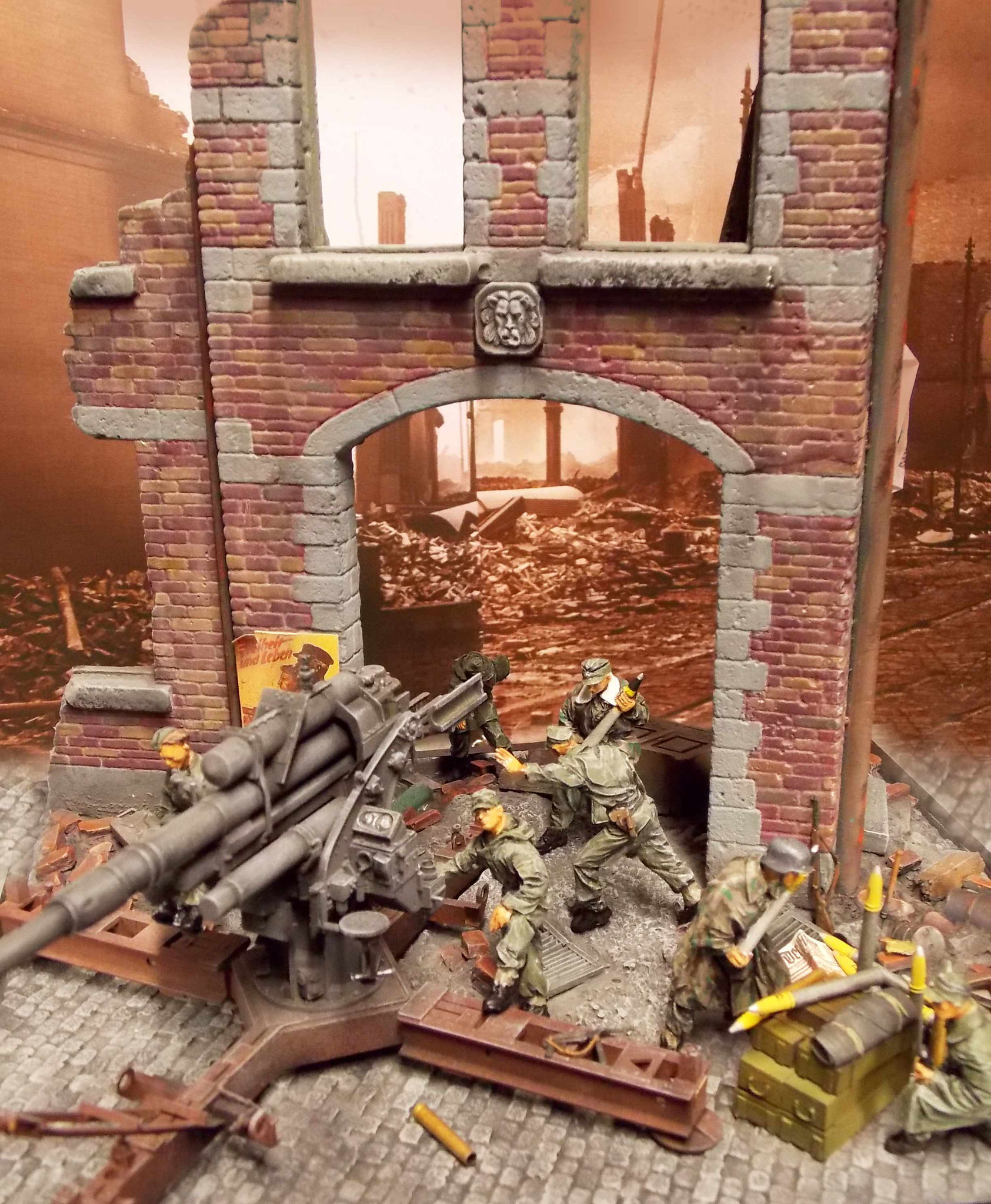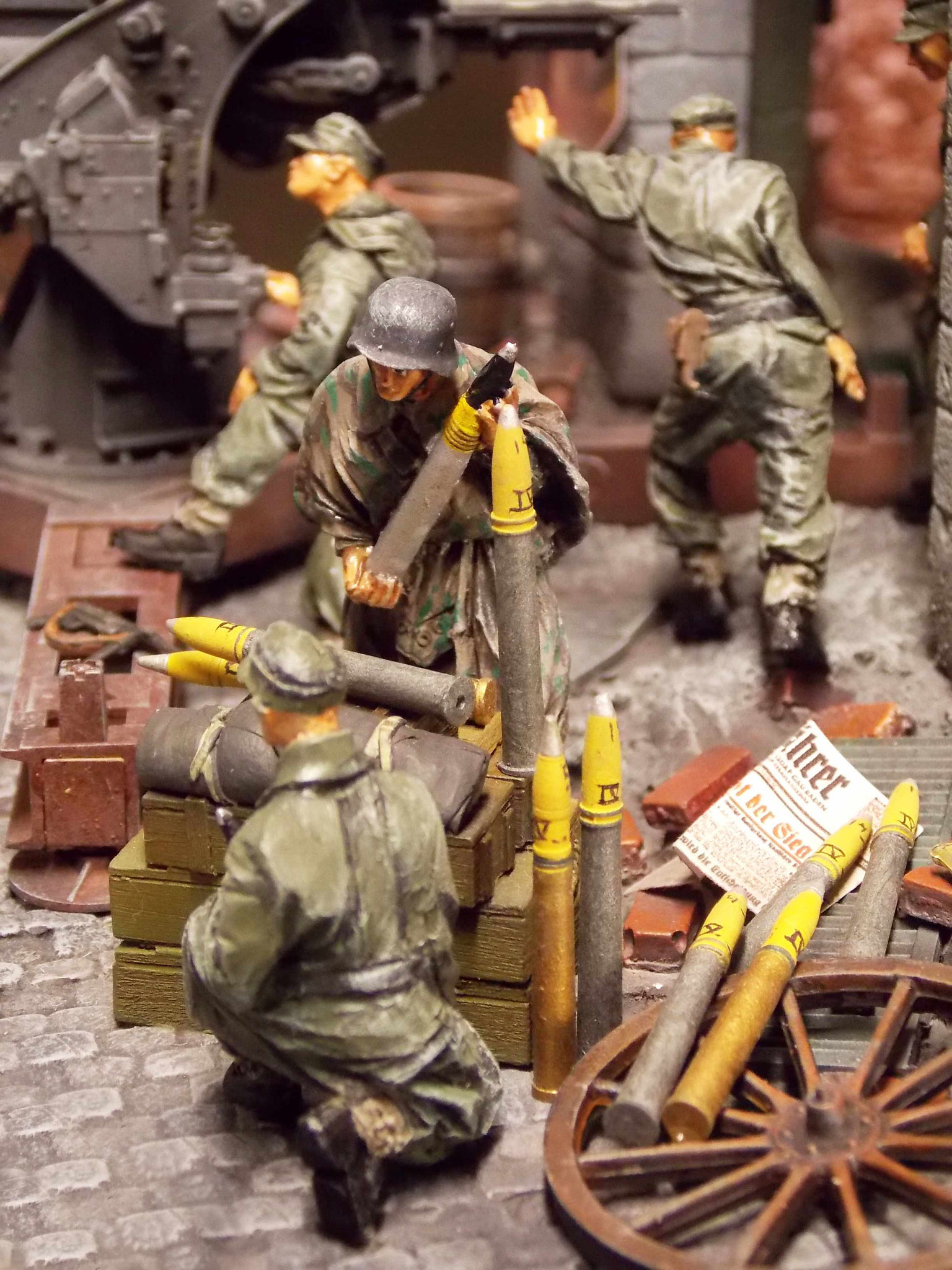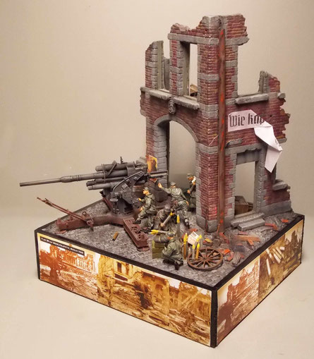 Neben der passenden Munition- und Kisten (die aus der Reservekiste kommt und als Letztes positioniert wird) kommt das der Zeit entsprechende Transparent "Wir kapitulieren nie" an die Häuserruine. Der noch dominierende Sockel wird mit einer Sammlung von Originalbildern ergänzt. Als Figuren ist die wunderbare Bedienungsmannschaft von AC Models im Anmarsch, die eine Hilterjugendgruppe im Erdkampf am Geschütz darstellt (teuer, aber passt perfekt!).