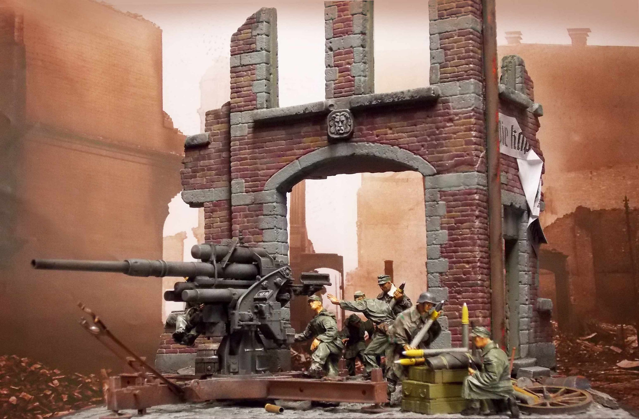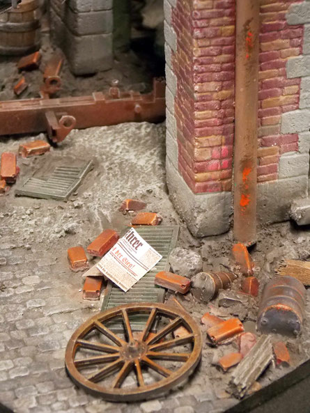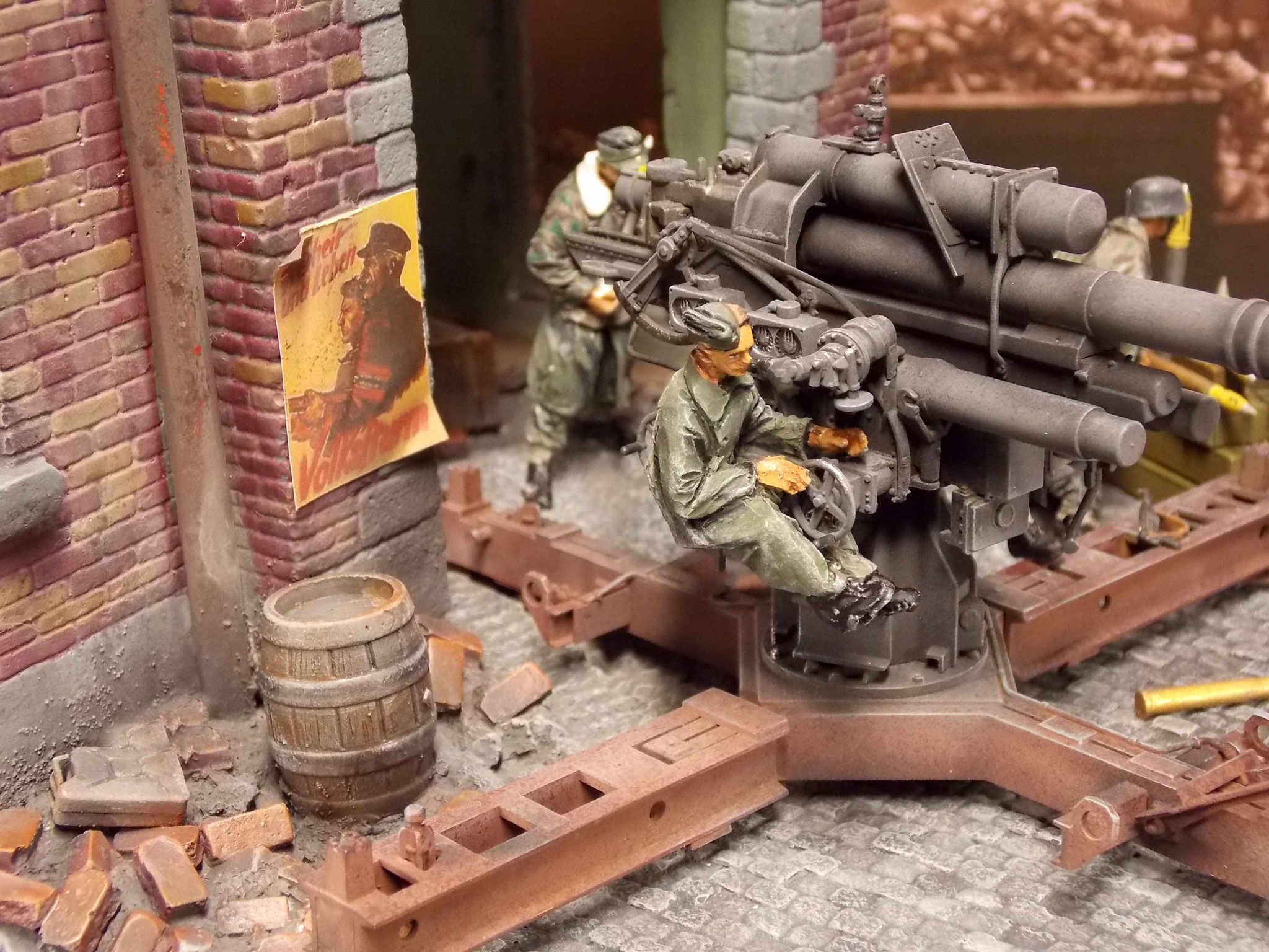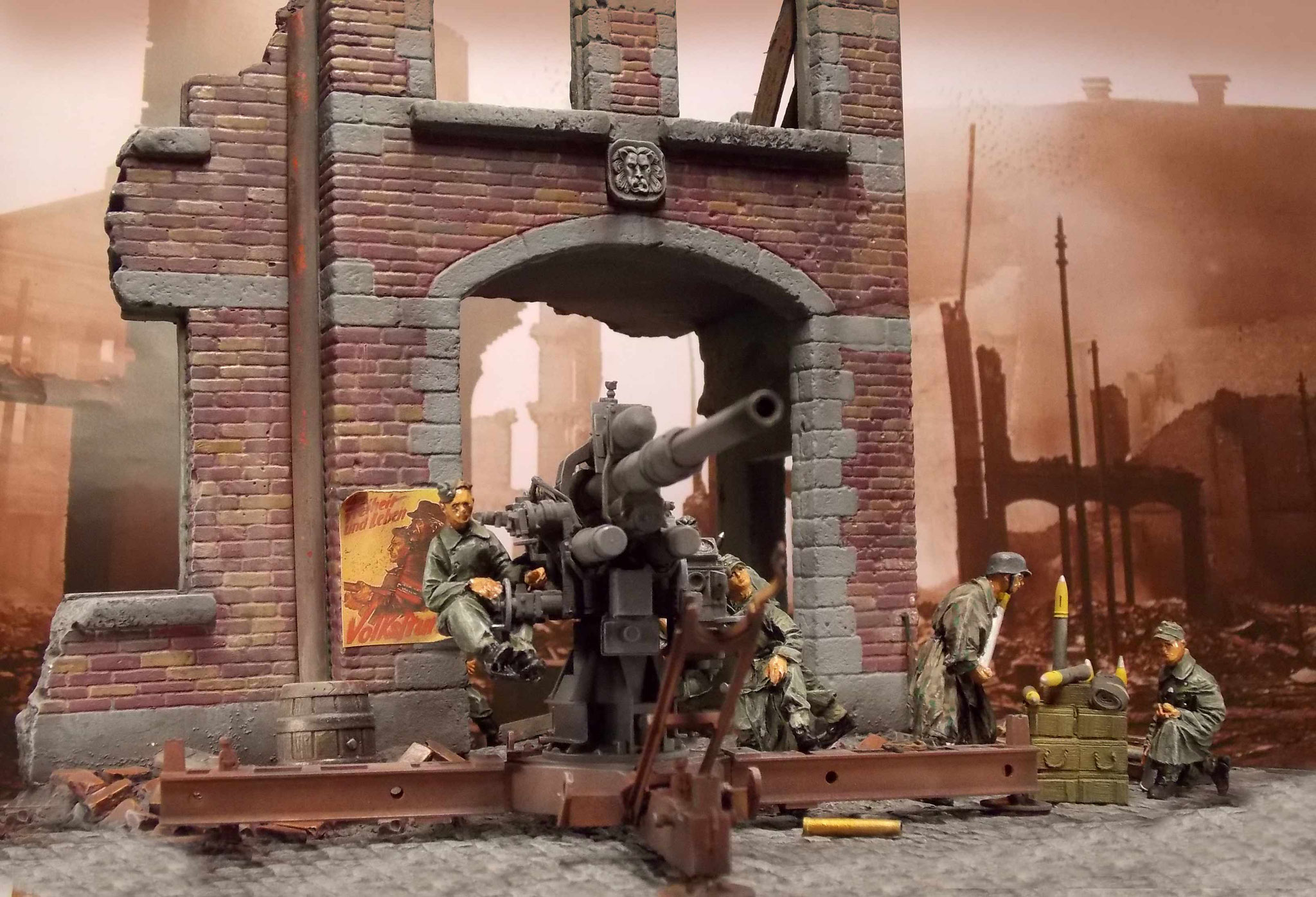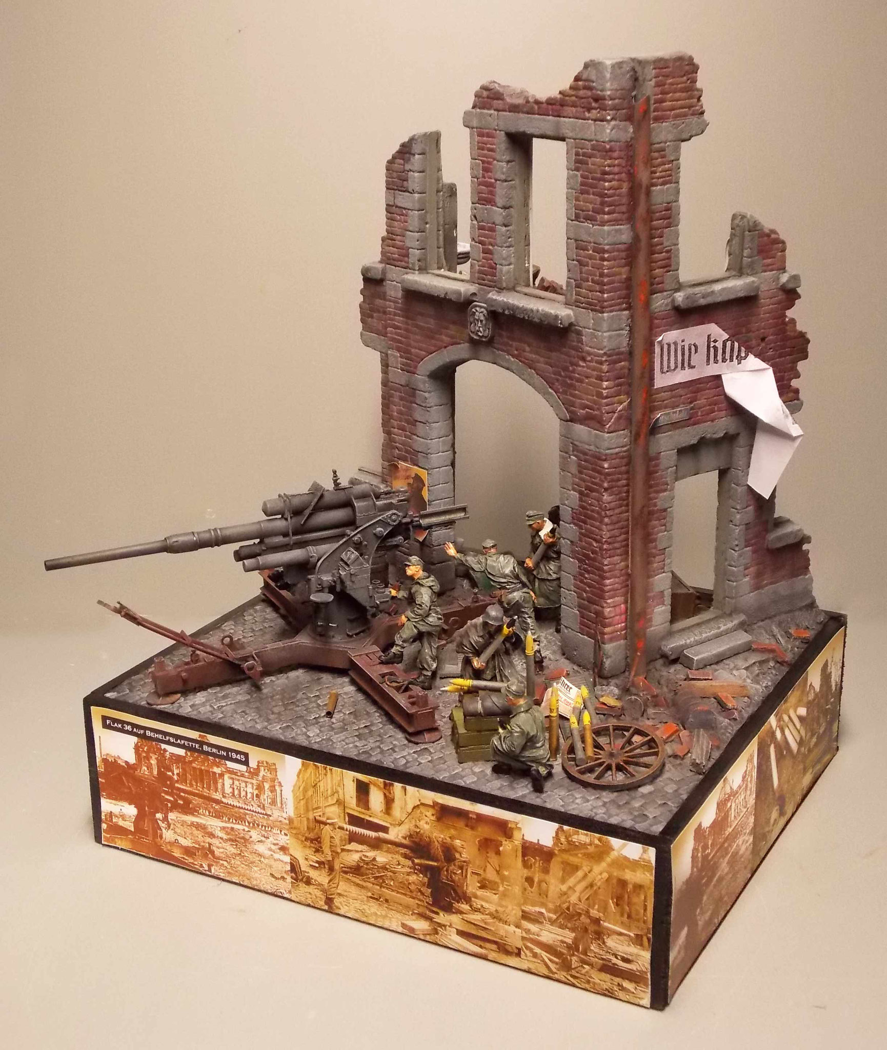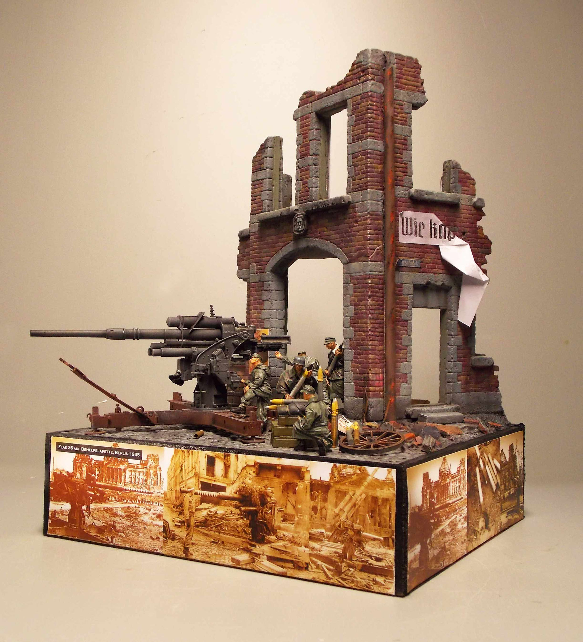 Neben der passenden Munition- und Kisten (die aus der Reservekiste kommt und als Letztes positioniert wird) kommt das der Zeit entsprechende Transparent "Wir kapitulieren nie" an die Häuserruine. Der noch dominierende Sockel wird mit einer Sammlung von Originalbildern ergänzt. Als Figuren ist die wunderbare Bedienungsmannschaft von AC Models im Anmarsch, die eine Hilterjugendgruppe im Erdkampf am Geschütz darstellt (teuer, aber passt perfekt!).