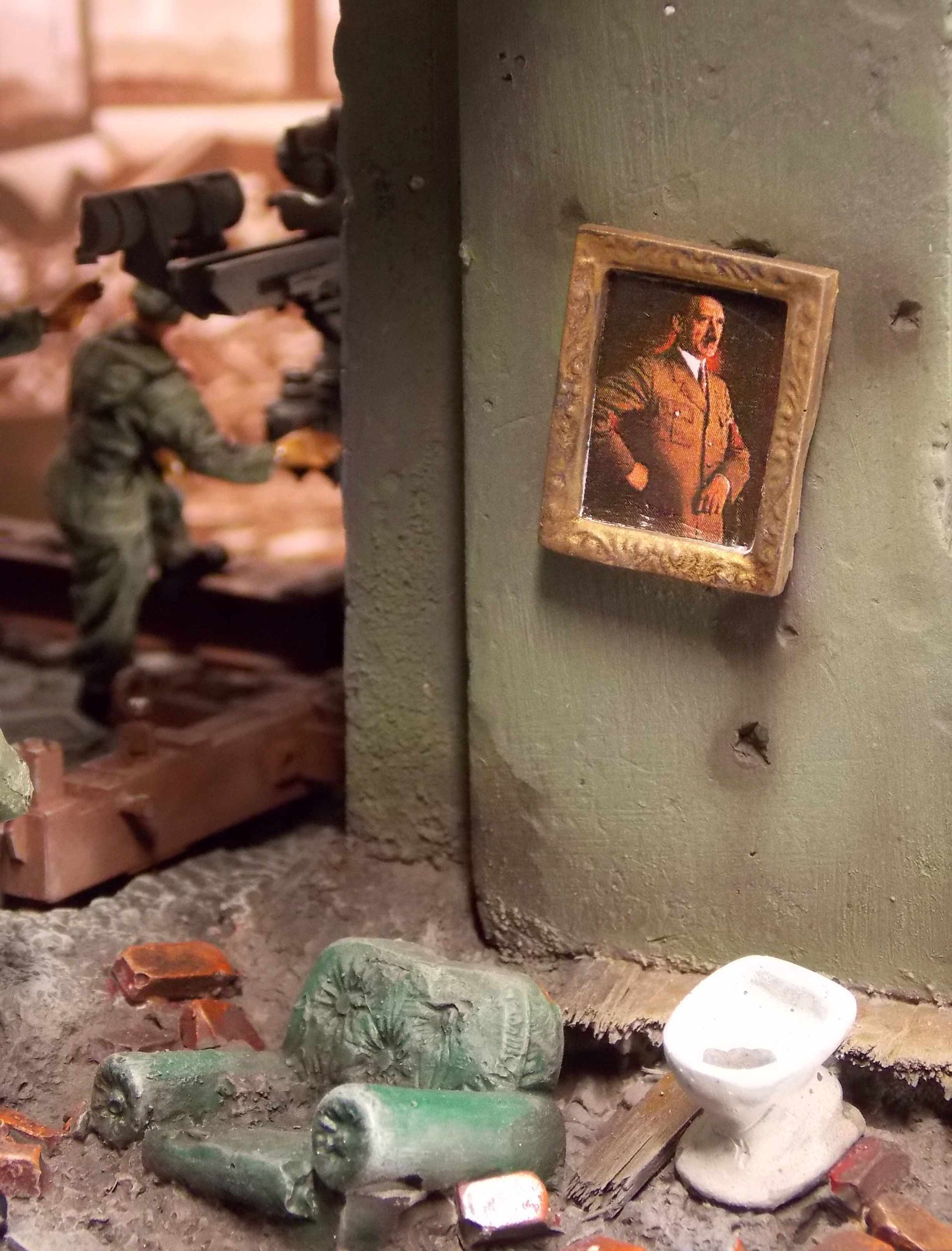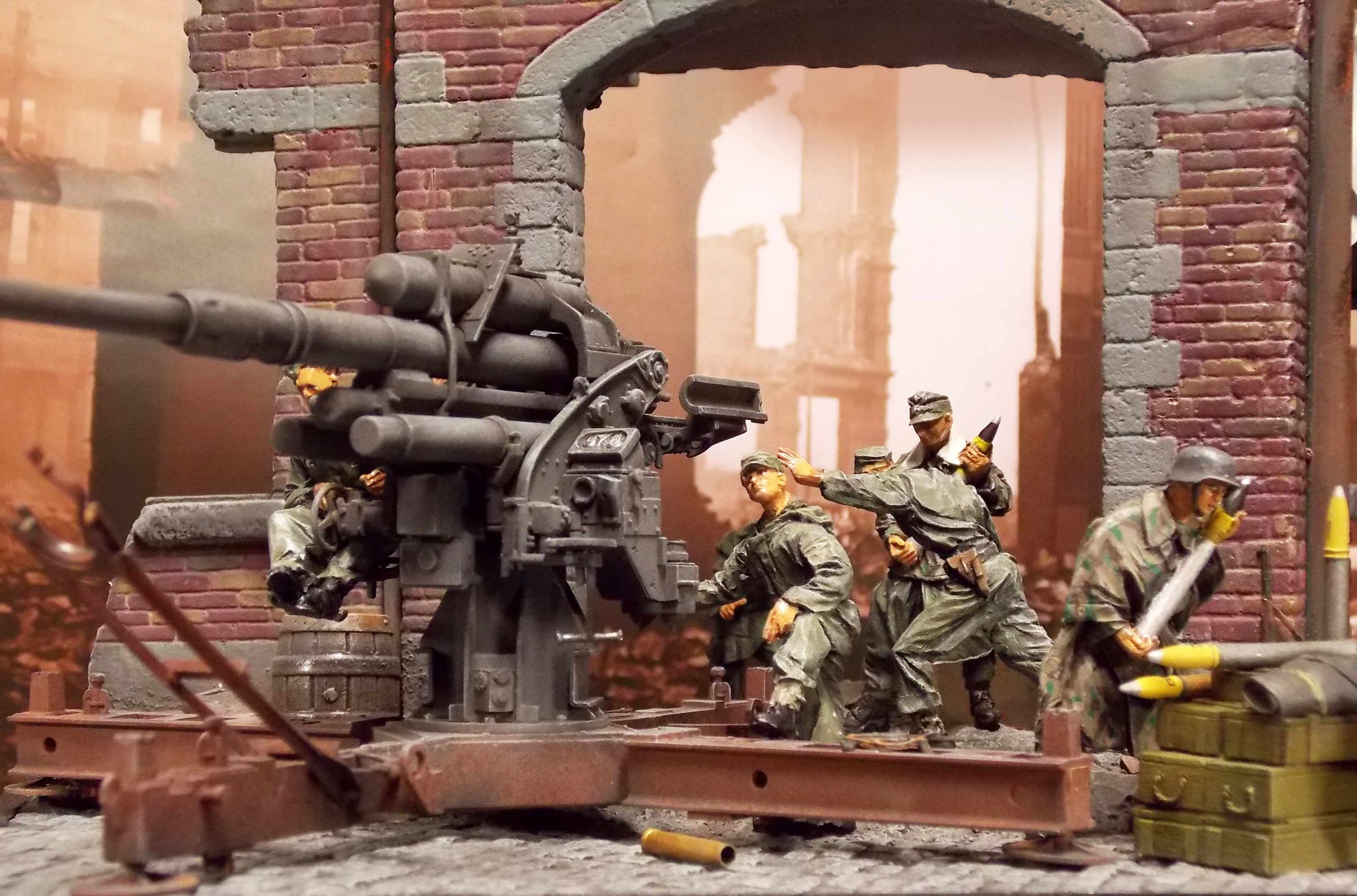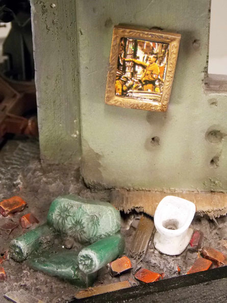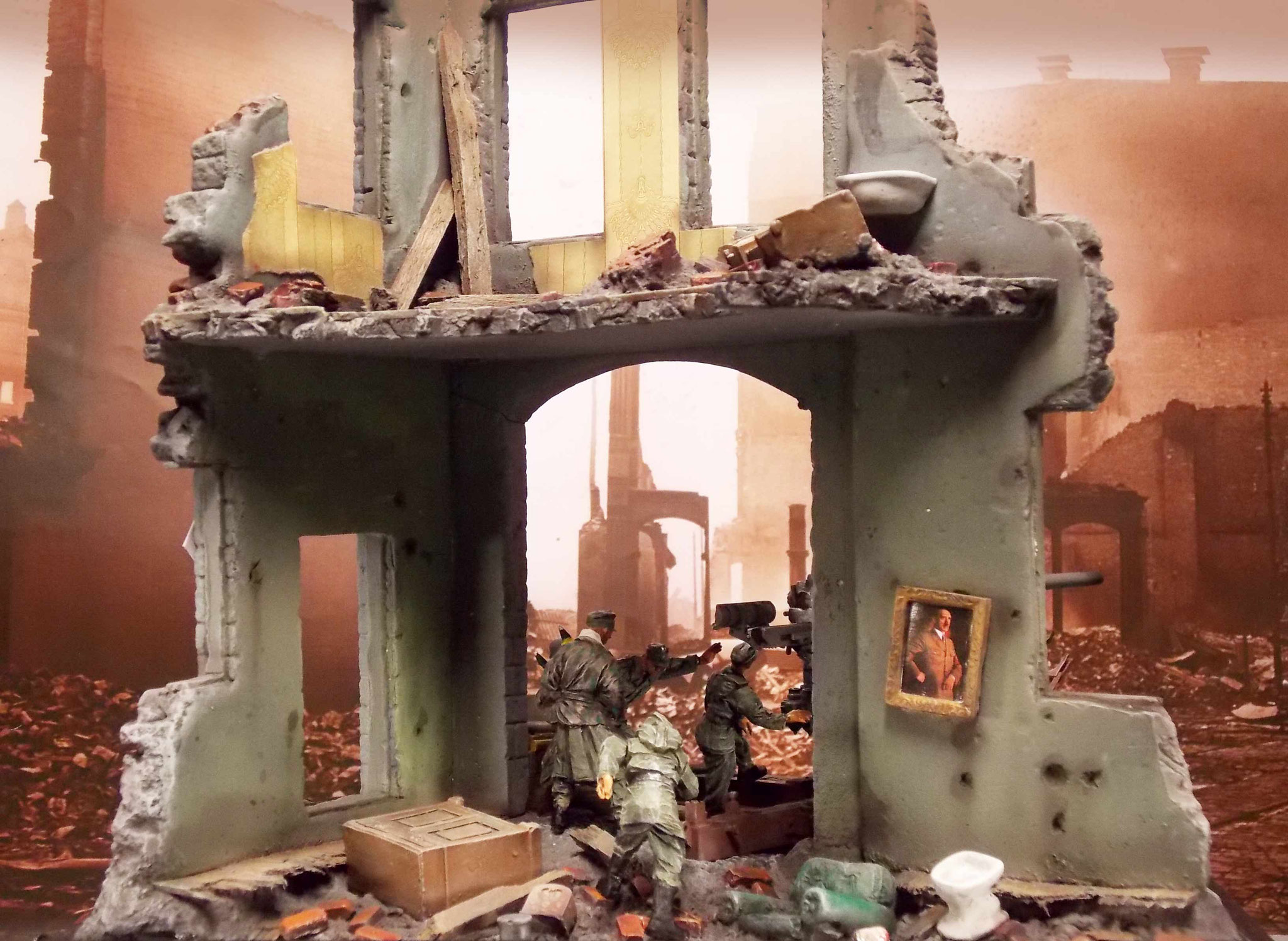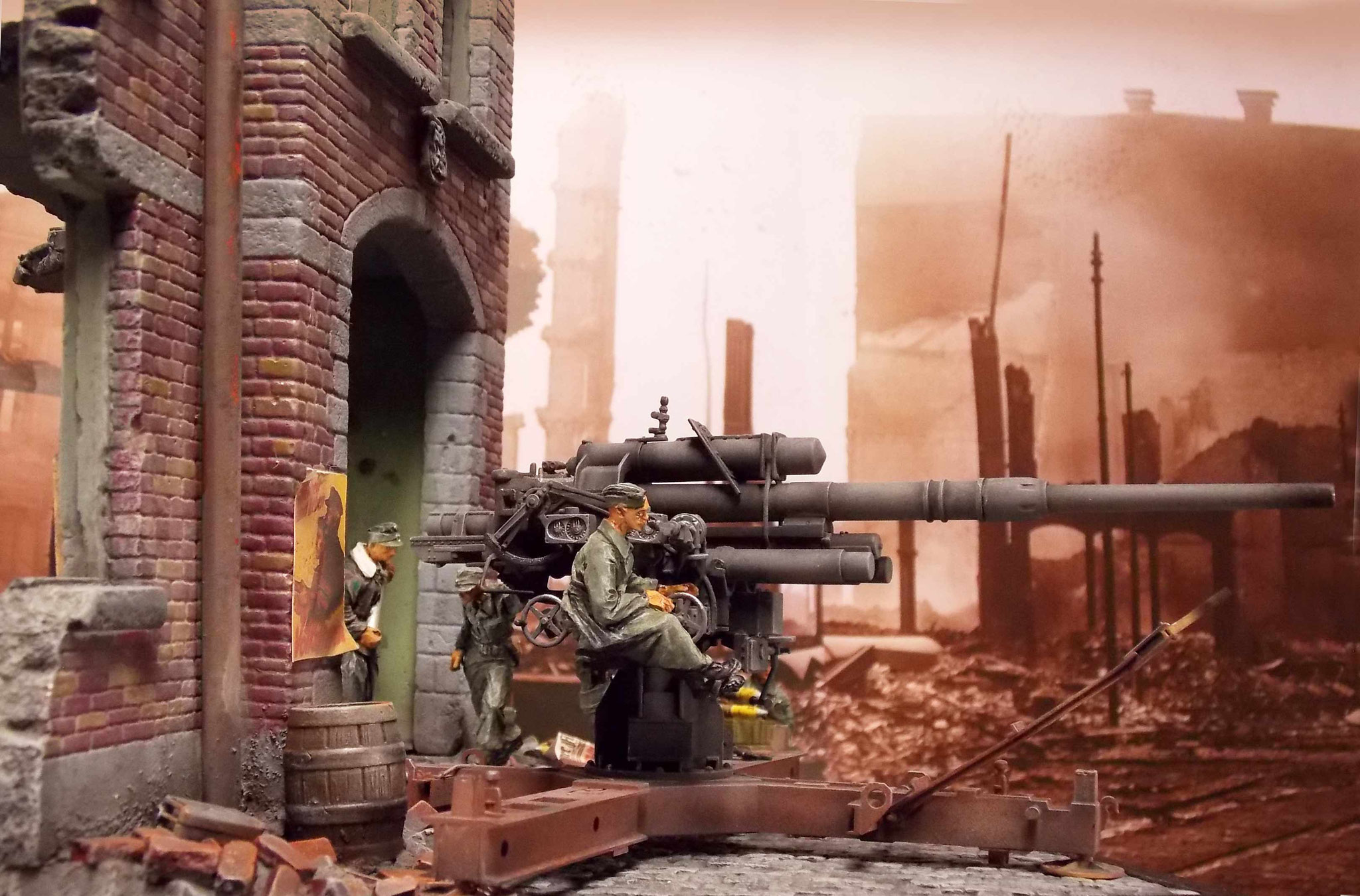 Neben der passenden Munition- und Kisten (die aus der Reservekiste kommt und als Letztes positioniert wird) kommt das der Zeit entsprechende Transparent "Wir kapitulieren nie" an die Häuserruine. Der noch dominierende Sockel wird mit einer Sammlung von Originalbildern ergänzt. Als Figuren ist die wunderbare Bedienungsmannschaft von AC Models im Anmarsch, die eine Hilterjugendgruppe im Erdkampf am Geschütz darstellt (teuer, aber passt perfekt!).
