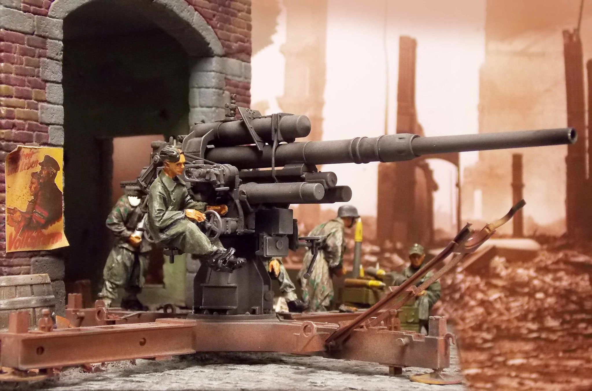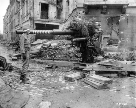 Flak 36 auf Behelfslafette - Berlin 1945: um die zahlreichen ortsfesten Flakgeschütze, die auf Betonsockeln lafettiert waren, für den Endkampf um Berlin einfach beweglich zu machen, wurden die fehlenden Lafetten durch eine primitive Konstruktion aus regulären Eisenträgern ersetzt. So konnten die 8,8-Geschütze im Erdeinsatz an strategisch, wichtigen Punkten der Stadt aufgebaut werden. Ihnen fehlte natürlich als klassische Flakgeschütze das typische Schutzschild der Feldausführung. Auch der wehrmachtsgraue Anstrich der Geschütze setzte sich von der später hinzugefügten Lafette deutlich ab. (Hier ein GI im Herbst 1945 bei der Begutachtung eines dieser Hybriden).