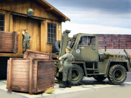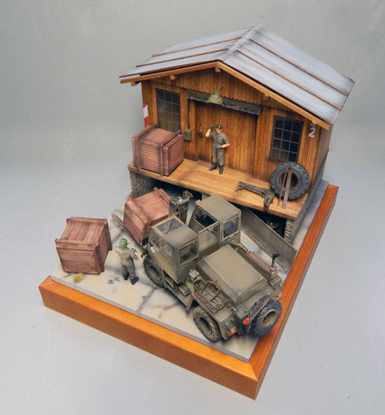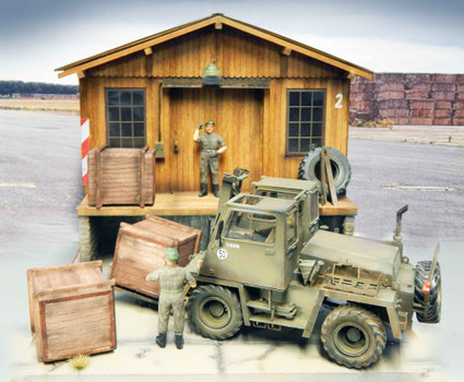 Zuerst wird die eigentlich Diorama-Base koloriert und mit ein paar Accessoires versehen. Der Lagerschuppen steht nun auf einem strukturierten Mauerwerk. Dach und Seitenwände weisen nun ein natürliches Fabspiel auf, das die Bretterstruktur betont und Tiefen und Höhen hat. Über dem Eingangstor nun die obligatorische Lampe. Die Betonfläche im Vordergrund bietet nun genug Platz für das FUG 2,5to und die beiden Figuren.