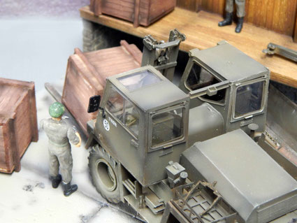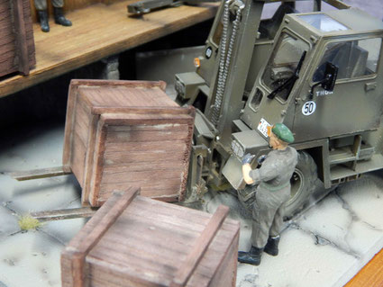 Das fertig kolorierte Modell findet mit allen seinen Accesoires Platz auf der Diorama-Base. Hier kann e sich an den großen Kisten austoben.