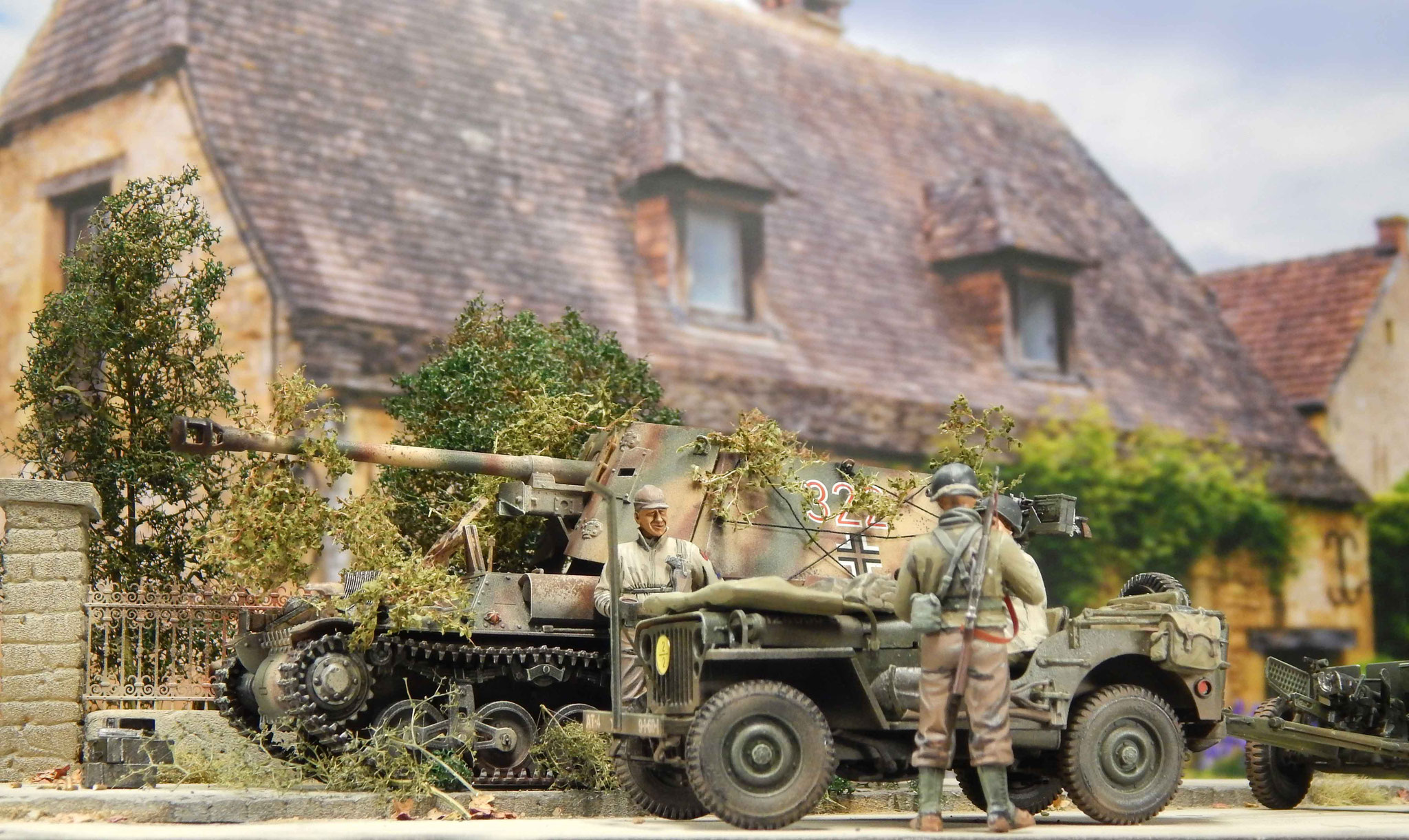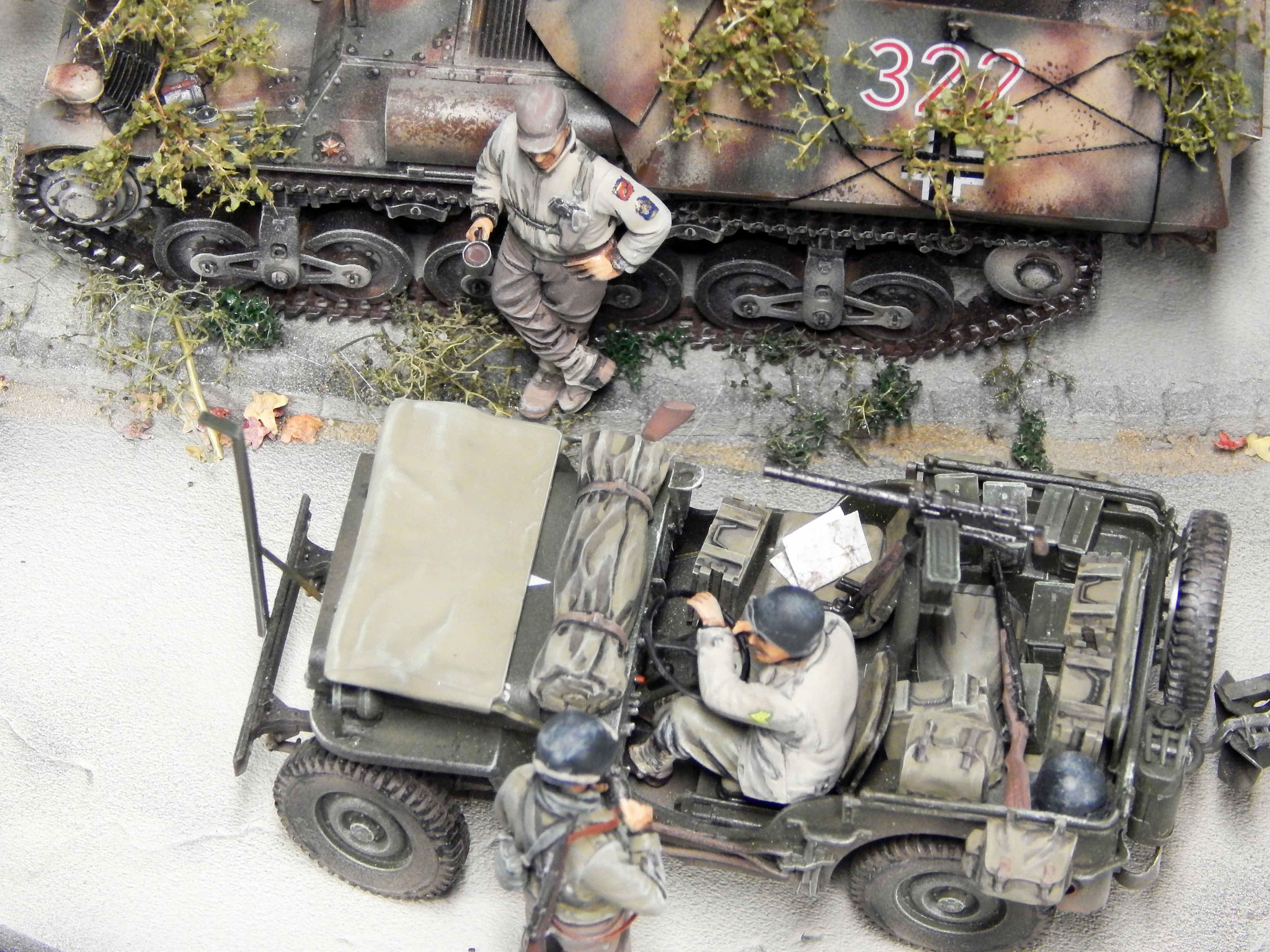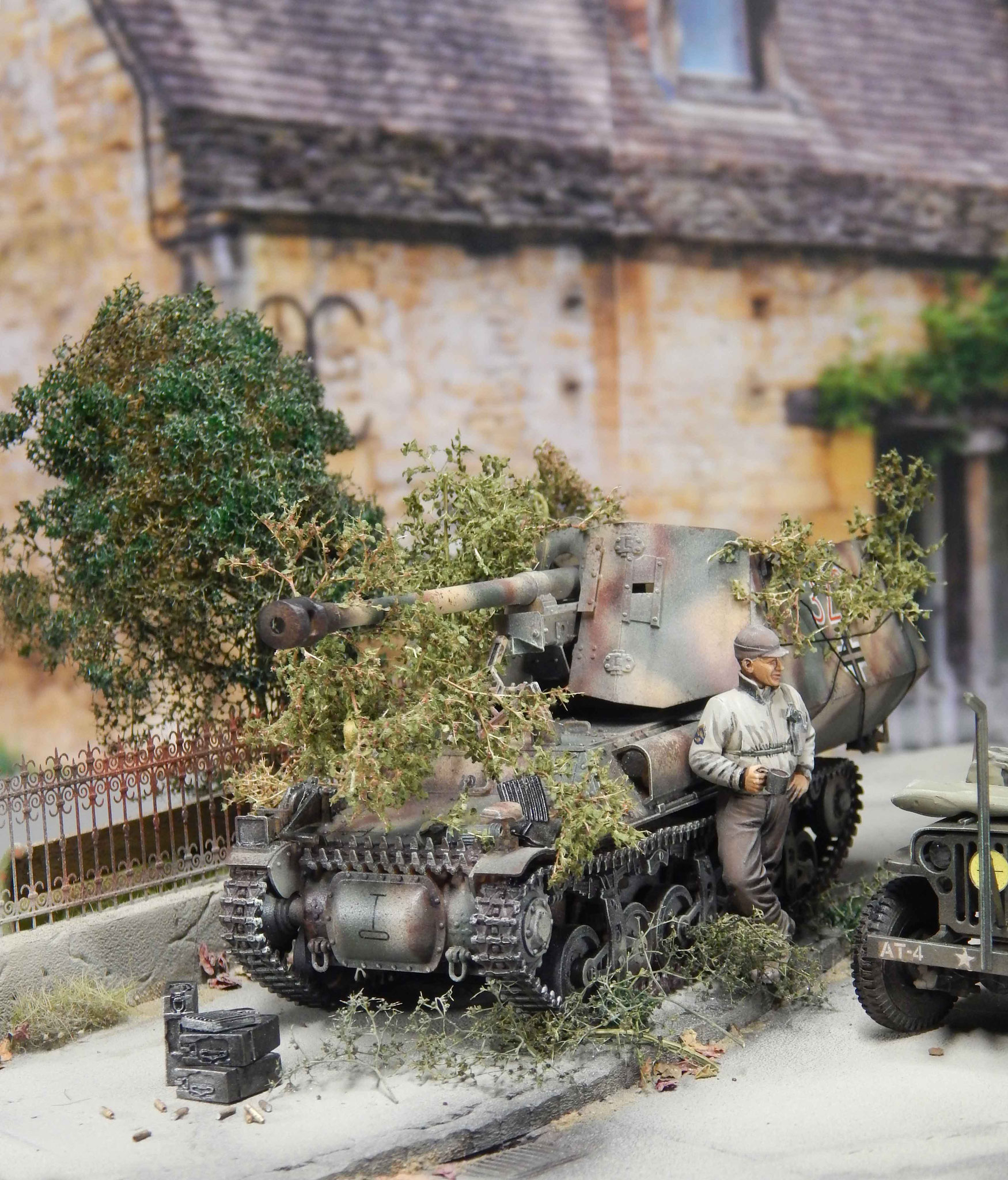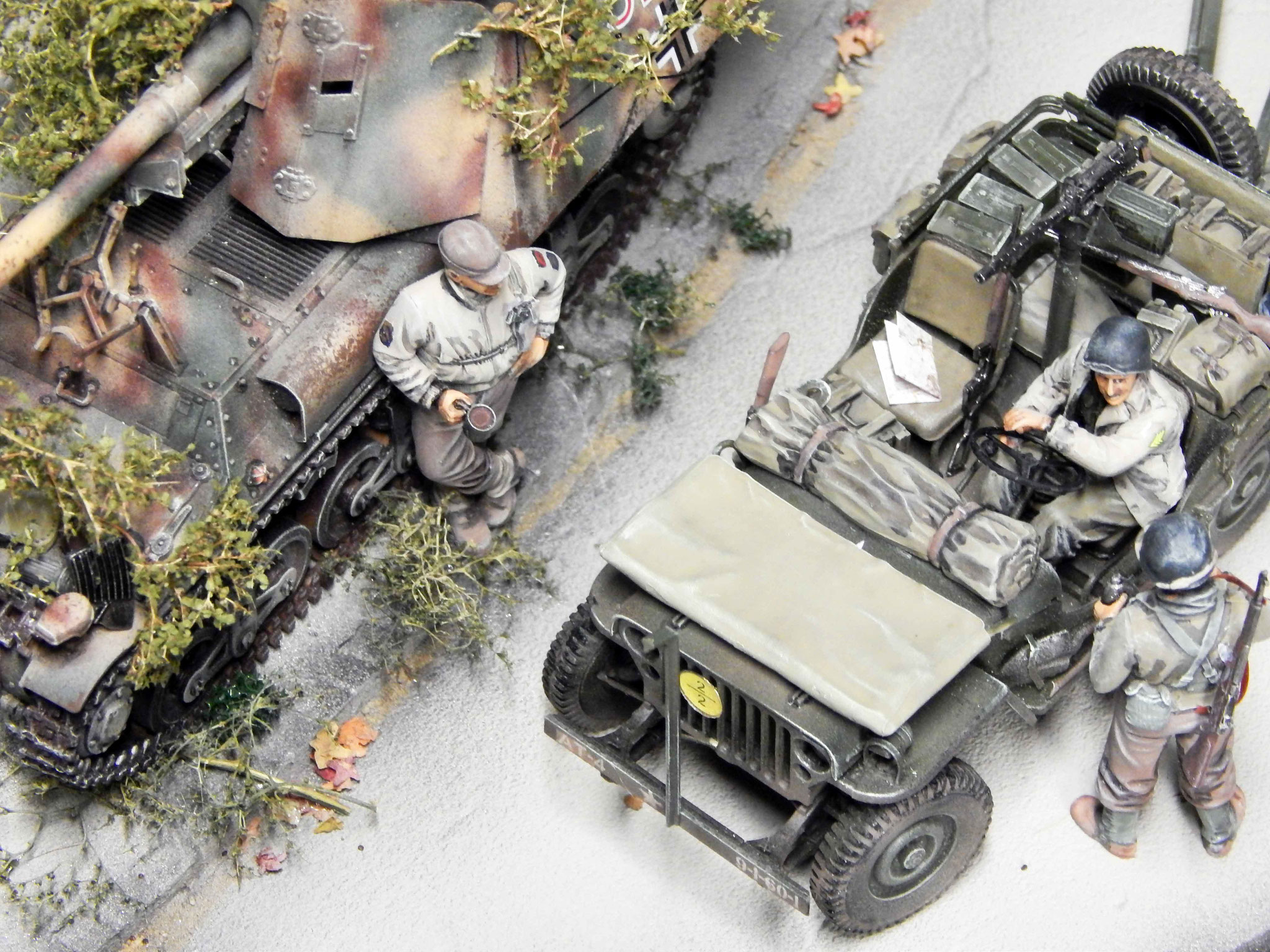 Die GI-Figuren von Royal Models in extrem natürlicher cooler und entspannter Haltung bringen den Größenvergleich vor das verlassene deutsche Fahrzeug. Hier sieht man wie klein der Marder I war.
