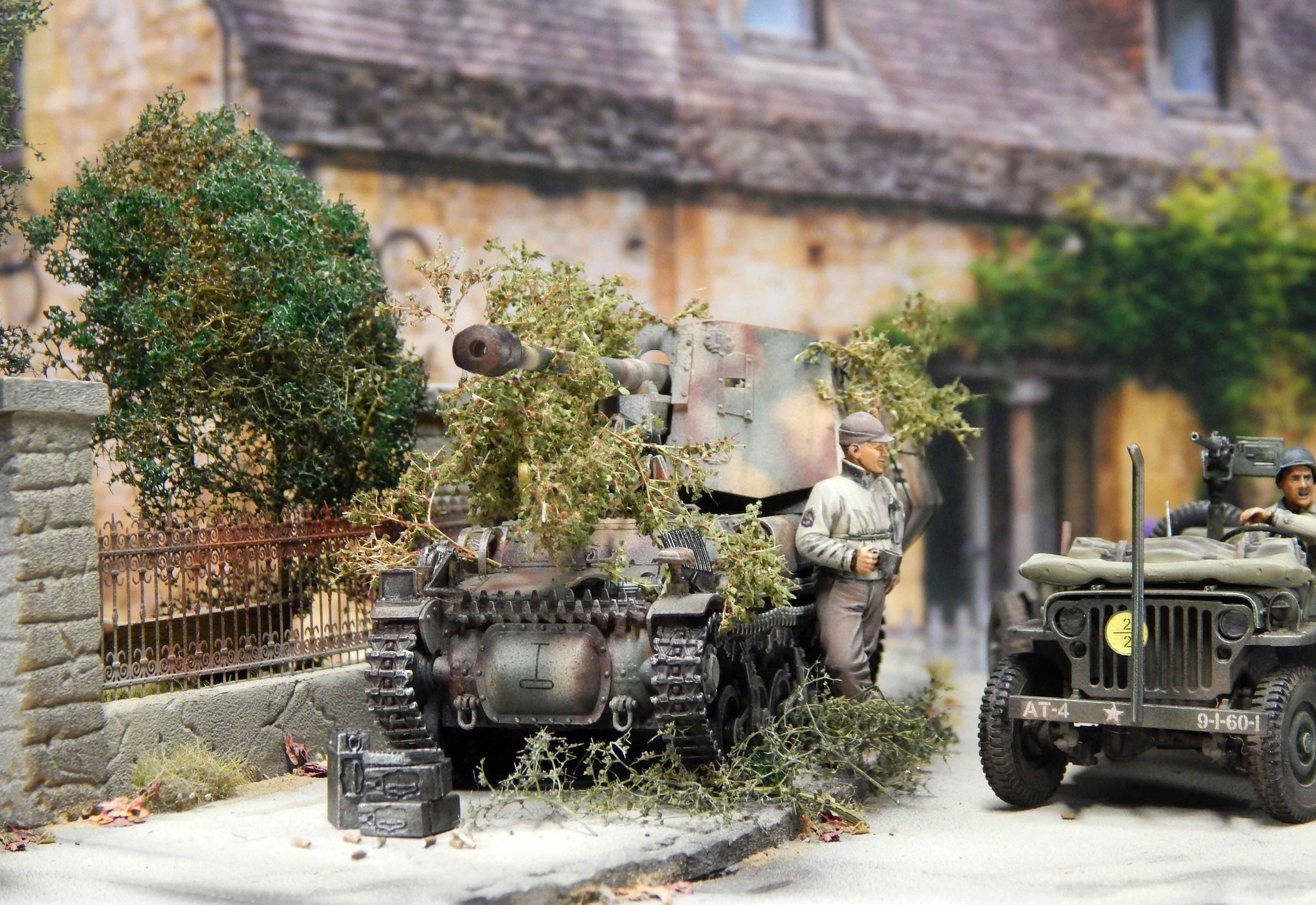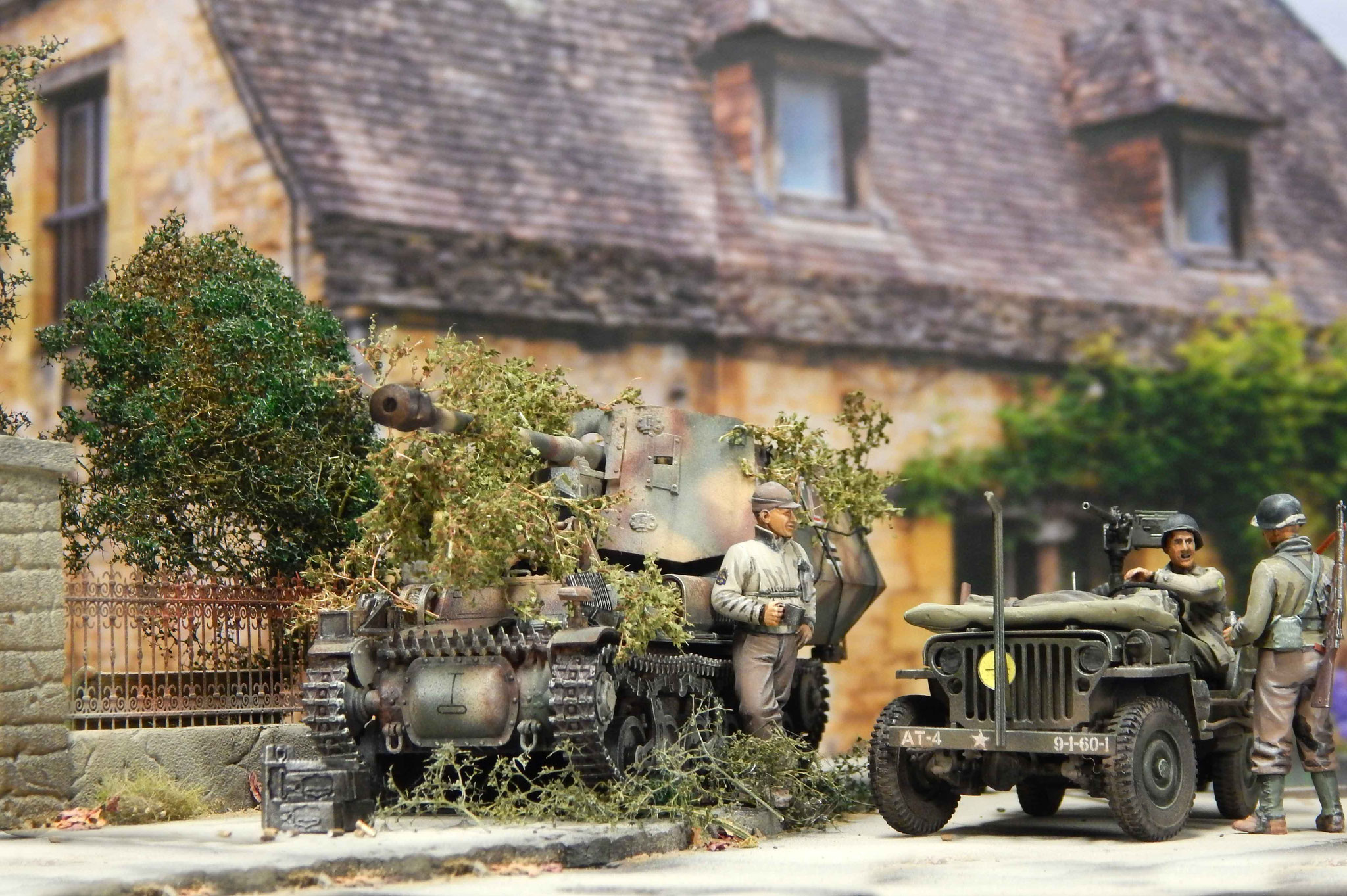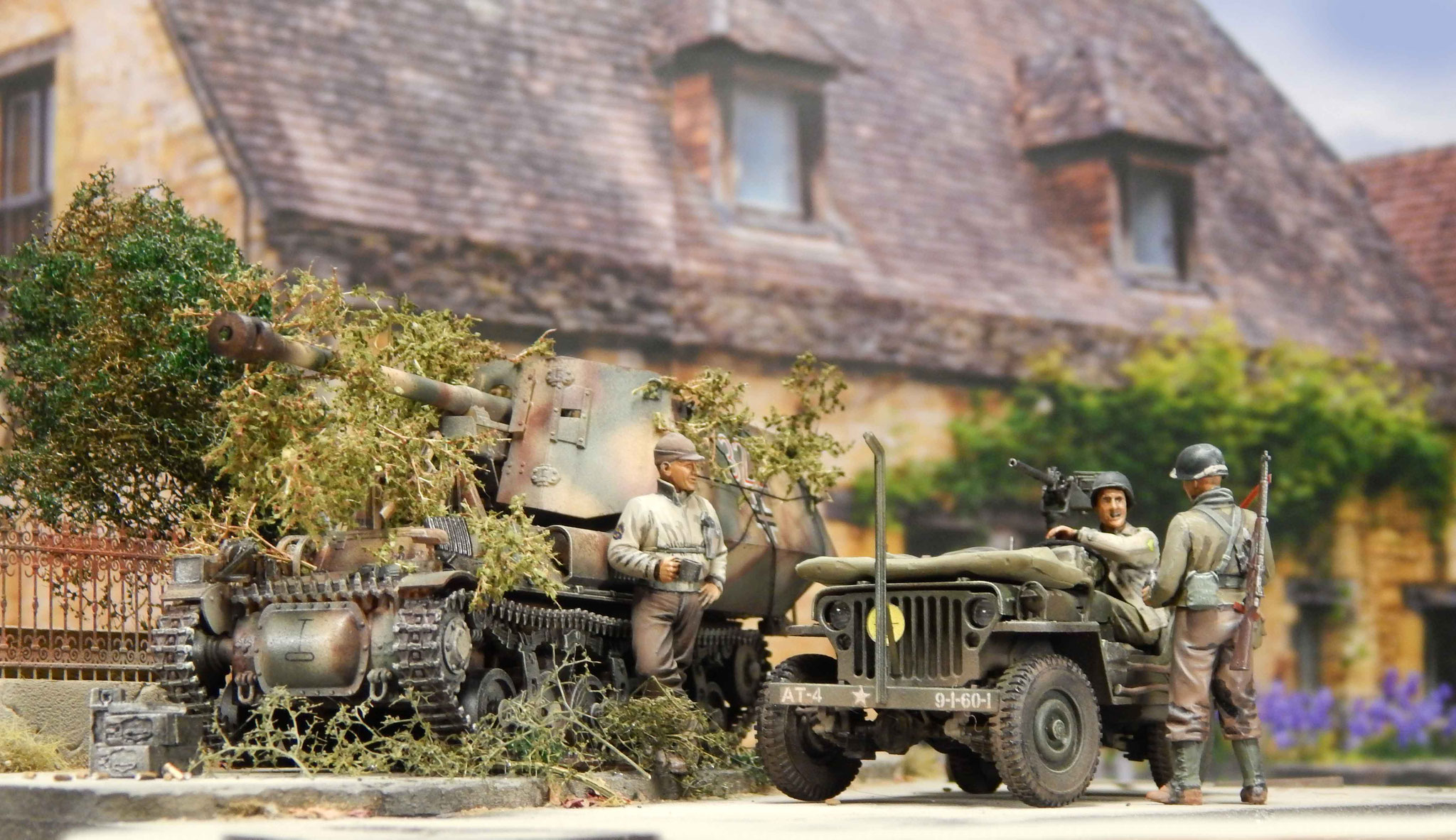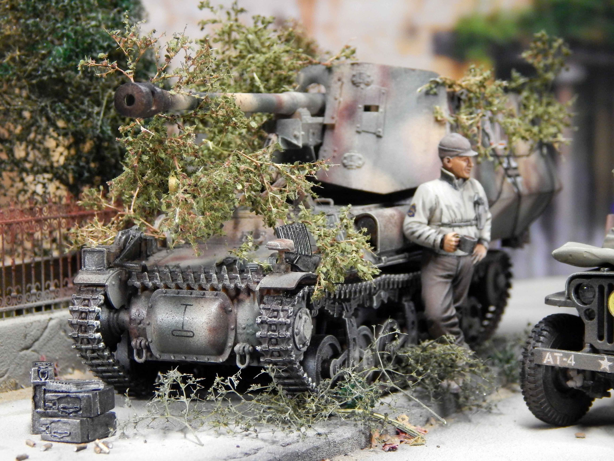 Die GI-Figuren von Royal Models in extrem natürlicher cooler und entspannter Haltung bringen den Größenvergleich vor das verlassene deutsche Fahrzeug. Hier sieht man wie klein der Marder I war.