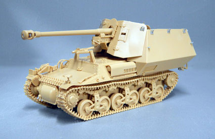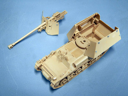 Der Rohbau kann in zwei Baugruppen, Fahrgestell mit Aufbau und die Pak 40, angelegt werden. Auch die Munition dazu wird zuerst separat gehalten. Mit im Bausatz sind zwei schöne deutsche Panzerjäger-Figuren, die aber für das Diorama des Auftragsgebers nicht benötigt werden.