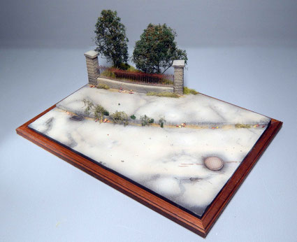 Um dem Originalbild nahe zu kommen, dient eine kleine Basis in A4-Größe für die Aufnahme der beiden Fahrzeuge. Die auf dem Bild zu sehende Gartenmauer mit den dahinterliegenden Büschen und die lange Kurve der Straße mit dem Bürgersteig bieten nun Platz für die Akteure.