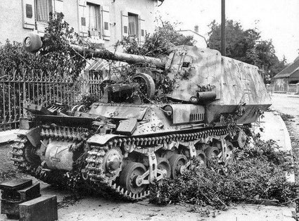 Der Marder I Panzerjäger war bei der Wehrmacht eine aus der Not geborene Lösung, um die in Frankreich 1940 erbeuteten Panzerfahrgestelle noch zu nutzen. Dazu wurde unter dem Baustab Becker in Paris ab 1943 hier in diesem Fall die leichten Lorraine Kettenschlepper mit einem dünnen, gepanzerten Aufbau versehen und mit der modernen und effektiven Pak 40 versehen. Damit war das nur gering motorisierte Fahrgestell zwar hoffnungslos überfordert, aber so zumindest die Panzerabwehrkanonen mobiler als zuvor. Die Marder I kamen vornehmlich in Frankreich zum Einsatz, hier bei der neu aufgestellten 21. Panzerdivision. Einige Fahrzeuge wurden ebenso an die Ostfront versendet. Die Originalaufnahme zeigt einen Marder I von seiner Besatzung verlassen an der Avenue Aristide Briand in Vesoul im September 1944 (Quelle Panzerwrecks 21). Das Bild ist auch die Vorlage für den aktuellen Tamiya-Bausatz mit den entsprechenden Kennzeichen. Beachte hier besonders das ungewöhnliche Balkenkreuz. Das Fahrzeug ist hier verlassen mit 2cm Flakmunition im Vordergrund zu sehen und er typischen Tarnung durch Zweige in dieser Phase des Krieges.