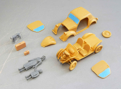 Im Rohbau sieht man hier Chassis, Karosserie, Türen, Haube etc noch getrennt. Um das Modell etwas interessanter zu präsentieren hat die Vorderachse einen leichten Lenkeinschlag. Die Scheiben sind mit Maskierfolie abgeklebt und schon eingesetzt.