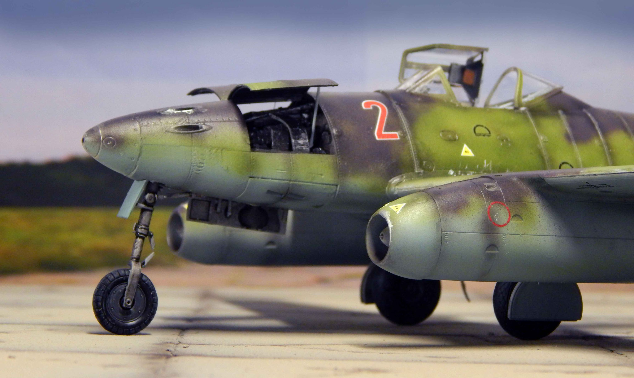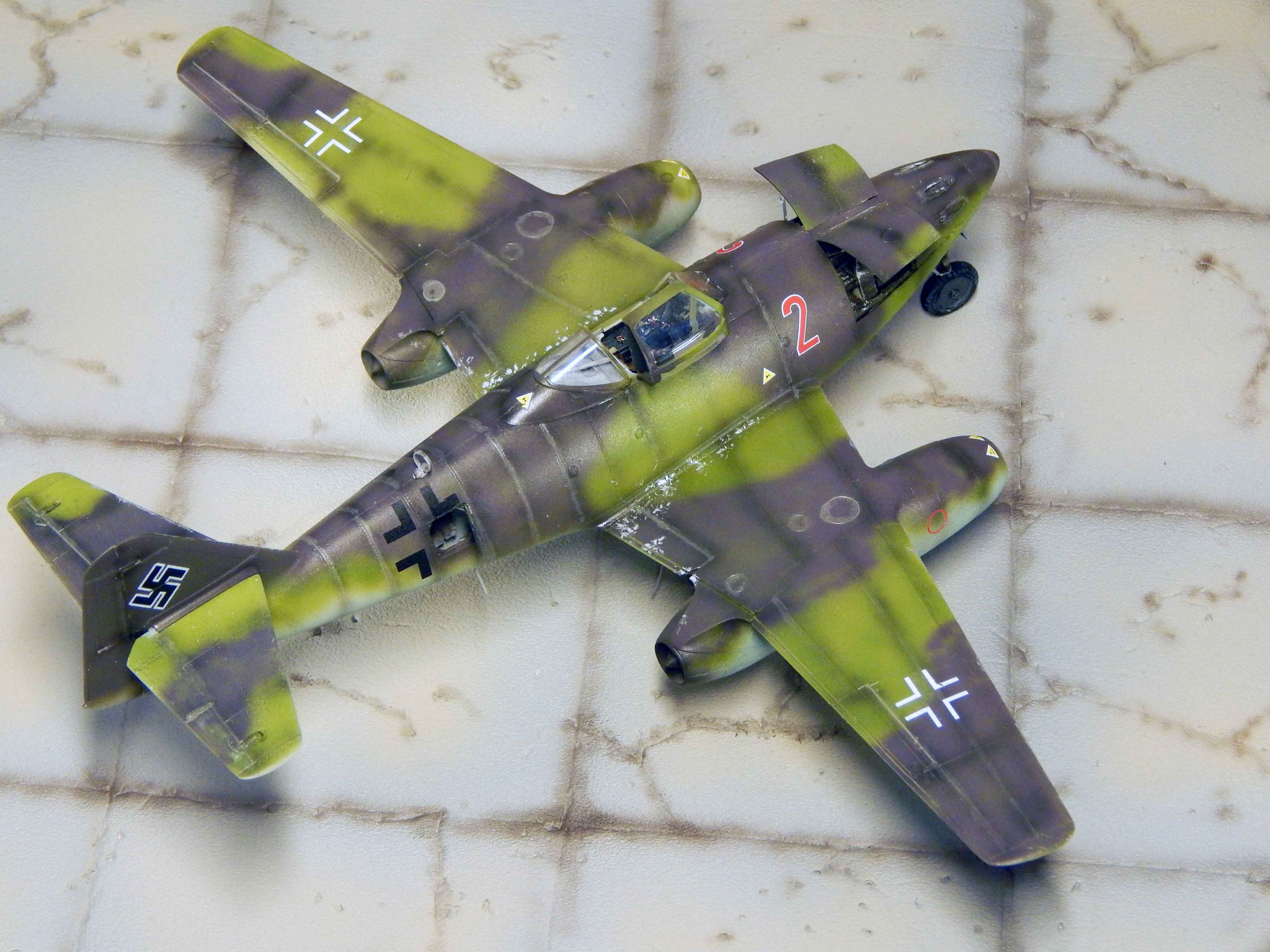 Das fertige Modell zeigt die Me 262 in Start- und Wartungsposition mit geöffnetem Cockpit, Wartungsklappen etc. Das Modell steht dank des Buggewichts sicher auf seinem Fahrwerk mit dem typisch nach vorne geneigten Bugfahrwerk.