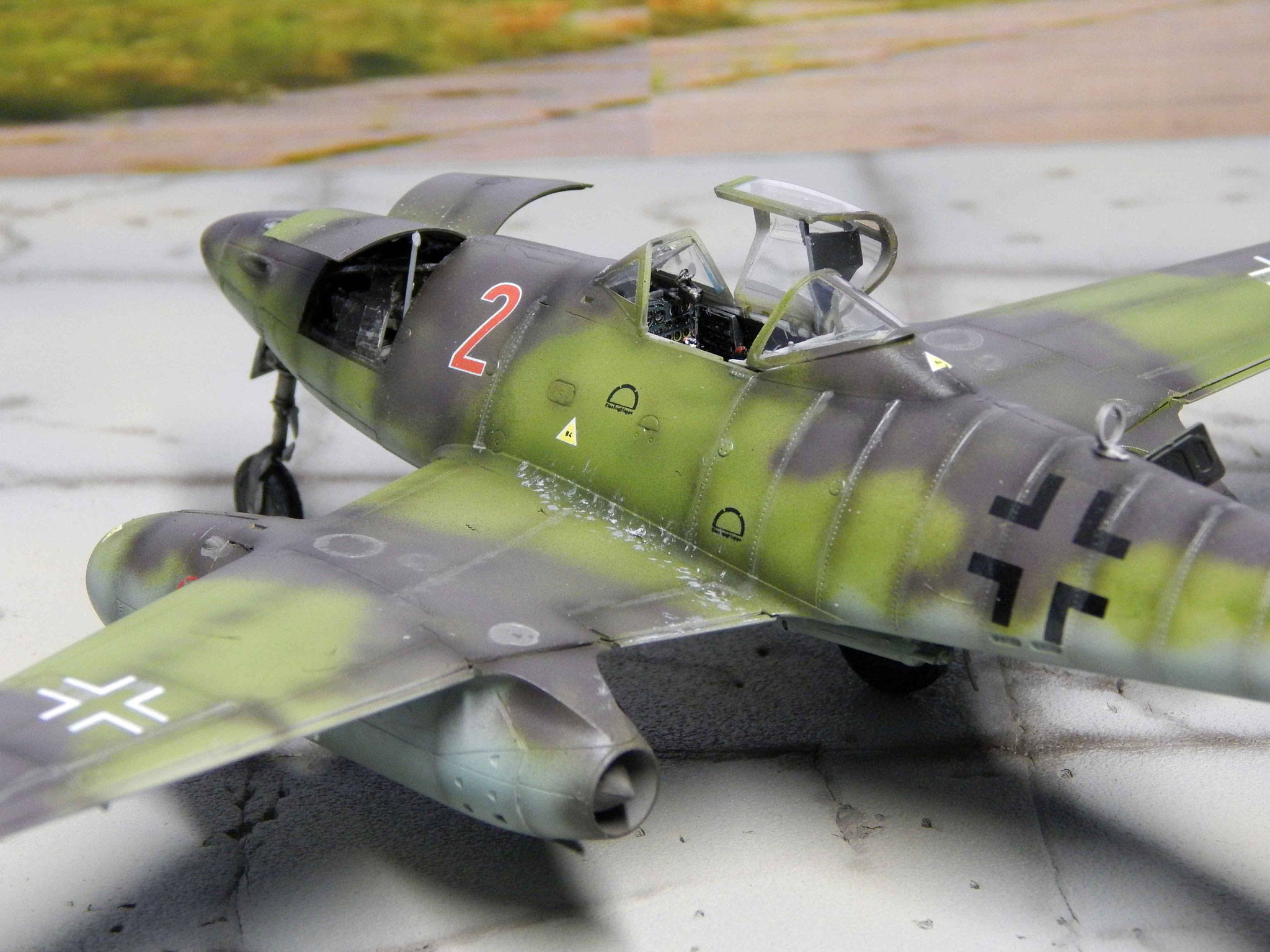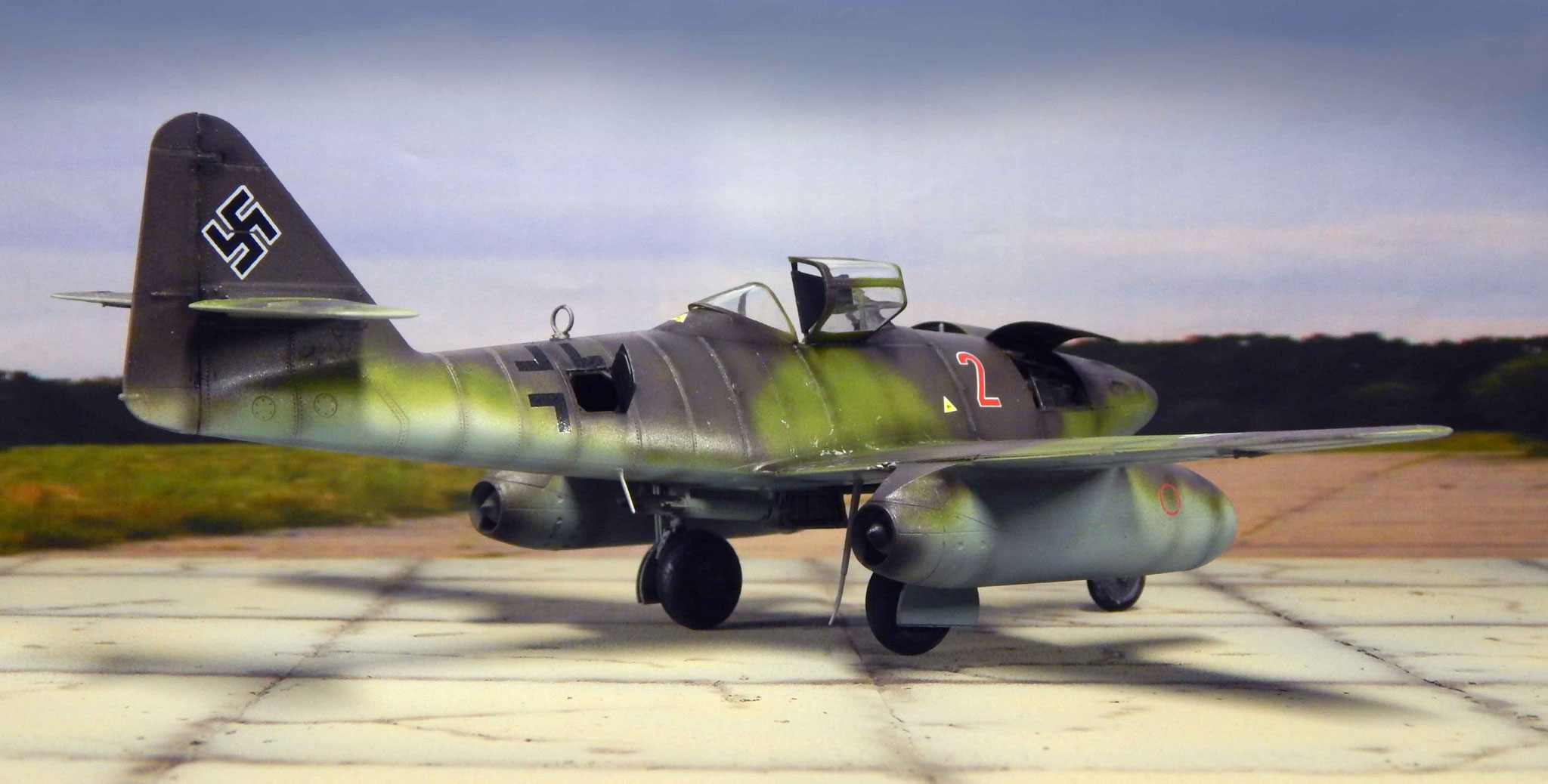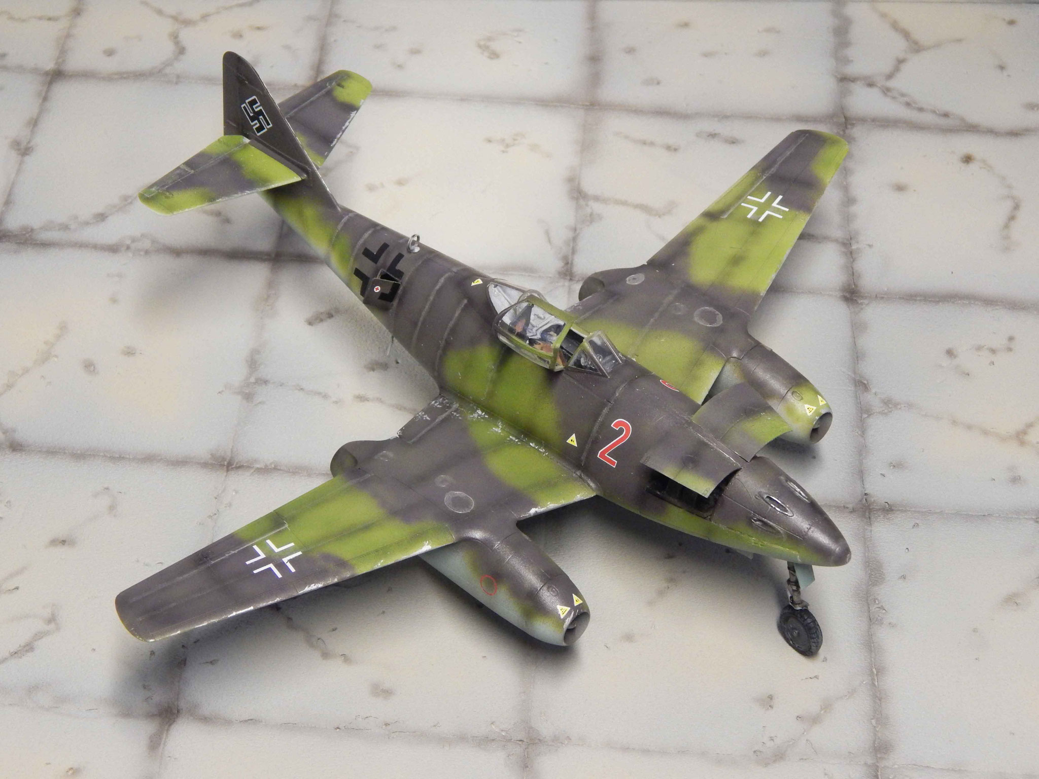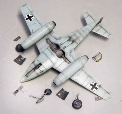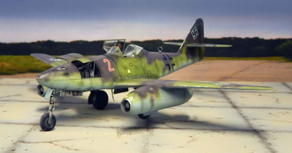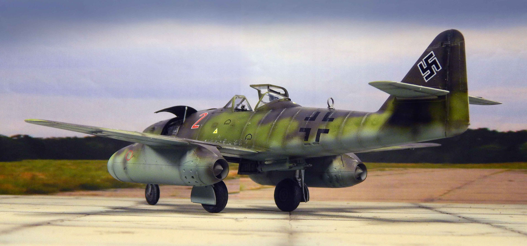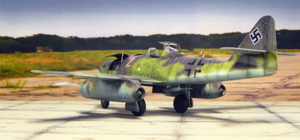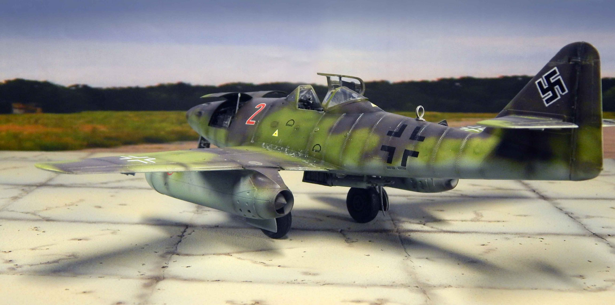 Von oben zeigt sich der Tarnverlauf als sehr effektiv, verwischt er doch die klassischen Porportionen der Me 262 deutlich. Dezente Balkenkreuze und nur die große Maschinennummer reduzieren die Auffälligkeiten, auch aus der Luft.