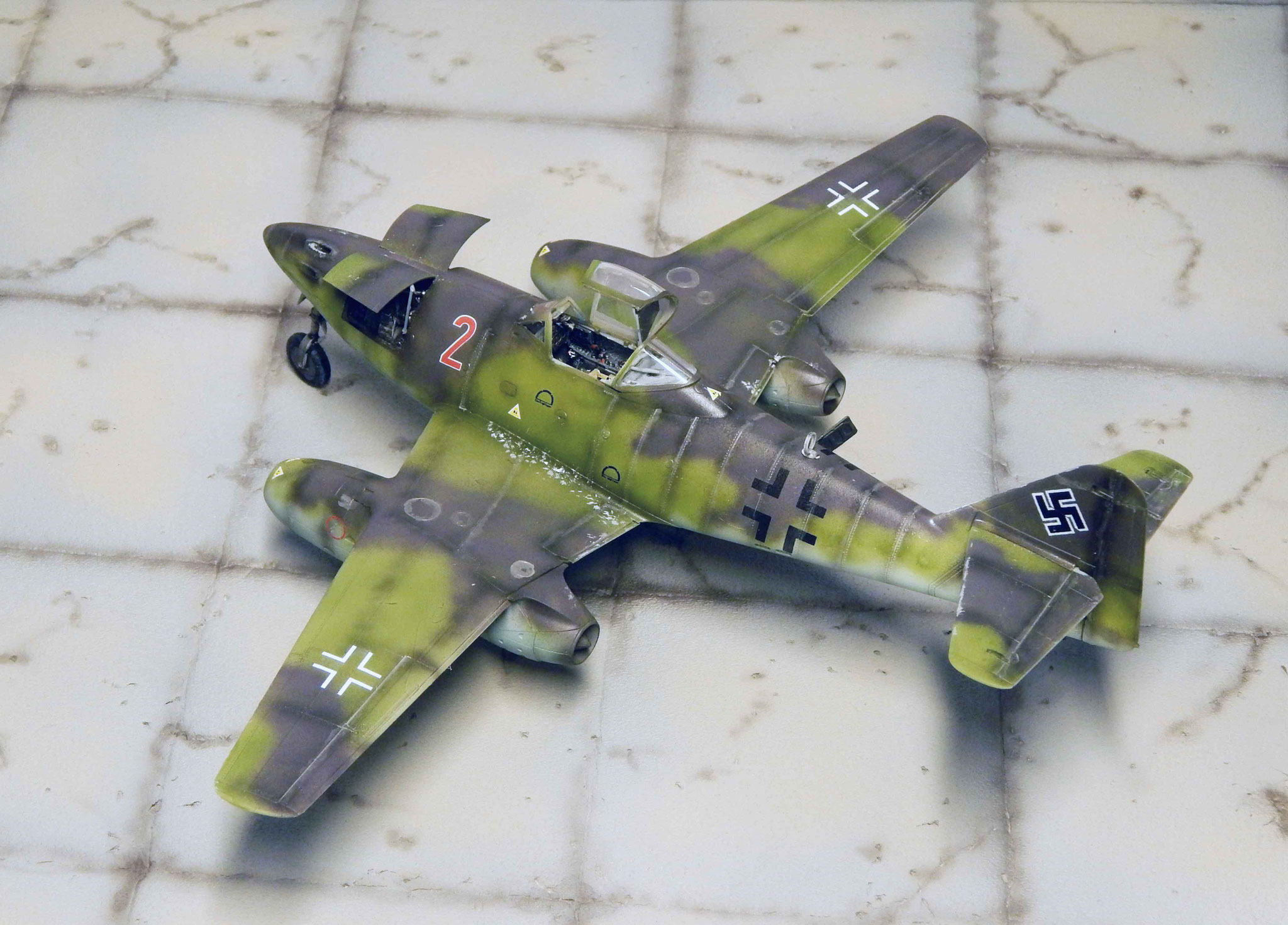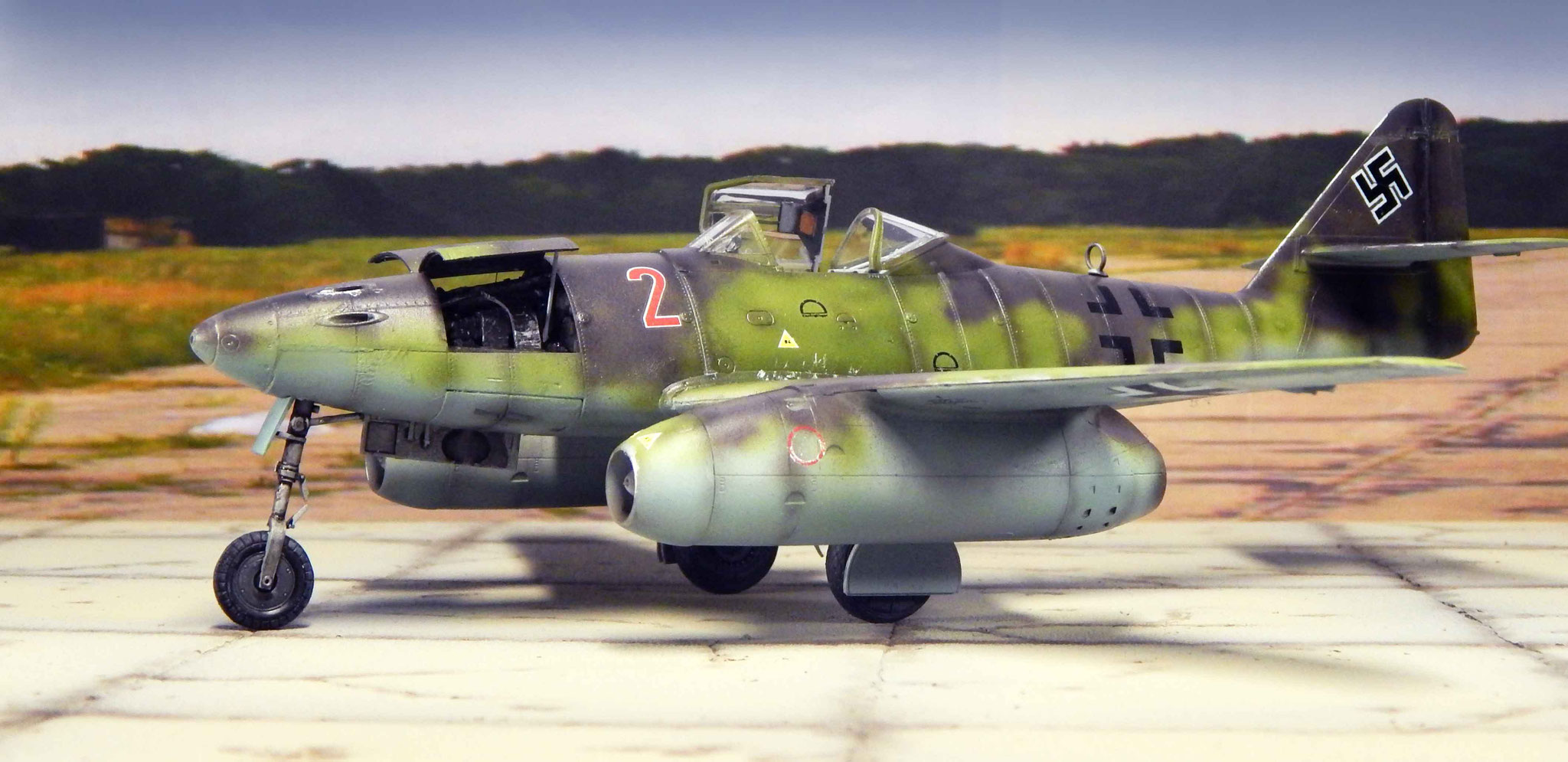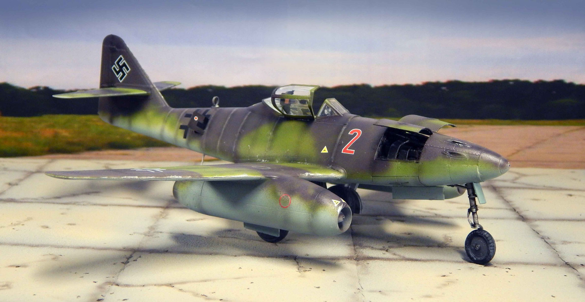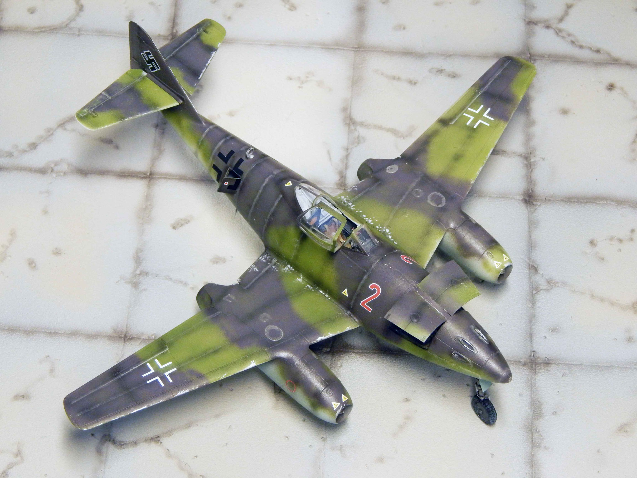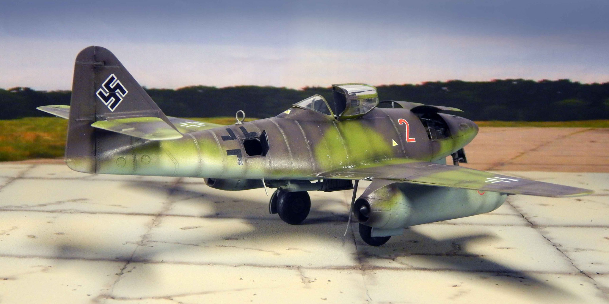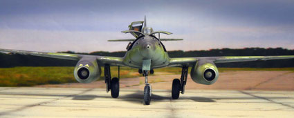 Von oben zeigt sich der Tarnverlauf als sehr effektiv, verwischt er doch die klassischen Porportionen der Me 262 deutlich. Dezente Balkenkreuze und nur die große Maschinennummer reduzieren die Auffälligkeiten, auch aus der Luft.