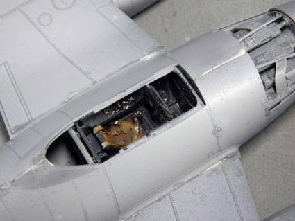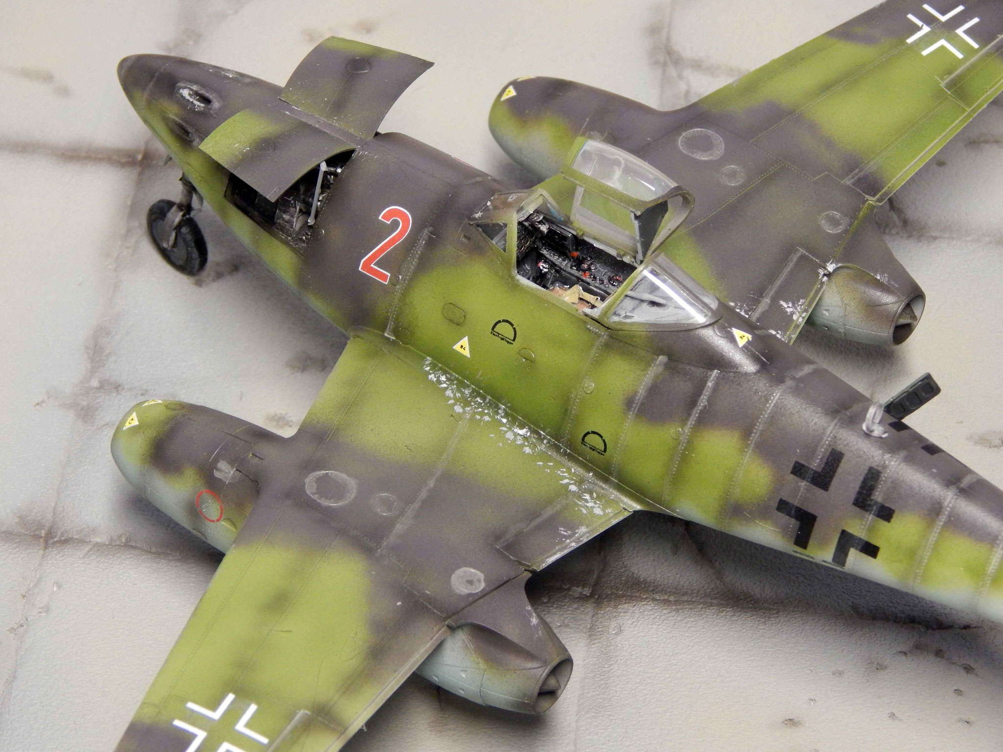 Die Cockpitkanzel und Waffenschachtverkleidungen werden in das Tarnschema mit integriert. Etwas Metallabrieb ergibt sich im Bereich des Cockpitzuganges, der MK-Öffnungen und an den Tragflächenkanten.