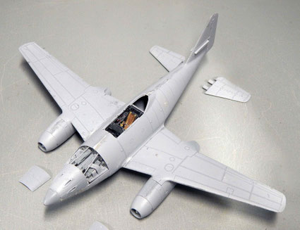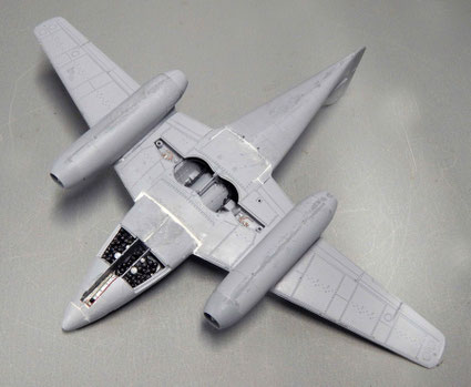 Rumpf und Tragflächengruppe, sowie die beiden Triebwerke werden im Rohbau schon verklebt, um stabile Verbindungen und Übergänge zu haben. Die Trägflächen sind sehr schön graviert und sehr dünn. Die beiden Klappen vorne für die vier 30mm-Mauser-Kanonen bleiben abnehmbar.