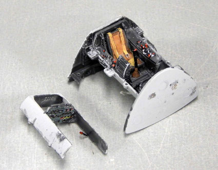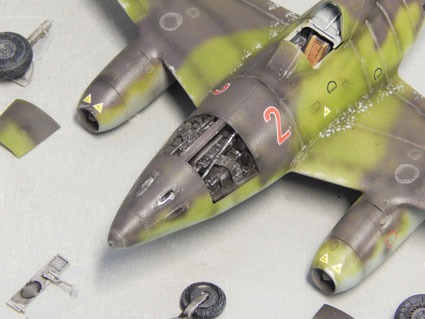 Im Auftrag wird eine Me 262 A-1A des Kampfgeschwaders 51 in 1:48 umgesetzt. Als Bausatz dient dazu der Bausatz von Hobbyboss. Dazu gibt es einen Ätzteilsatz von Eduard, der vor allem für die Armaturen und die fehlenden Sitzgurte eingesetzt wird. Zuerst wird die Cockpitschale aufgebaut und komplett koloriert. Hier werden alle Armaturen abgeschliffen und durch die Eduard-Teile ersetzt. Auf dem Sitz das vierteilige Sitzgurt-Set.