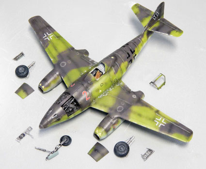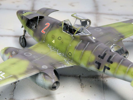 Vor der Endmontage nach dem Lackieren und Aufbringen der Decals für eine Maschine des KG.51. Die Maschine bekommt von oben einen Basisanstrich in Hellgrün. Das Tarnschema wird in Grauviolett mit weichen Umrissen aufgespritzt. Die Fugen werden entweder in Schwarzbraun betont oder in Beigegrau auf den dunklen Flächen.