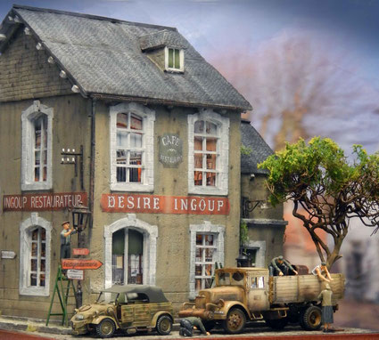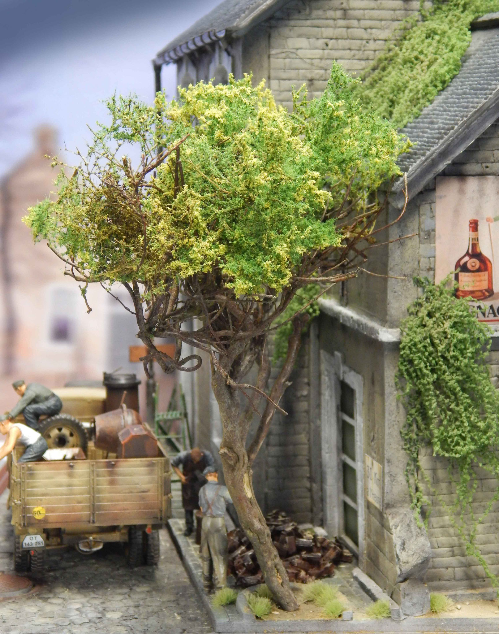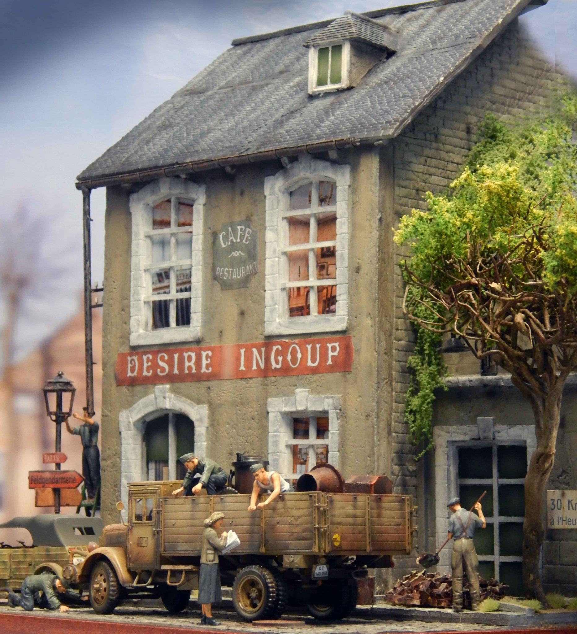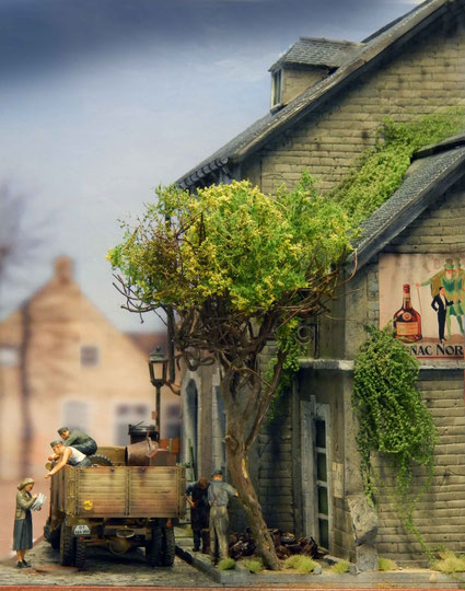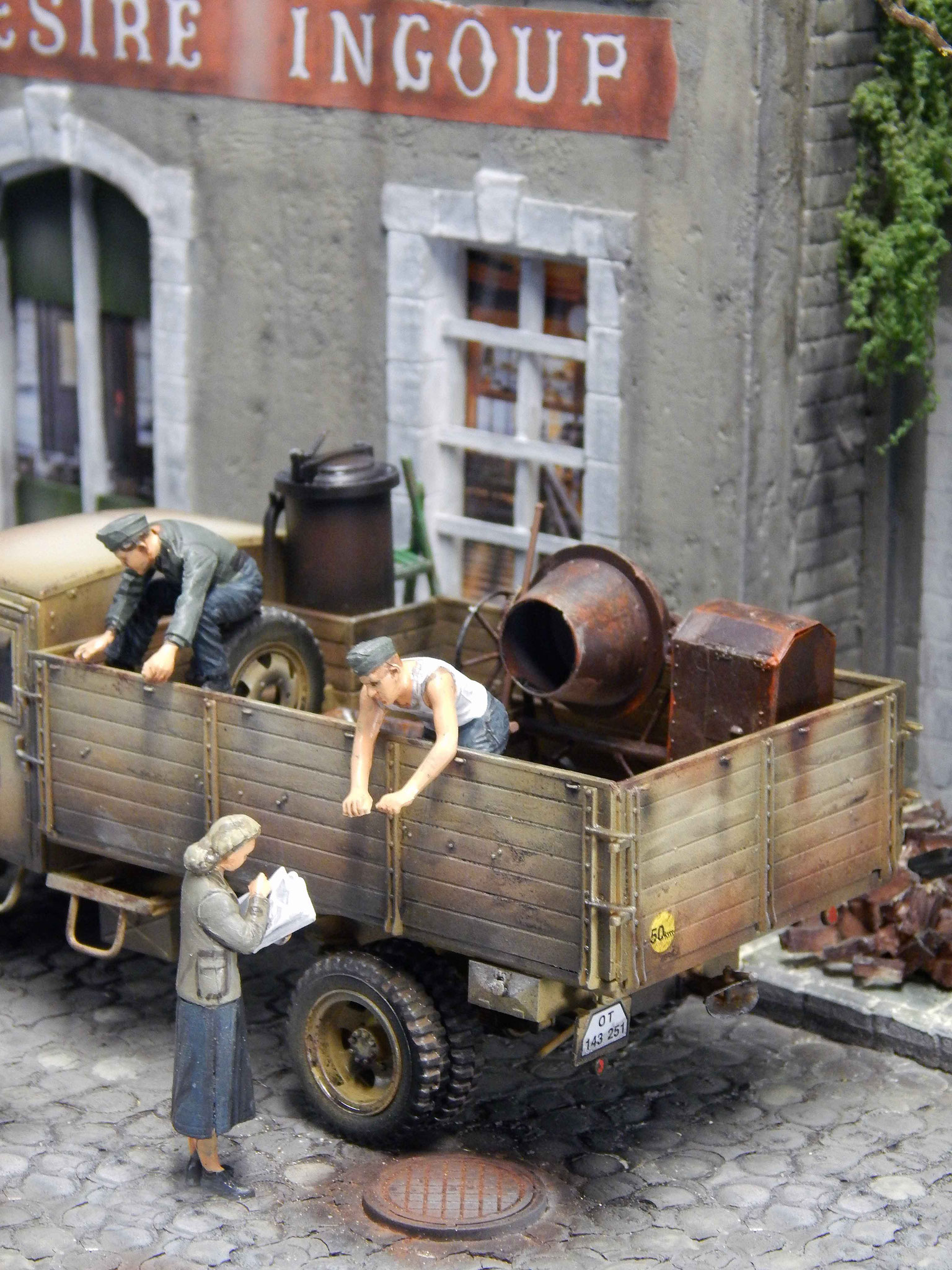 Das fertige Diorama bekommt neben den beiden Holzgasfahrzeugen Soldaten des Arbeitsdienstes und französische Hilfswillige in die Szene. Dazu hat der Opel Blitz nun eine entsprechende Baugeräte-Beladung der Organisation Todt für den Atlantikwall-Bau.
