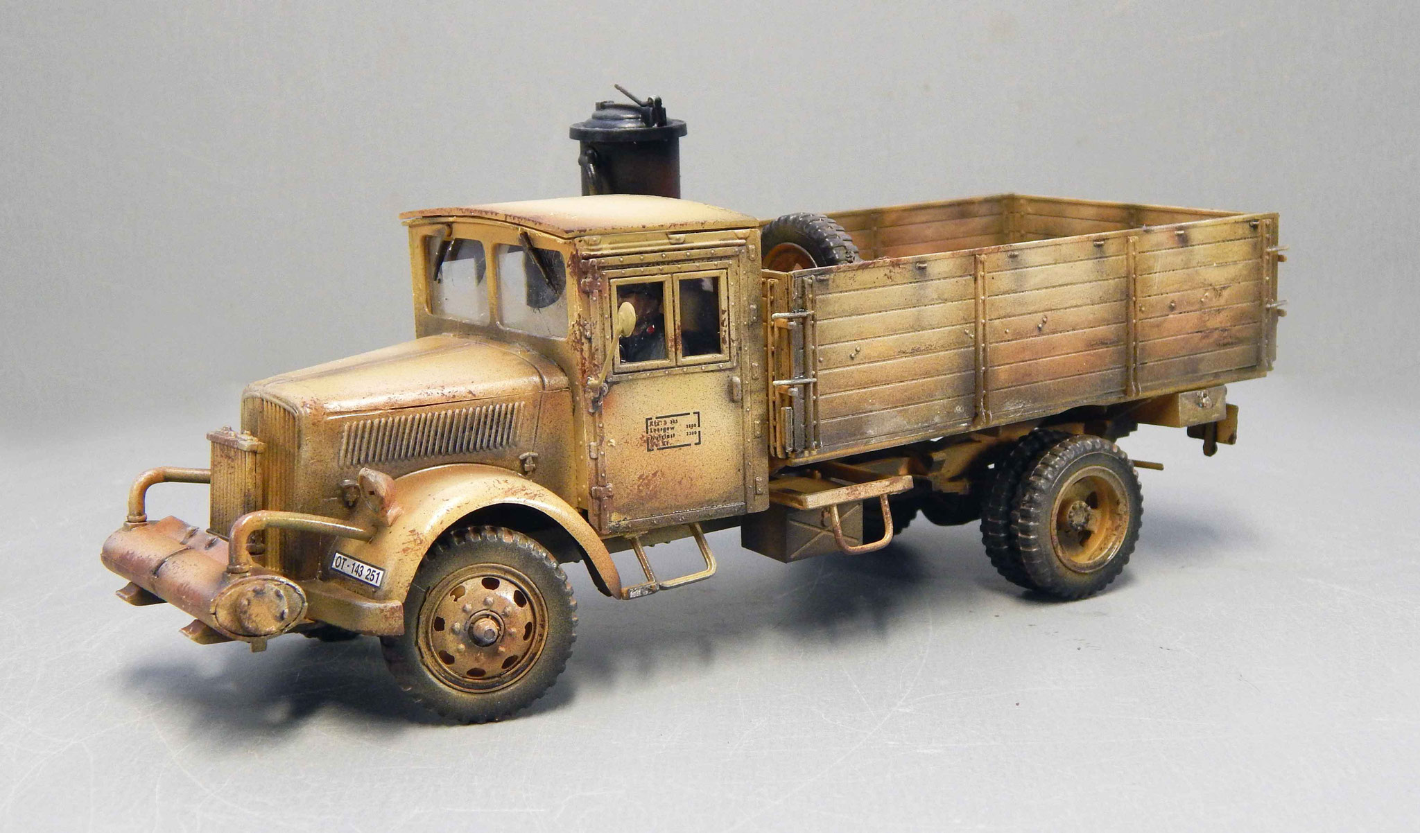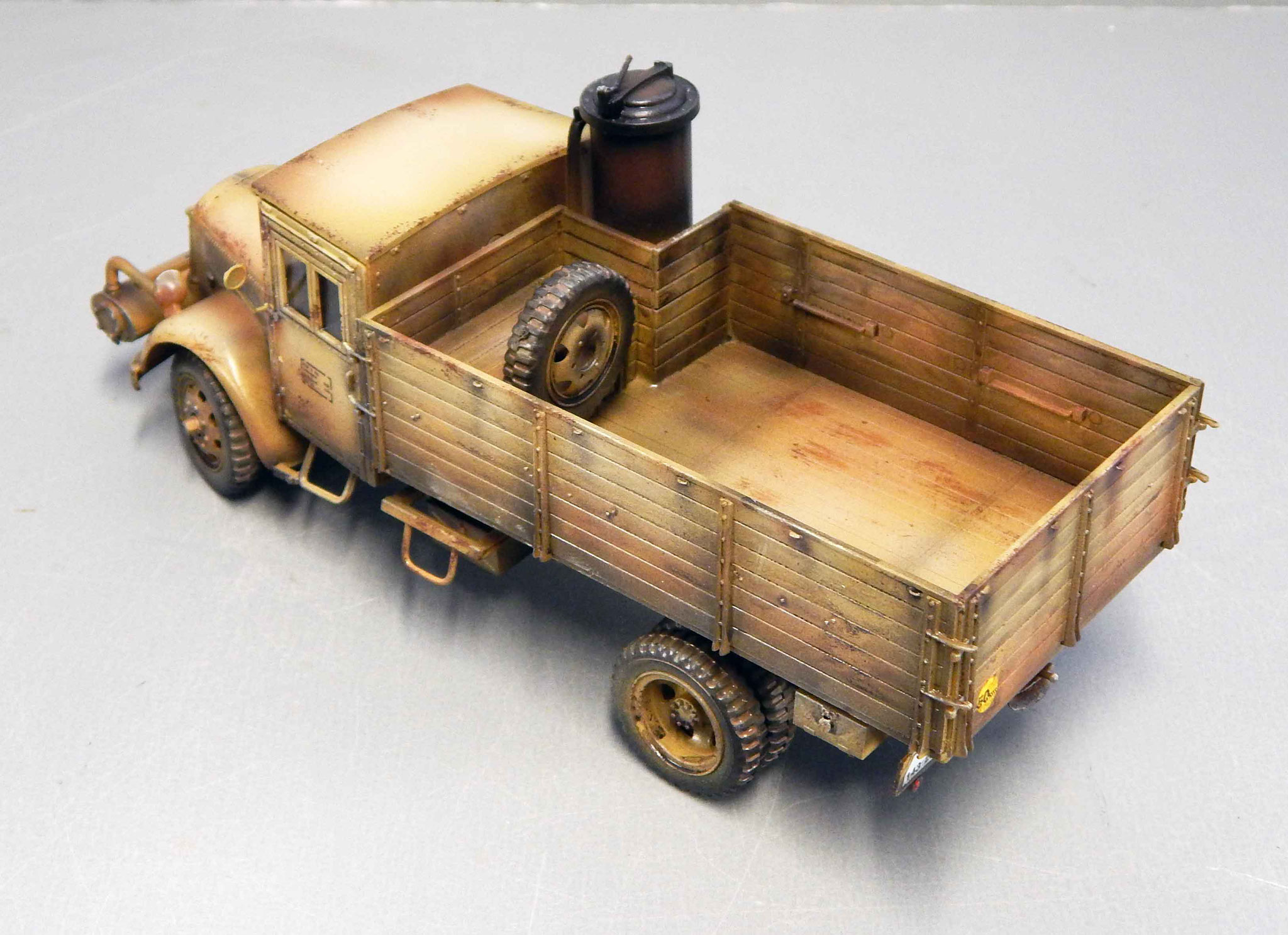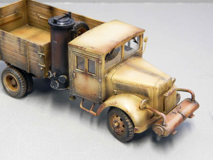 Der Holzgas-Opel-Blitz der Organisation Todt hat 1944 das Basis-Dunkelgelb aller Wehrmachtsfahrzeuge. Das kann man dann einem harten Arbeitsalltag unterziehen und so den Holzgascharakter und die Struktur der Pritsche betonen. Das Modell hat hier noch keine Beladung, die folgt dann im Dioramenbau.
