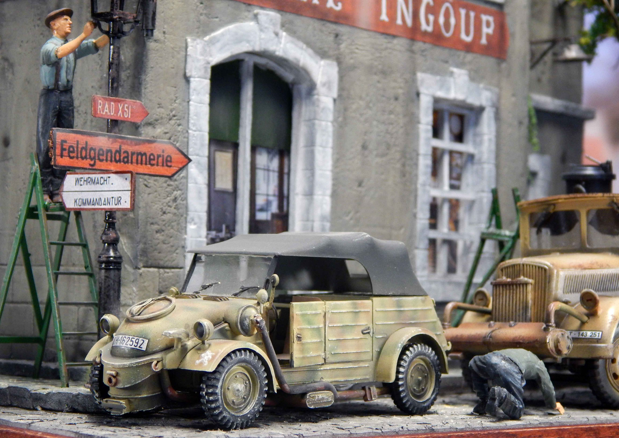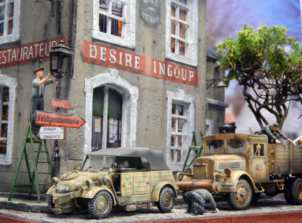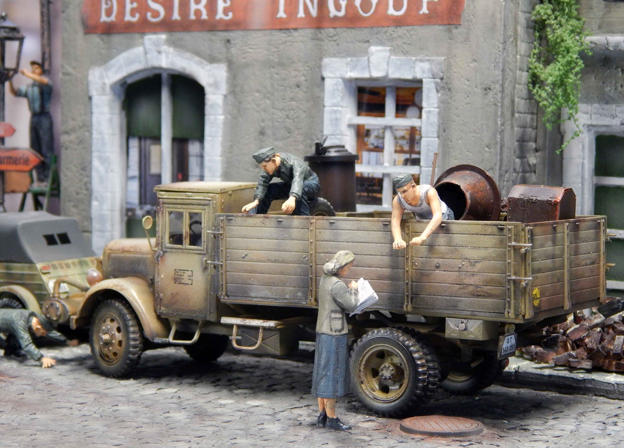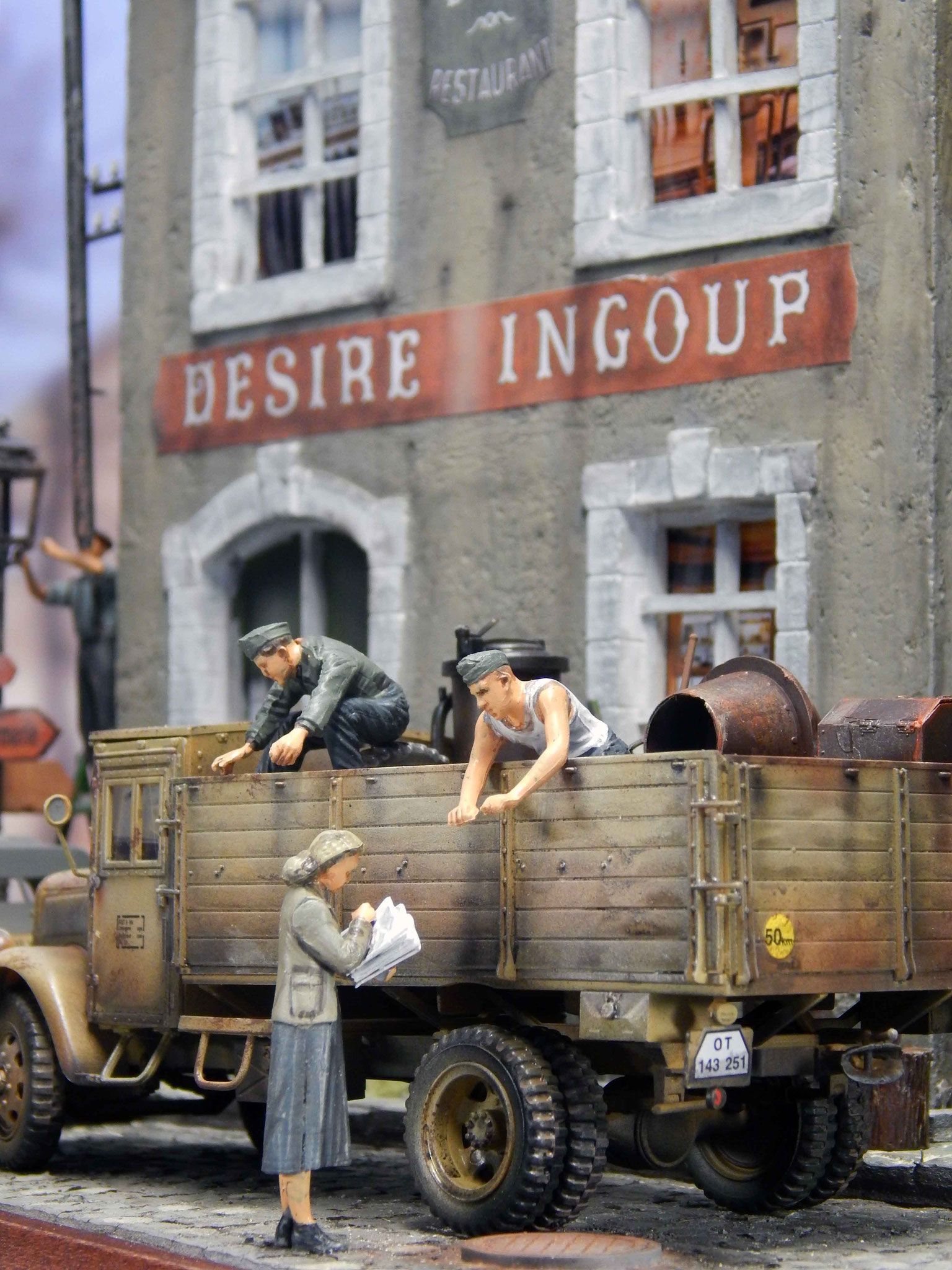 Einezlen Figuren müssen im "Dialog" miteinander stehen. Die Ladefläche des Opel Blitz bietet sich hier als Platzierung für zwei Bausoldaten an.