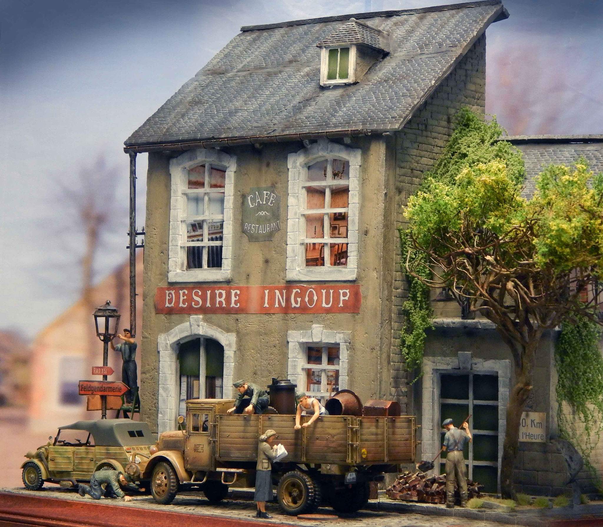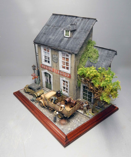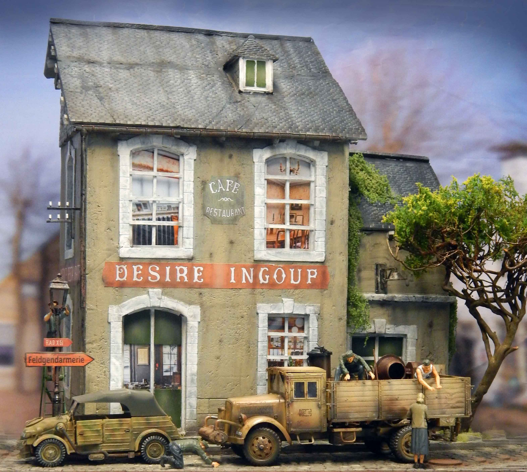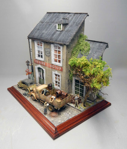 Dazu gibt es von Miniart dann Regenrinne, Straßenlaterne Hauslampe und die obligatorischen Kanaldeckel in das Straßenpflaster. So bleibt genug Platz auf dem schönen Holzsockel von Döring für zwei Fahrzeuge im Vordergrund.