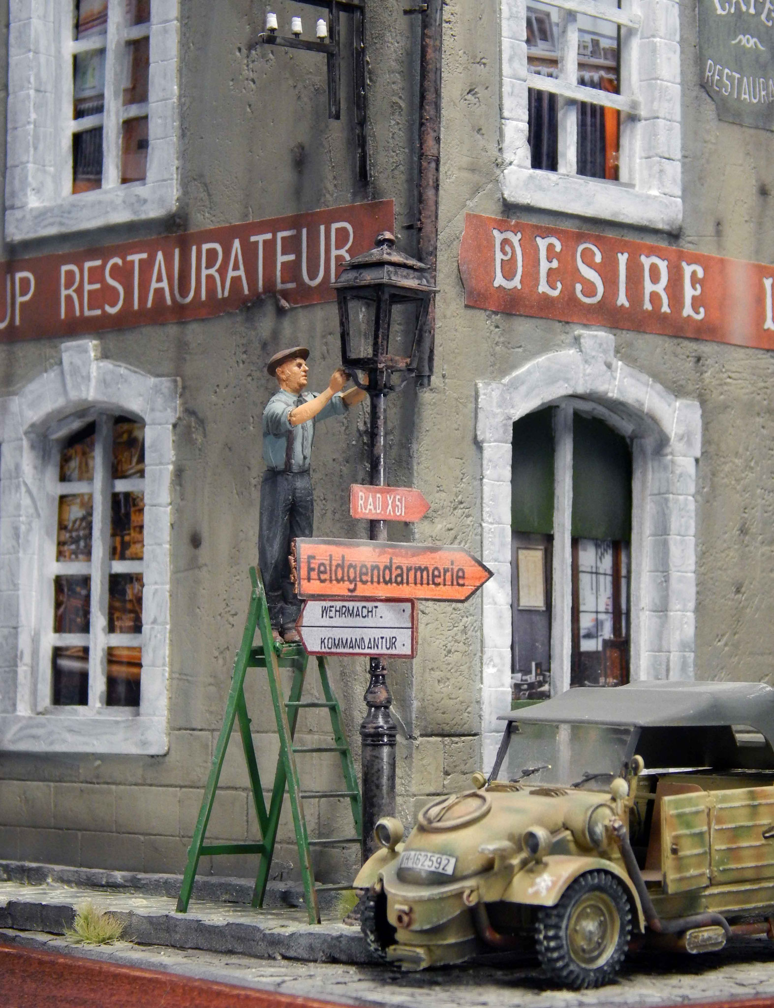 Die Gebäudedetails wie Isolatorenmast und Straßenlampe sind von MiniArt, hier kann man die deutschen Richtungsschilder anbringen. Die typischen, normanischen weißen Einfassungen von Fensterbereichen setzt sich auch an dem Giebelkonstrukt fort.