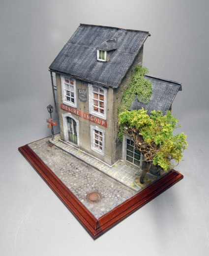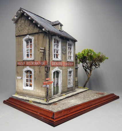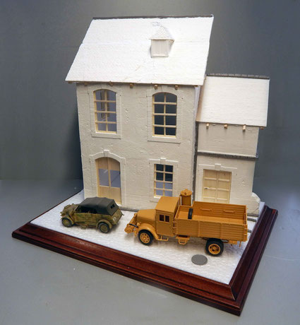 Das französische Diorama-Label MK-35 gab dazu vor vielen Jahren einen Gipsgussbausatz auf Basis einer originalen Hausvorlage heraus. Sie zeigt die Kombination aus Schindeldach und weiss eingefassten Fenster- und Türbögen und der hellen sandfarbenen Verputzstruktur.