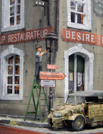 Dabei gehen die belebenden Figurenszene am besten um die Ecke herum, wie hier der Arbeiter auf der Leiter, der eine Birne in der Straßenlaterne wechselt.