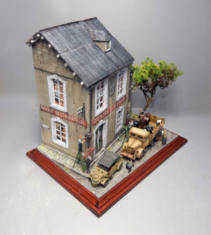 Die Diorama-Base wird entsprechend dem Original-Gebäude koloriert. Hier kommen dann die beigefügten Schilder des Normandie-Gebäudes zur Verwendung. Unterschiedliche Basistöne für Dach, Gebäude und Trottoir trennen die Bereiche optisch.