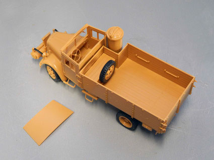 Das Dach des Führerhauses bleibt vorerst separat, um den Innenraum für die Kolorierung zu erreichen. Dazu werden Kleinteile und Ladegut auch separat für die Schlussmontage gehalten.