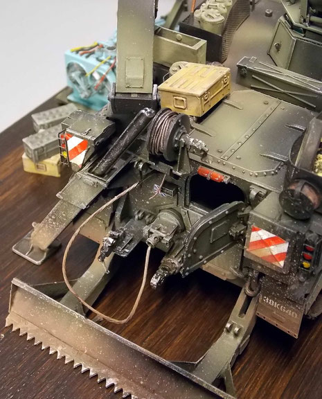 Auf dem Turm ein kleiner Suchscheinwerfer und die Rundumwarnblinkleuchte. Viele Staukästen nehmen das Material der Instandsetzungstruppe auf.