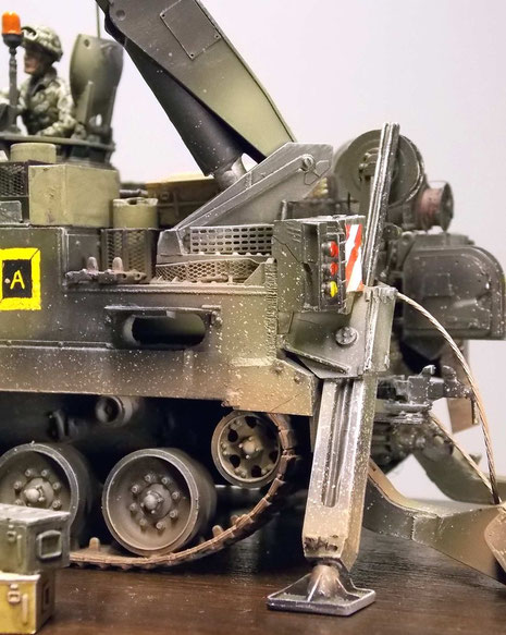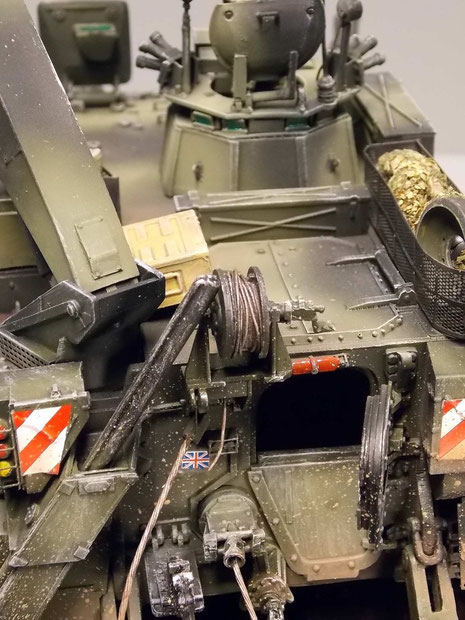 Die Lüftergitter werden durch sehr fein gearbeitete Ätzteile verfeinert. Die Bergepanzer verfügen zur Nahverteidigung über eine kurzrohrige Schnellfeuerwaffe im Turm. Das Abschleppgestänge wird am Bug mitgeführt. Die Figuren von AA zeigen typische britische Panzerbesatzungen.