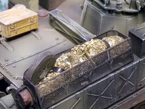 Wanne und Fahrgestell kommen aus dem Basiskit und werden durch verstärkte Stoßdämpfer verändert. Darauf kommt ein Resinoberteil, das mit Bausatzteilen, Ätzteilen und Zinnteilen ergänzt wird. Den Materialmix erkennt man gut an den unterschiedlichen Farbigkeiten.
