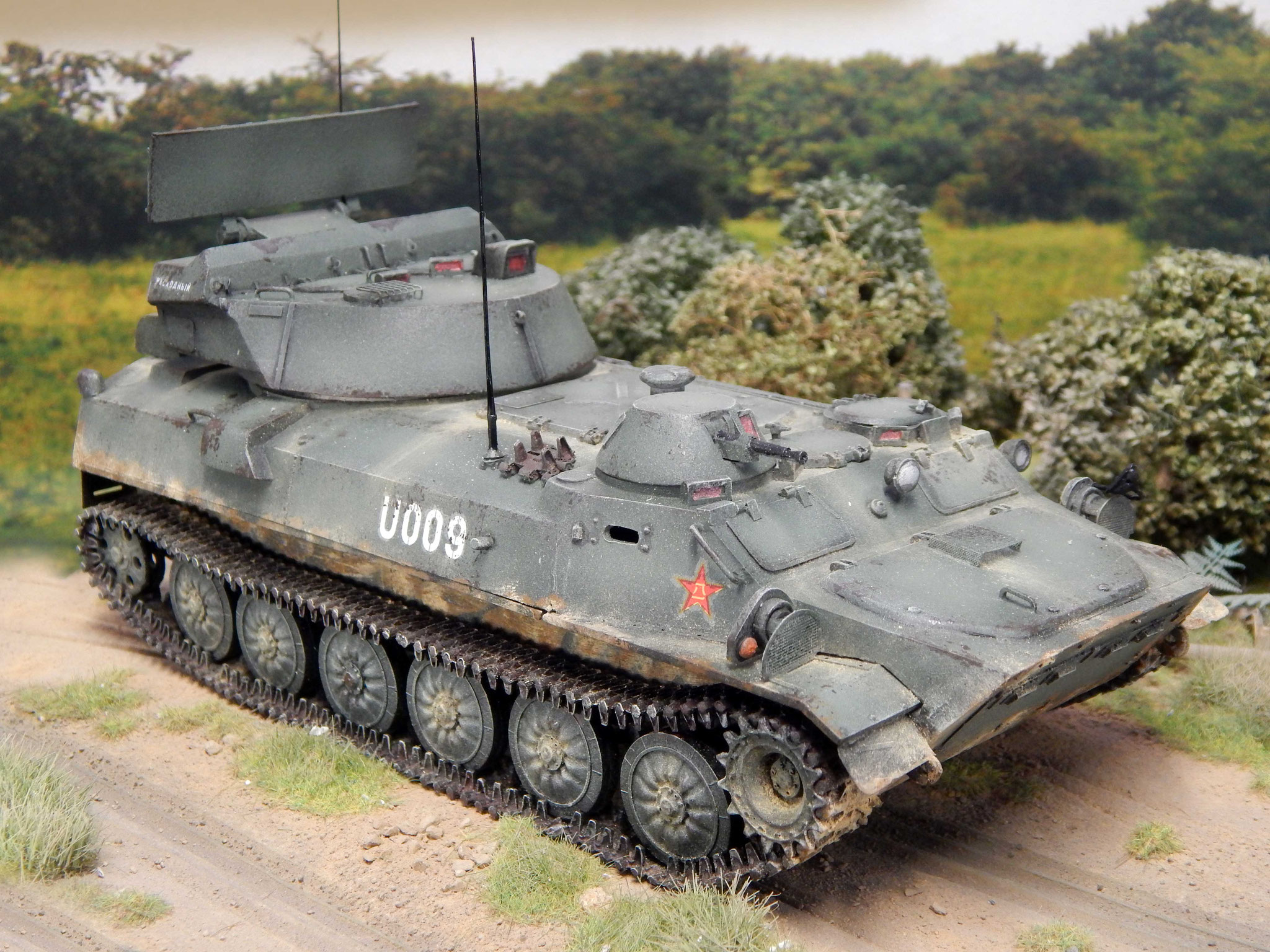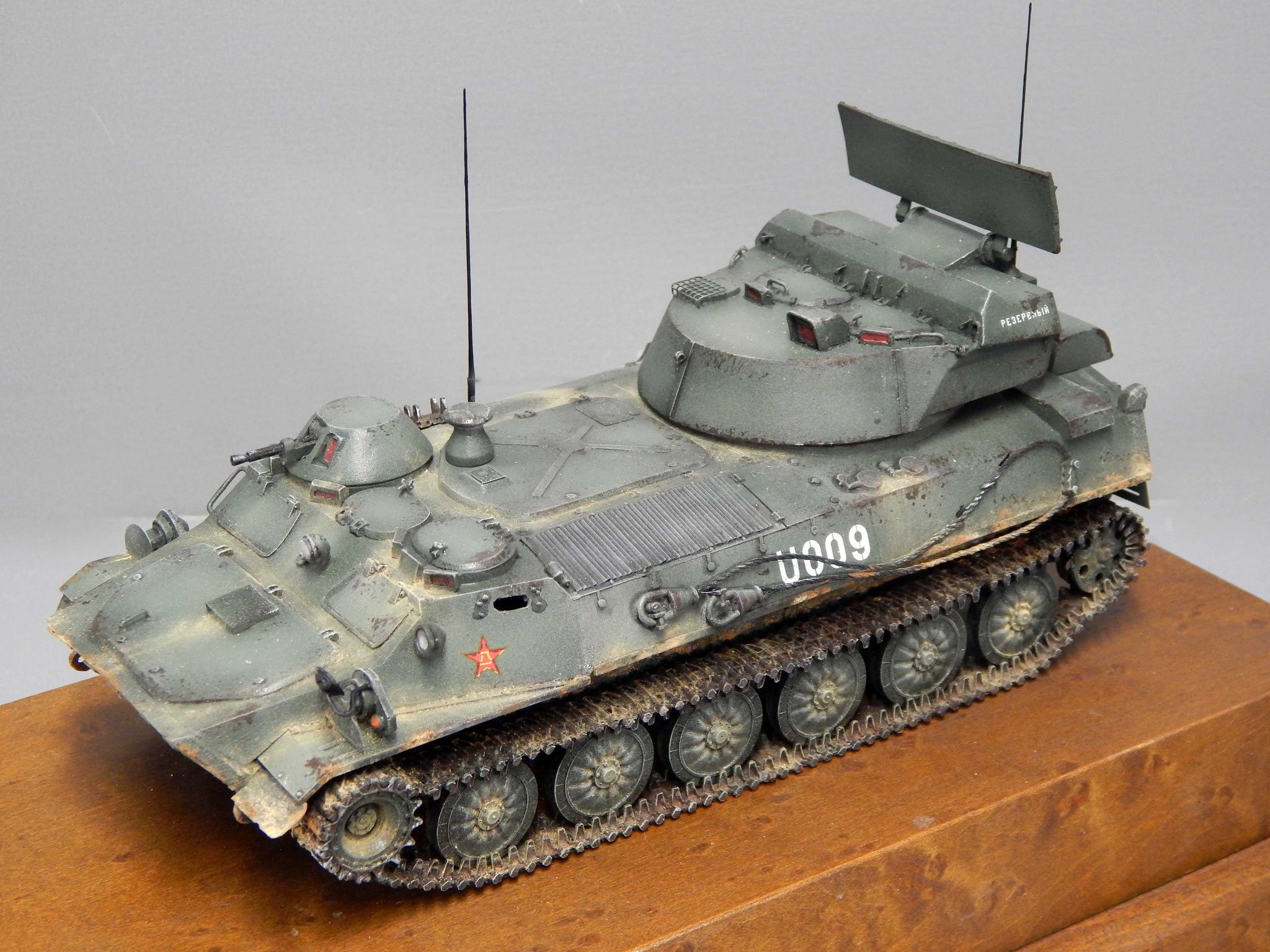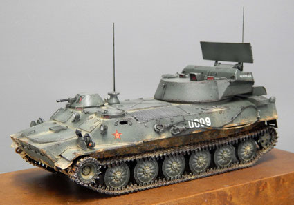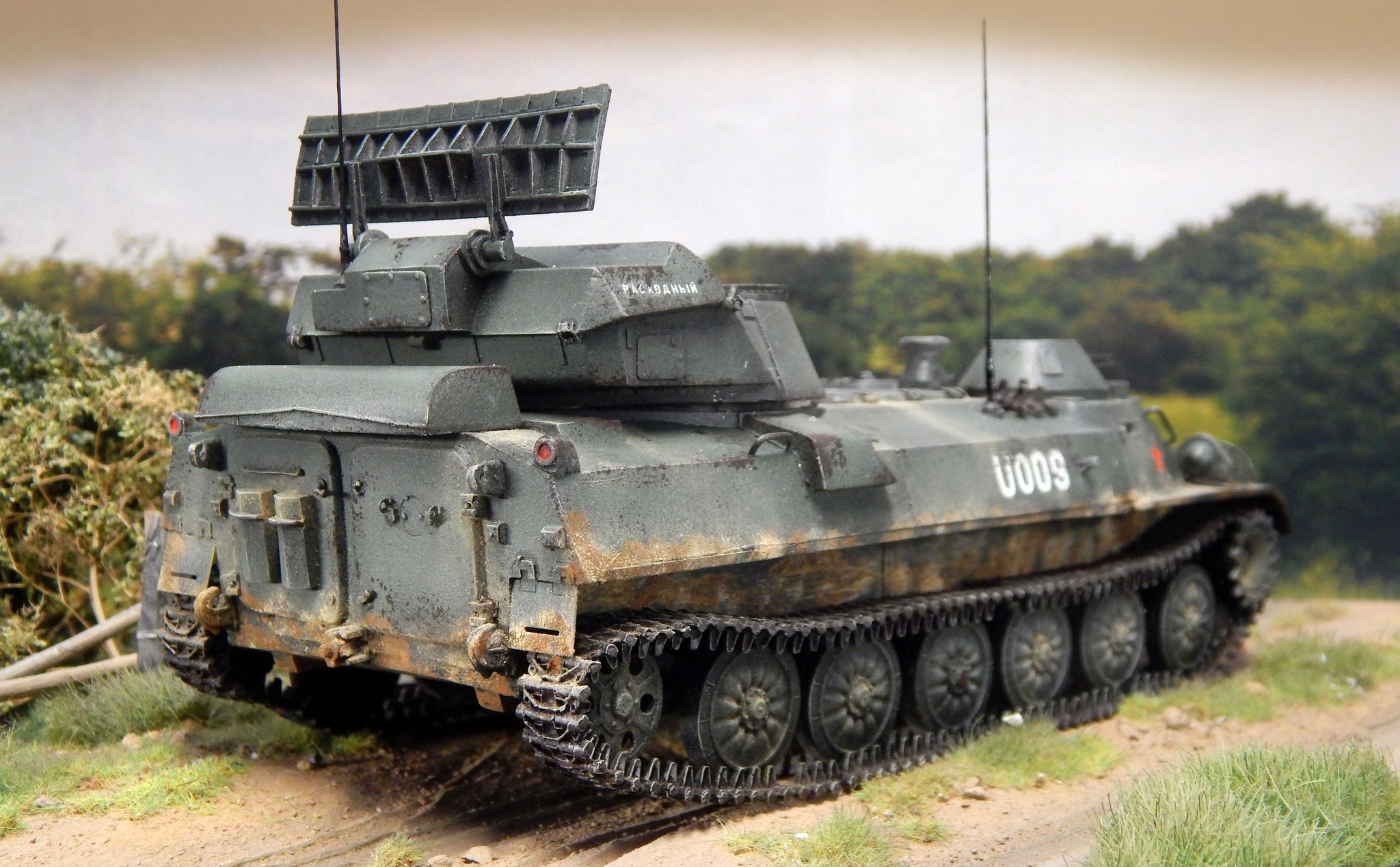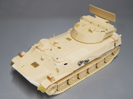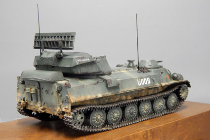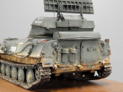 Das Modell zeigt den Artillerieradarpanzer in aktiver Position mit aufgerichteter Radarschüssel. Bei Marschfahrt wird der Spiegel auf das Turmdach abgeklappt.