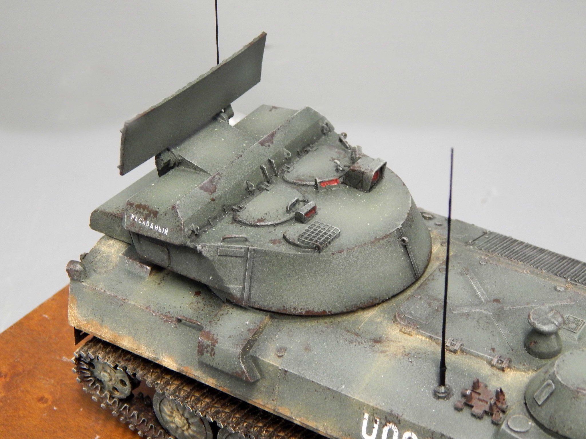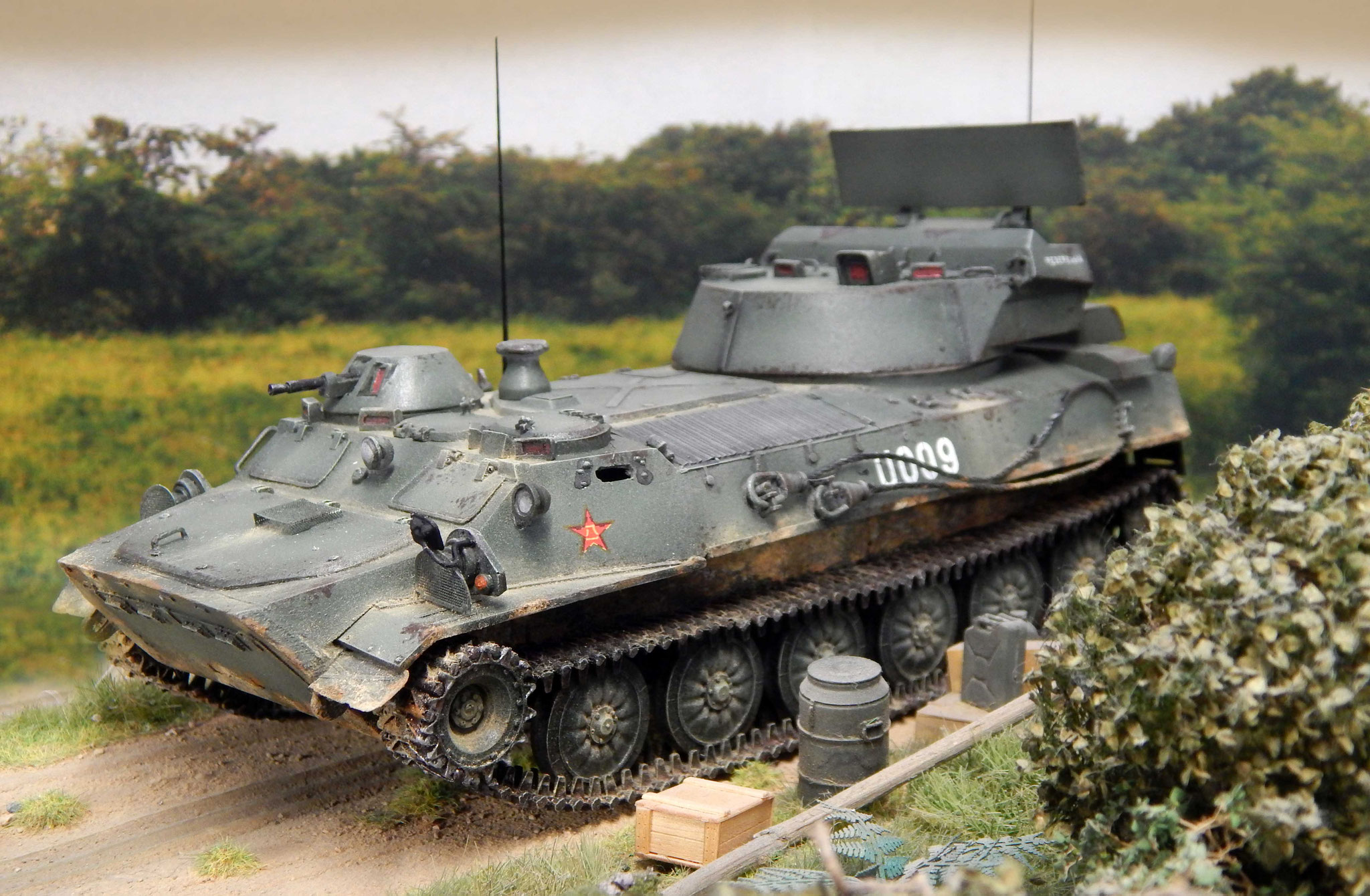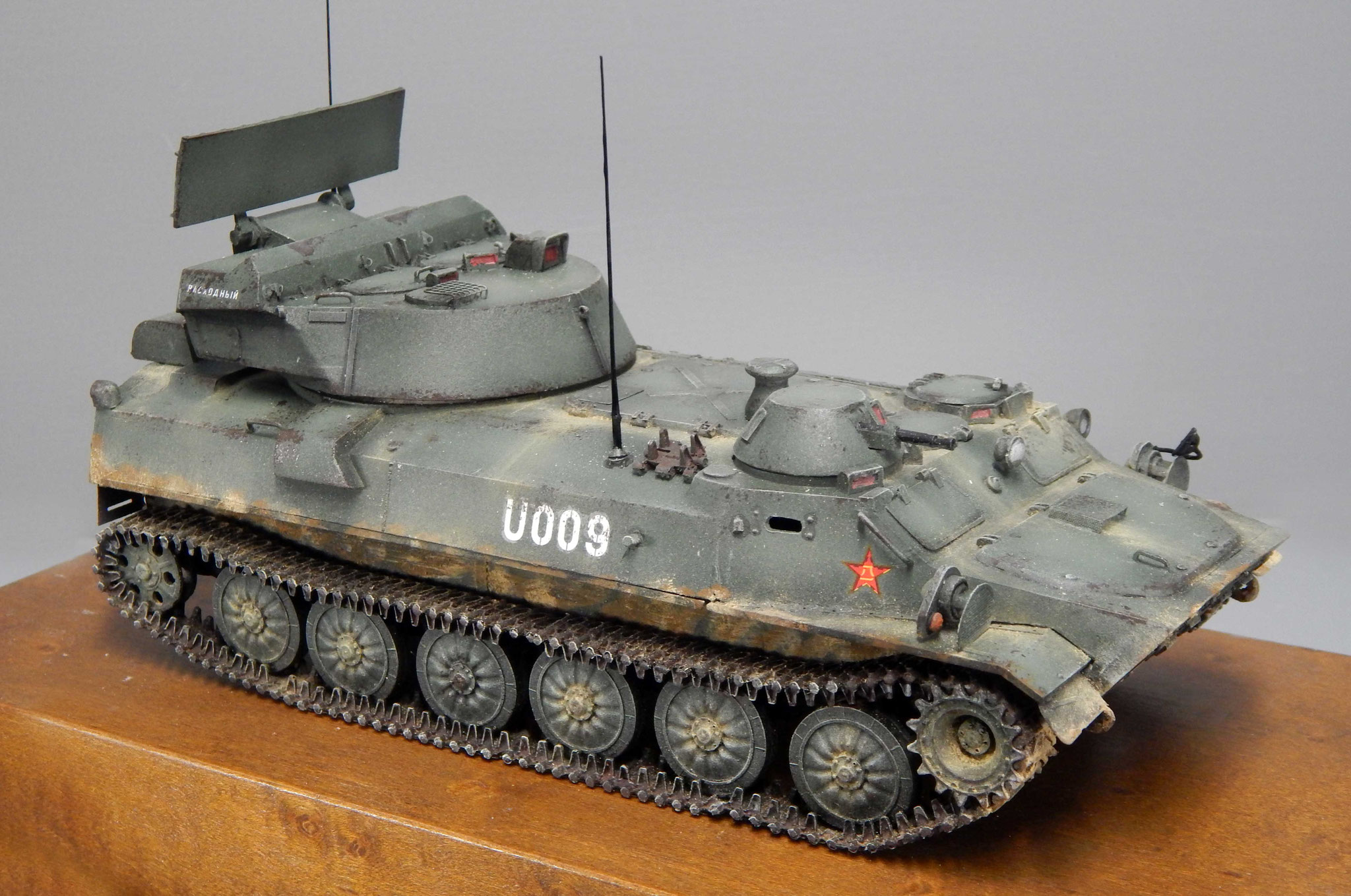 Das Modell zeigt den Artillerieradarpanzer in aktiver Position mit aufgerichteter Radarschüssel. Bei Marschfahrt wird der Spiegel auf das Turmdach abgeklappt.