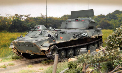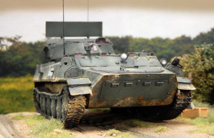 Vom Grundfahrzeug her sind am Heck zwei Ausstiegsluken. Auch hier bringt die Erde an der Unterwanne etwas Leben ans Modell. Die Staubbleche vorne und hinten über den Ketten wurden mit Ätzteile dargestellt, das jetzt am Modell feiner und filigraner wirkt.