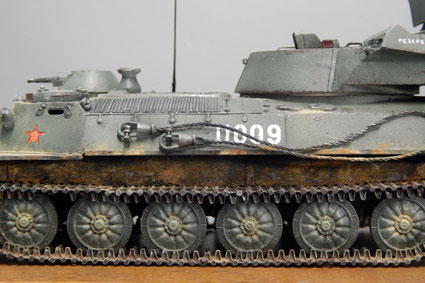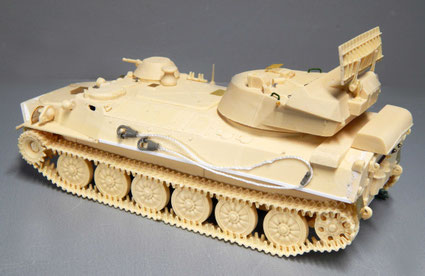 Als Modell in 1:35 kommt ein kompletter Resinbausatz von SP Design zur Verwendung. Dieser muss an einigen Stellen noch mit Ätzteilen verfeinert werden, gibt aber im großen und ganzen das Original wieder. Auch die Ketten sind aus Resinsegmenten und werden in heißem Wasser erhitzt und dann entsprechend um die Führungsrollen gebogen.