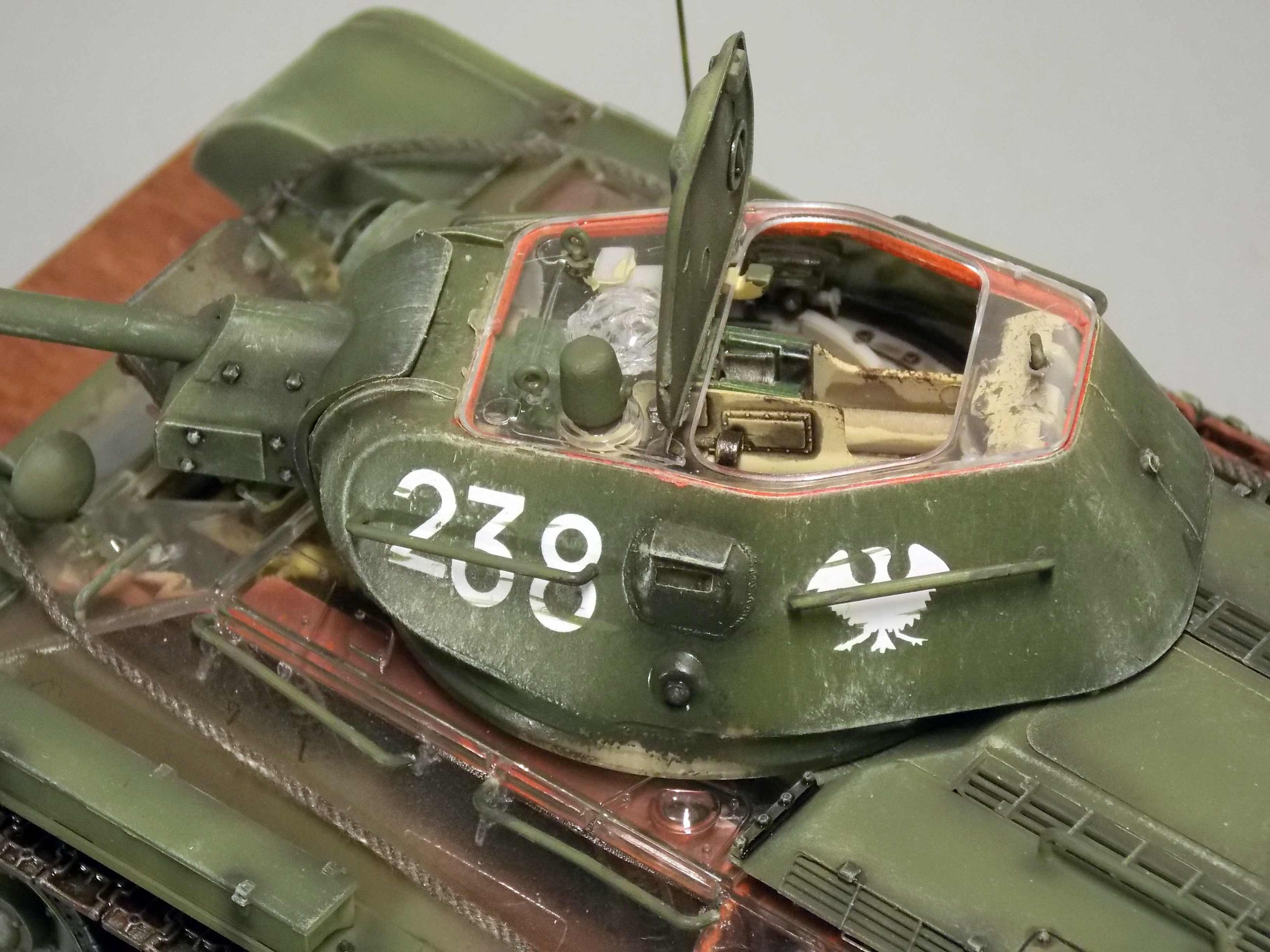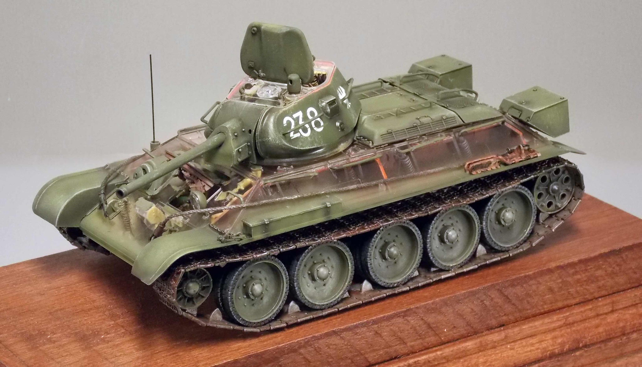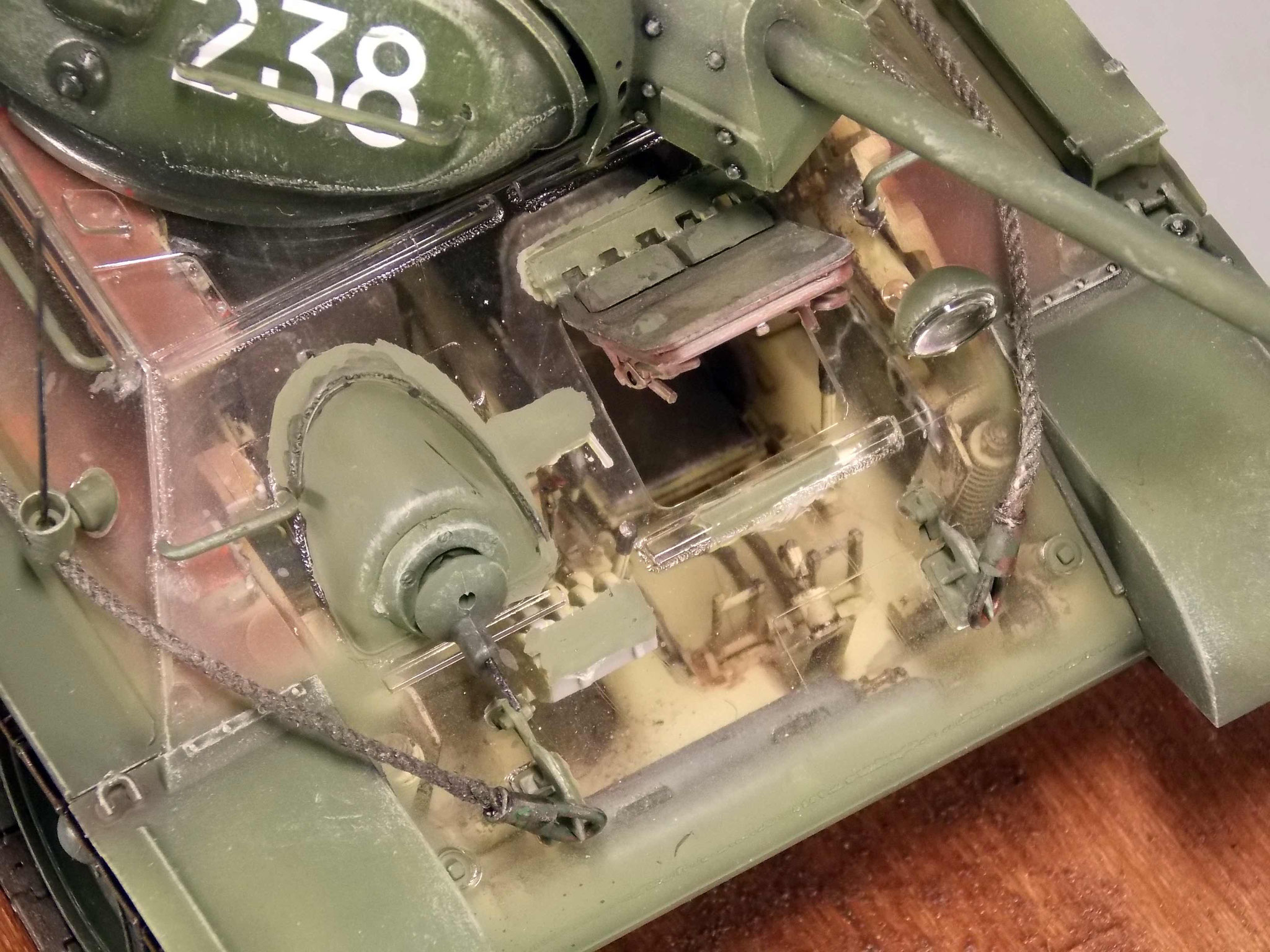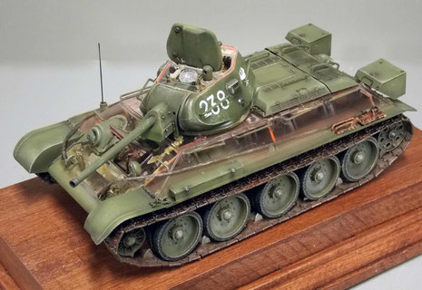 Für eine T-34 der frühen Ausführung mit kompletter Inneneinrichtung bietet sich der Bausatz von AFV Club gut an. Hier ist besonders die komplett aus Klarsichteilen ausgeführte Oberwanne und Turm interessant, die bei geschickter Nutzung einen schönen Einblick in das Innenleben ermöglicht. Im Rohbau kann so die gesamte Unterwanne und die großen Baugruppen fertiggestellt werden. Einziges Manko am Bausatz sind die völlig veraltete Gummiketten, diese müssen durch einen realistischeren Einzelgliedersatz ersetzt werden.