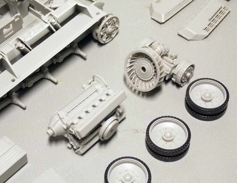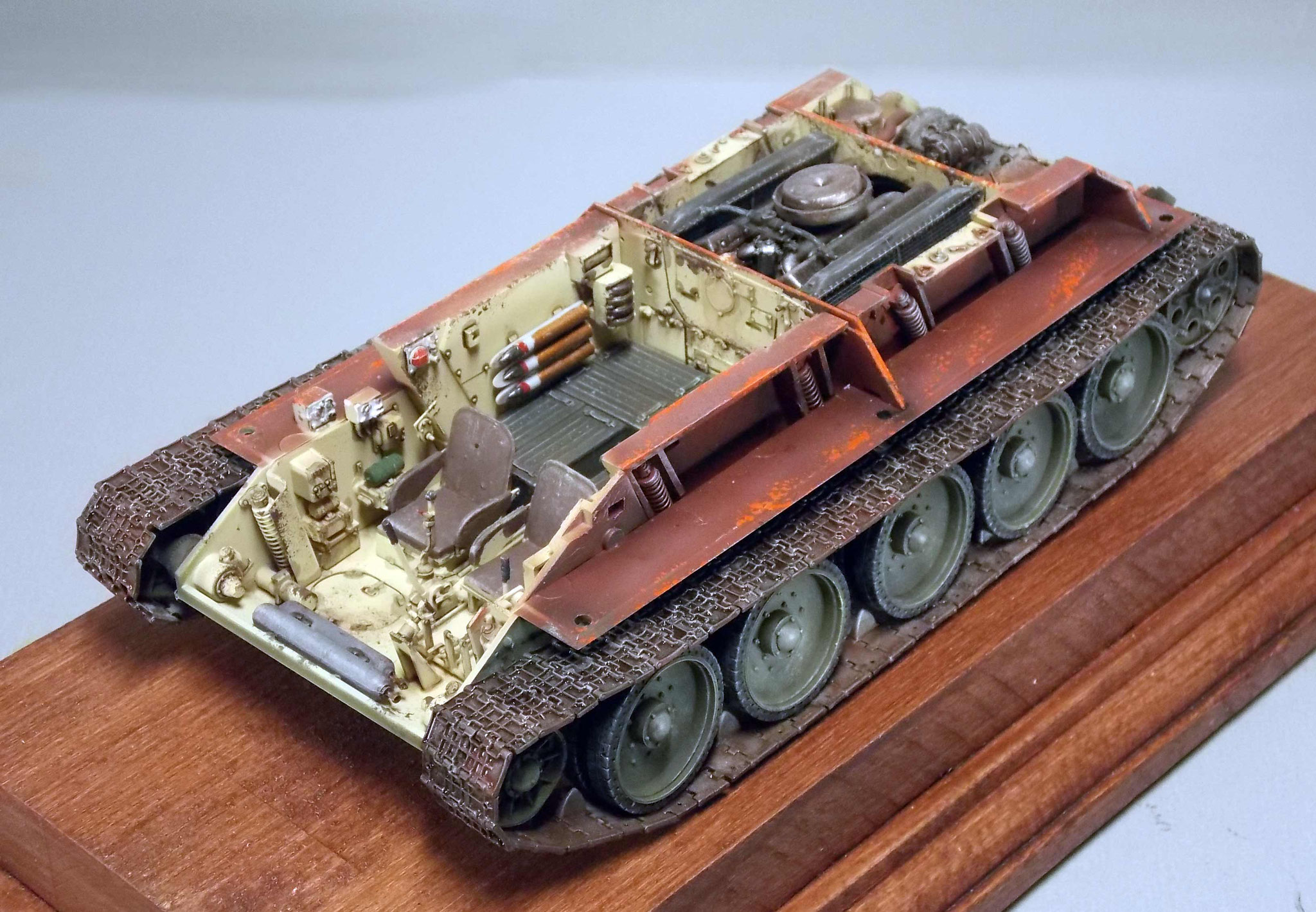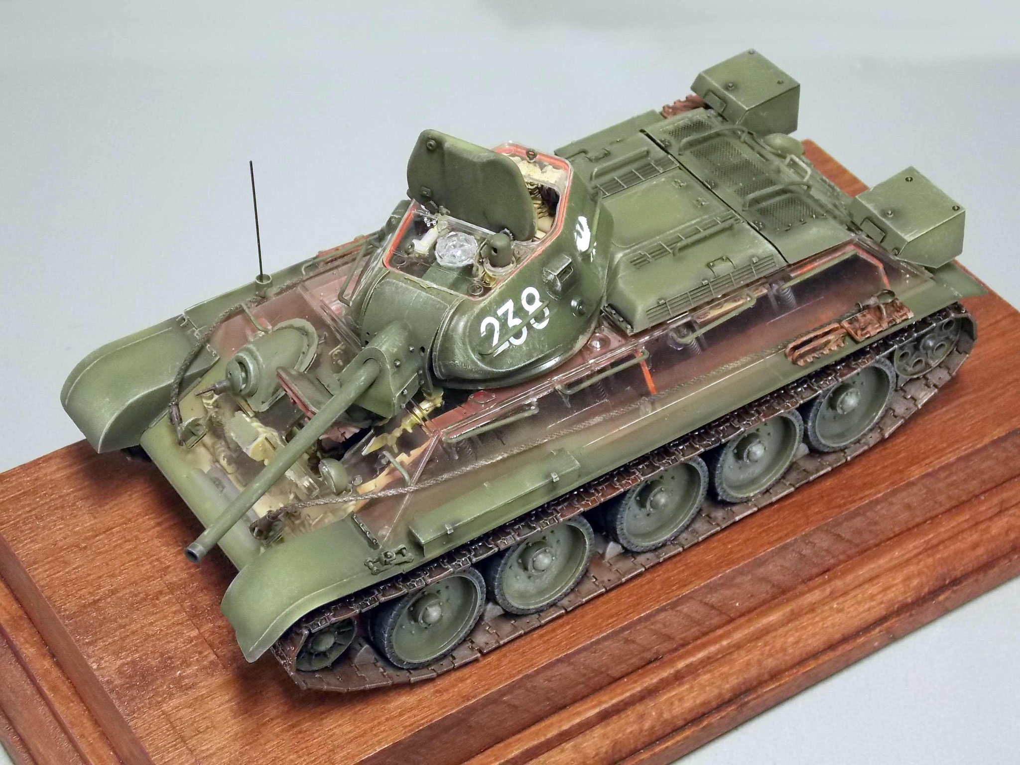 Für eine T-34 der frühen Ausführung mit kompletter Inneneinrichtung bietet sich der Bausatz von AFV Club gut an. Hier ist besonders die komplett aus Klarsichteilen ausgeführte Oberwanne und Turm interessant, die bei geschickter Nutzung einen schönen Einblick in das Innenleben ermöglicht. Im Rohbau kann so die gesamte Unterwanne und die großen Baugruppen fertiggestellt werden. Einziges Manko am Bausatz sind die völlig veraltete Gummiketten, diese müssen durch einen realistischeren Einzelgliedersatz ersetzt werden.