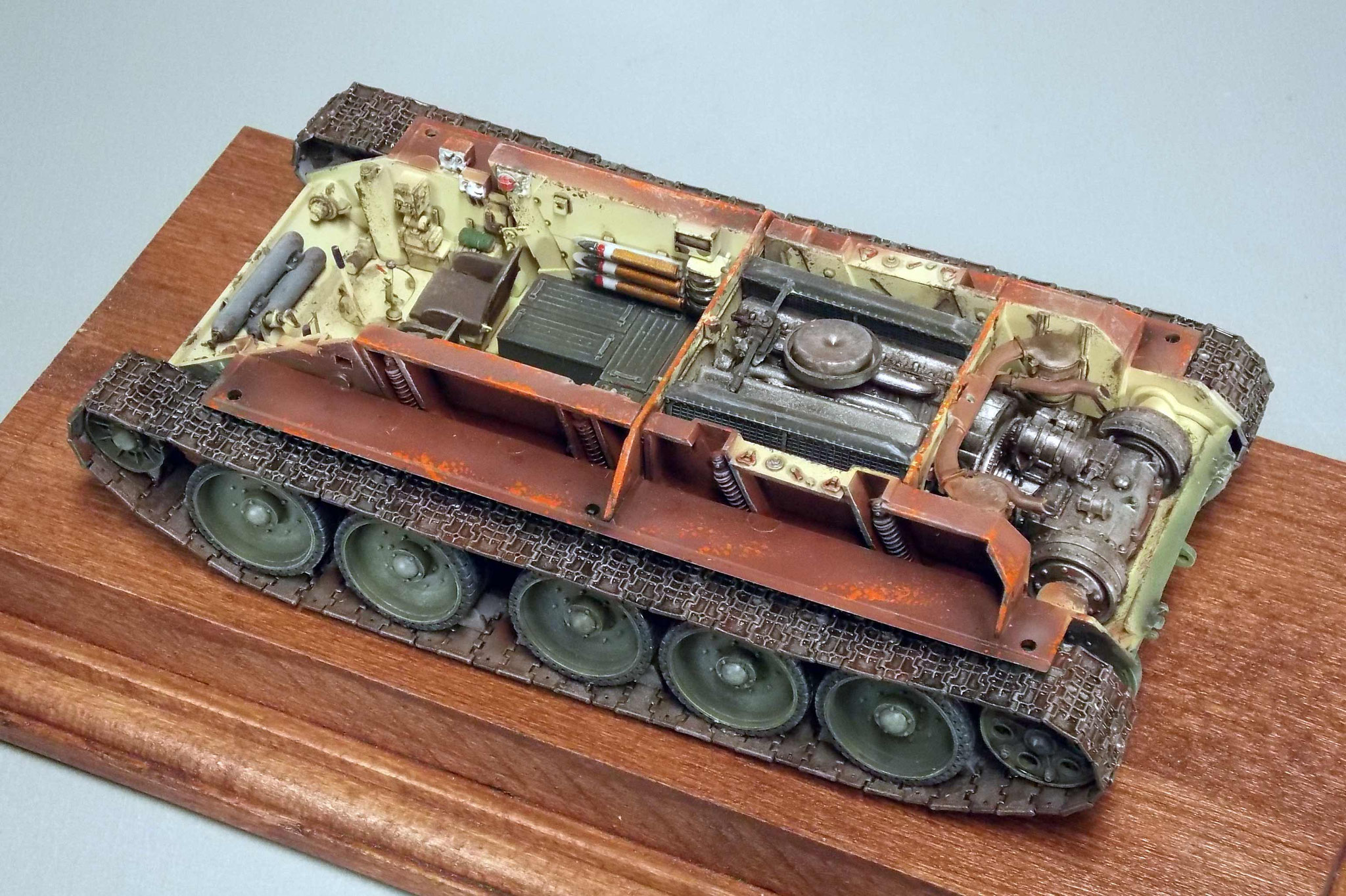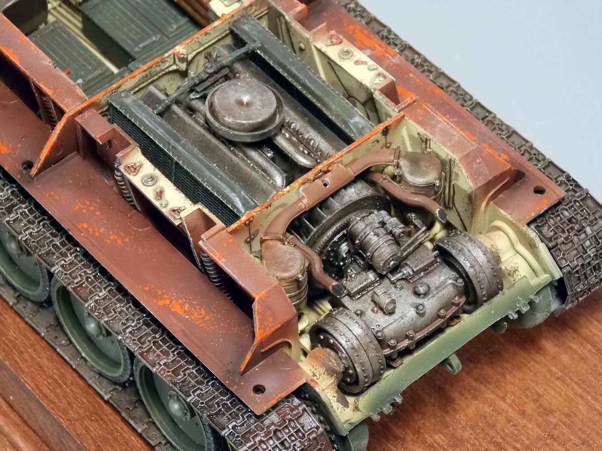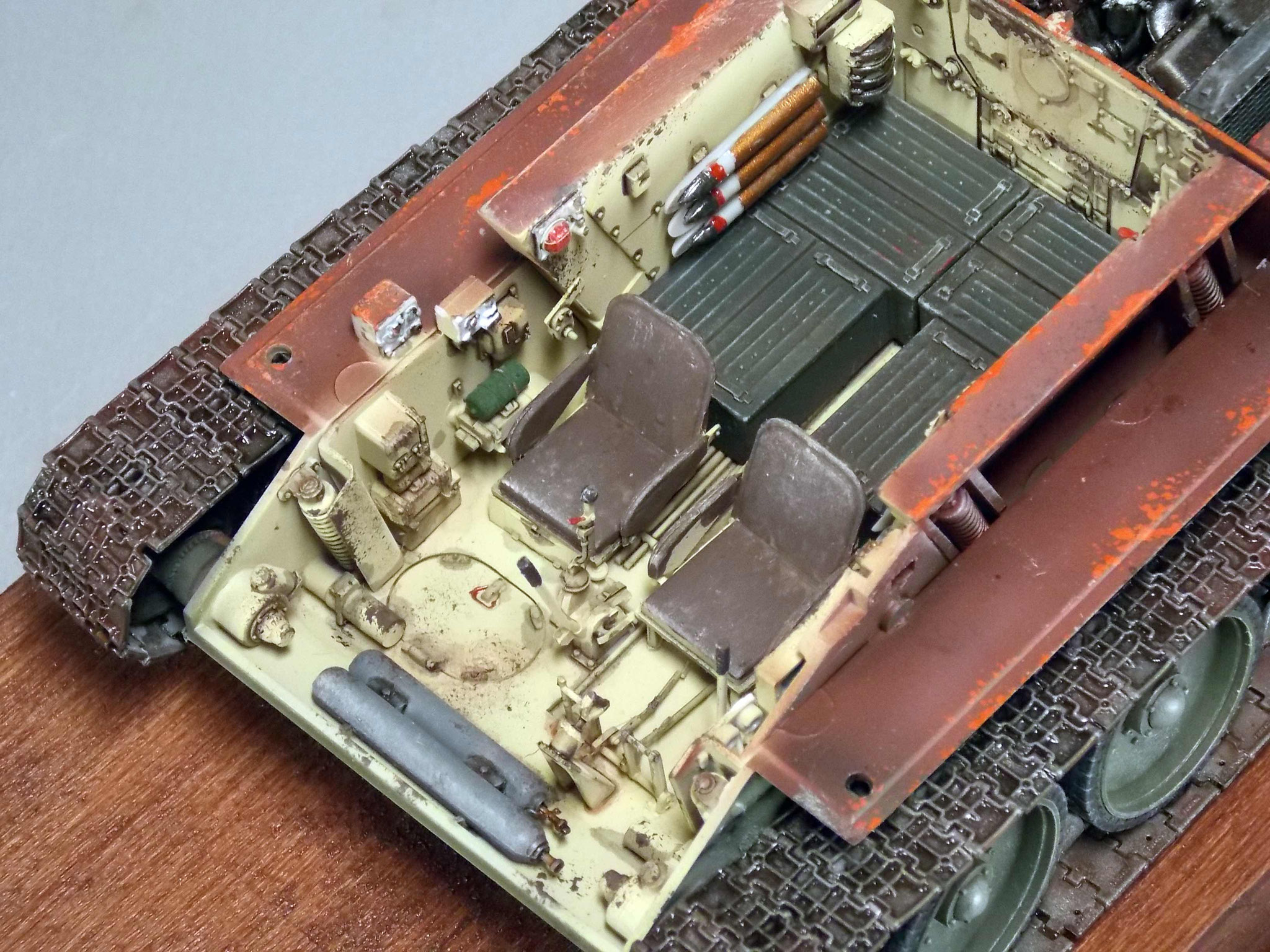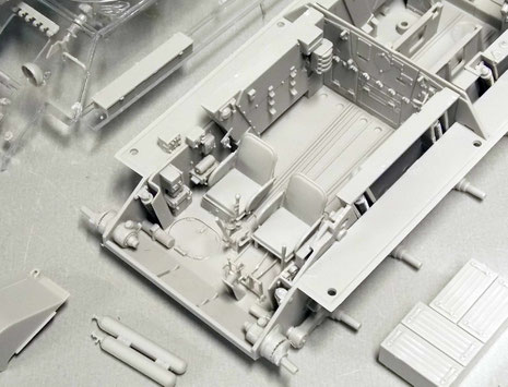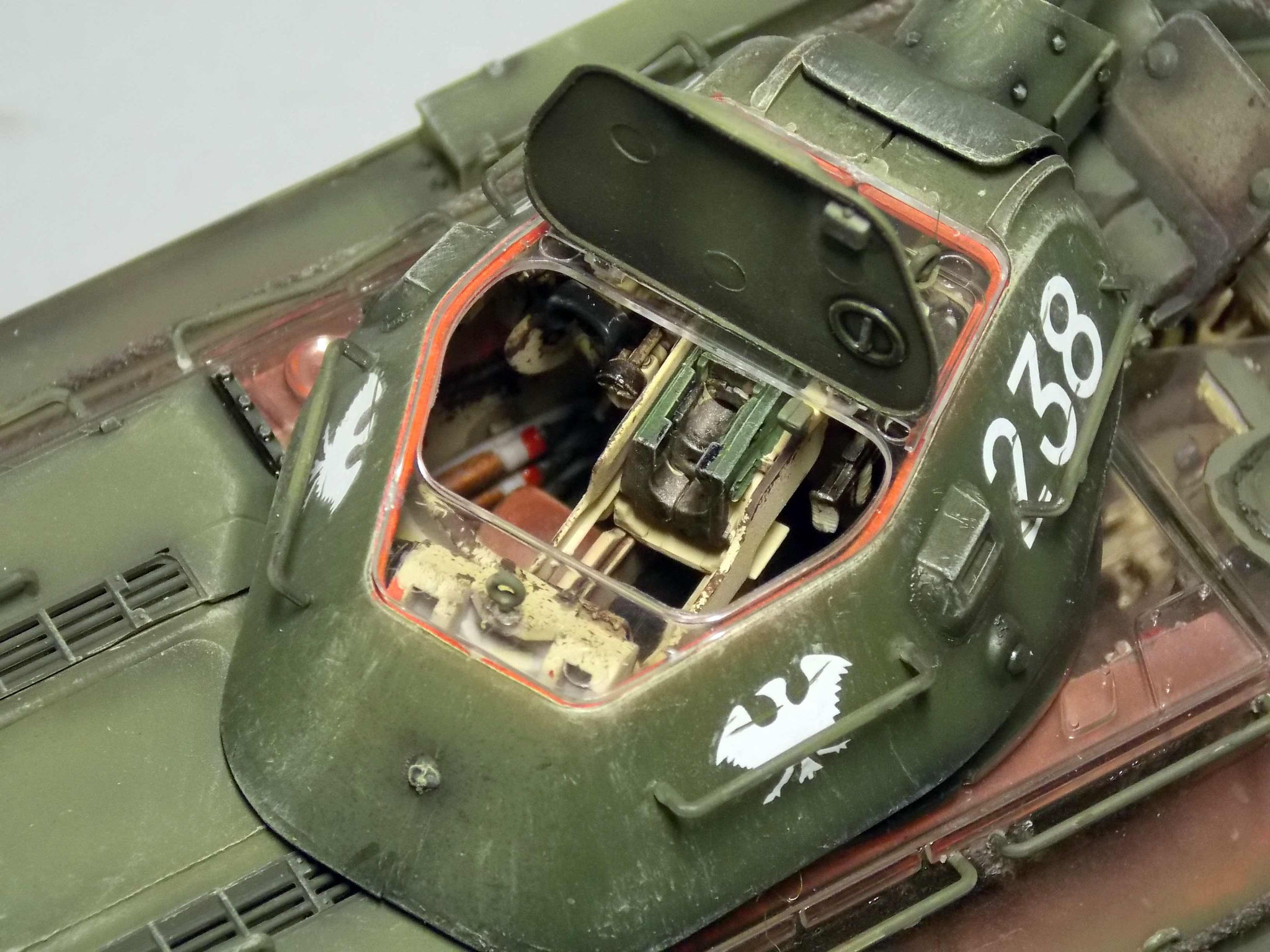 Fahrer und Funkersitz mit den Schalthebeln sind fein ausgeführt. Die senkrechten Federbeine für die Laufrollen sind wie beim Original als echte Federn in den Seitenwänden vorhanden.