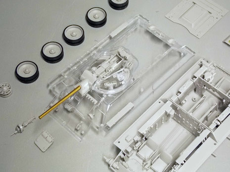 Klarsichtoberwanne mit probeweise aufgestecktem Turm, mit im Bausatz ist auch ein schön gedrehtes Messingrohr enthalten. Das Innenleben des sehr engen Turms kann man später durch ein transparentes Teil der Turmabdeckung schön entdecken. Die Laufrollen sind gleich als schwarz abgesetzte Laufrollenbandagen ausgeführt.