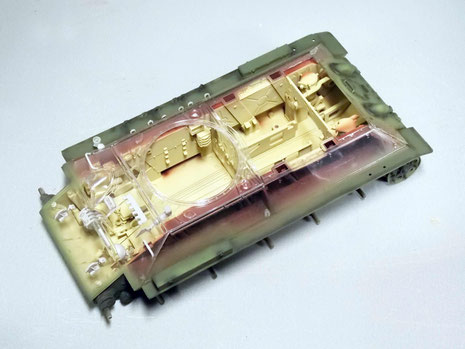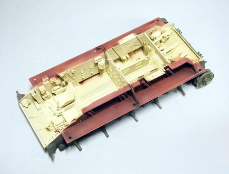 Die Grundfarben der Wanne mit leichten Schattierungen sind ein Cremeweiss für den Innenraum, ein Rostschutzton für die innen liegenden Wannenbereiche und die Wanne in Russisch-Grün mit Alterung und Verschmutzung. Der Motorbereich wartet auf den Einbau den Antriebsteile.