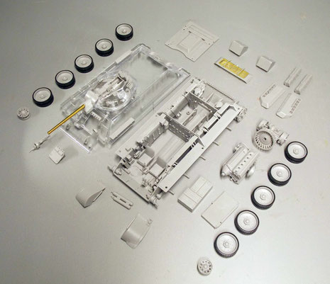 Die transparente Oberwanne wird in den Randbereichen mit Airbrush in Außenfarben angetönt. Die sich noch weiß abzeichneten Anbauteile werden später mit dem Pinsel lackiert. So sind bleiben große Bereiche transparent und weiterhin durchsichtig für den Innenraum.