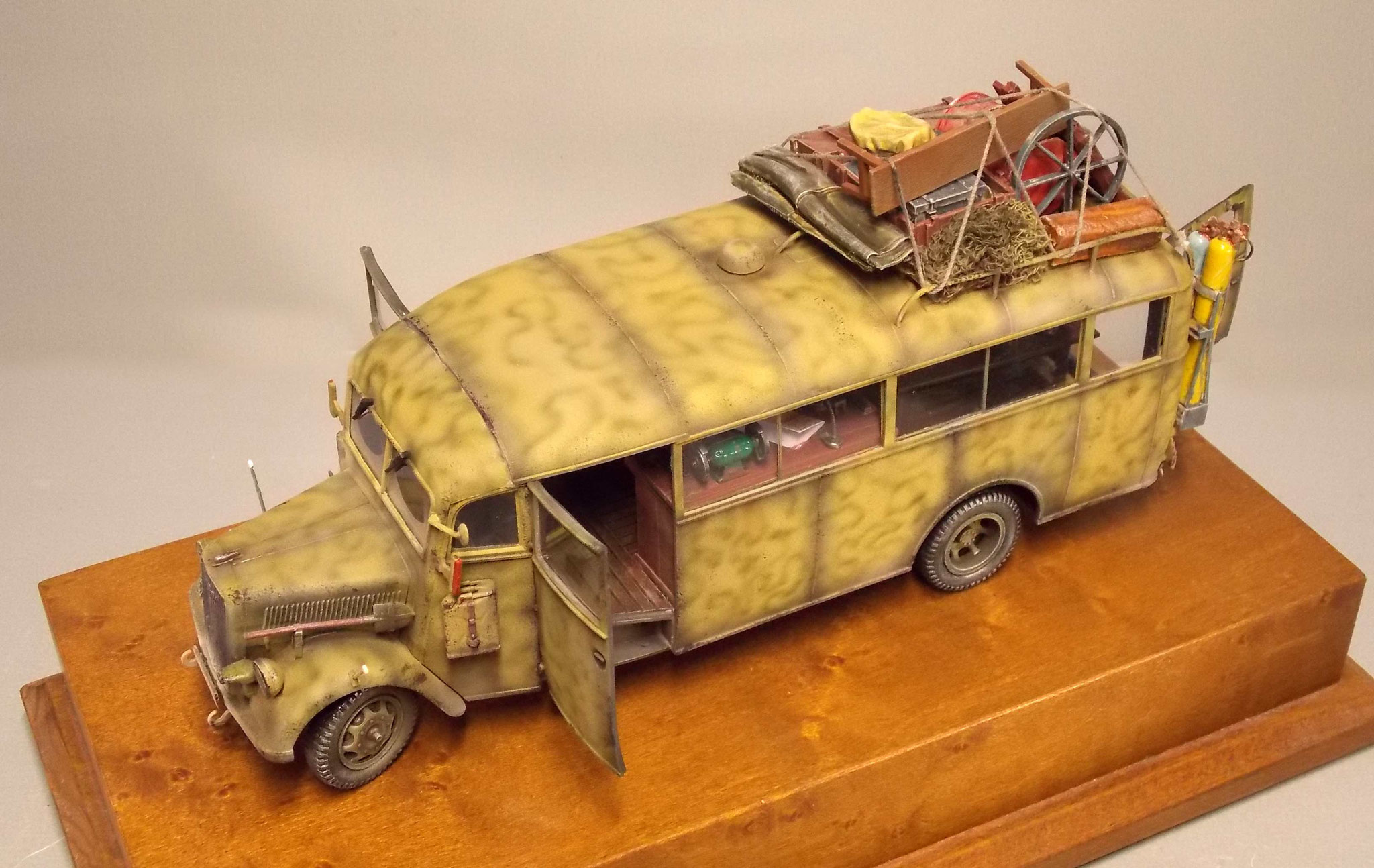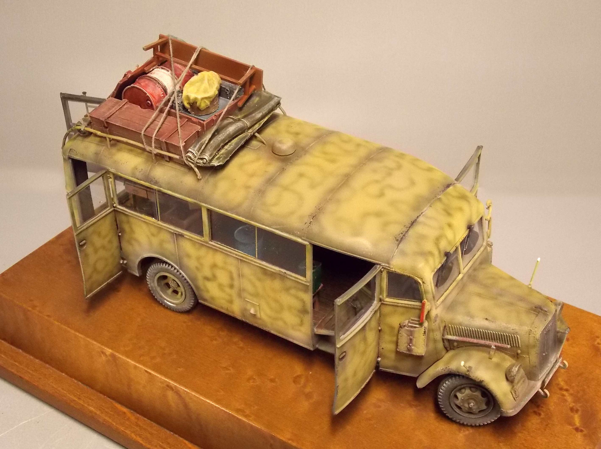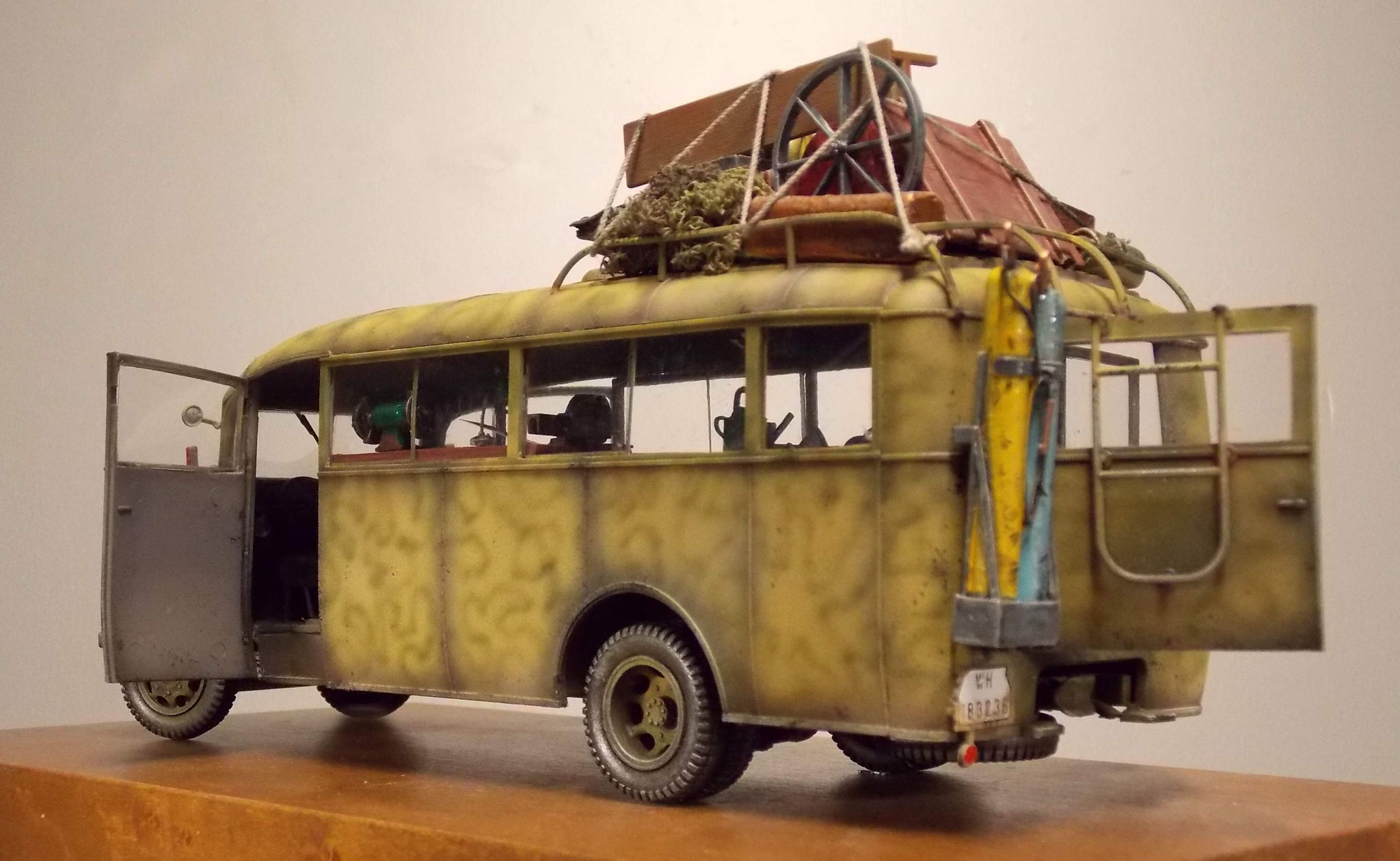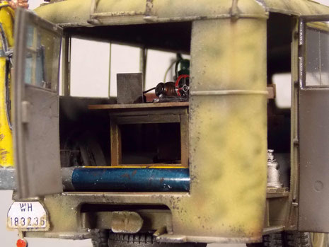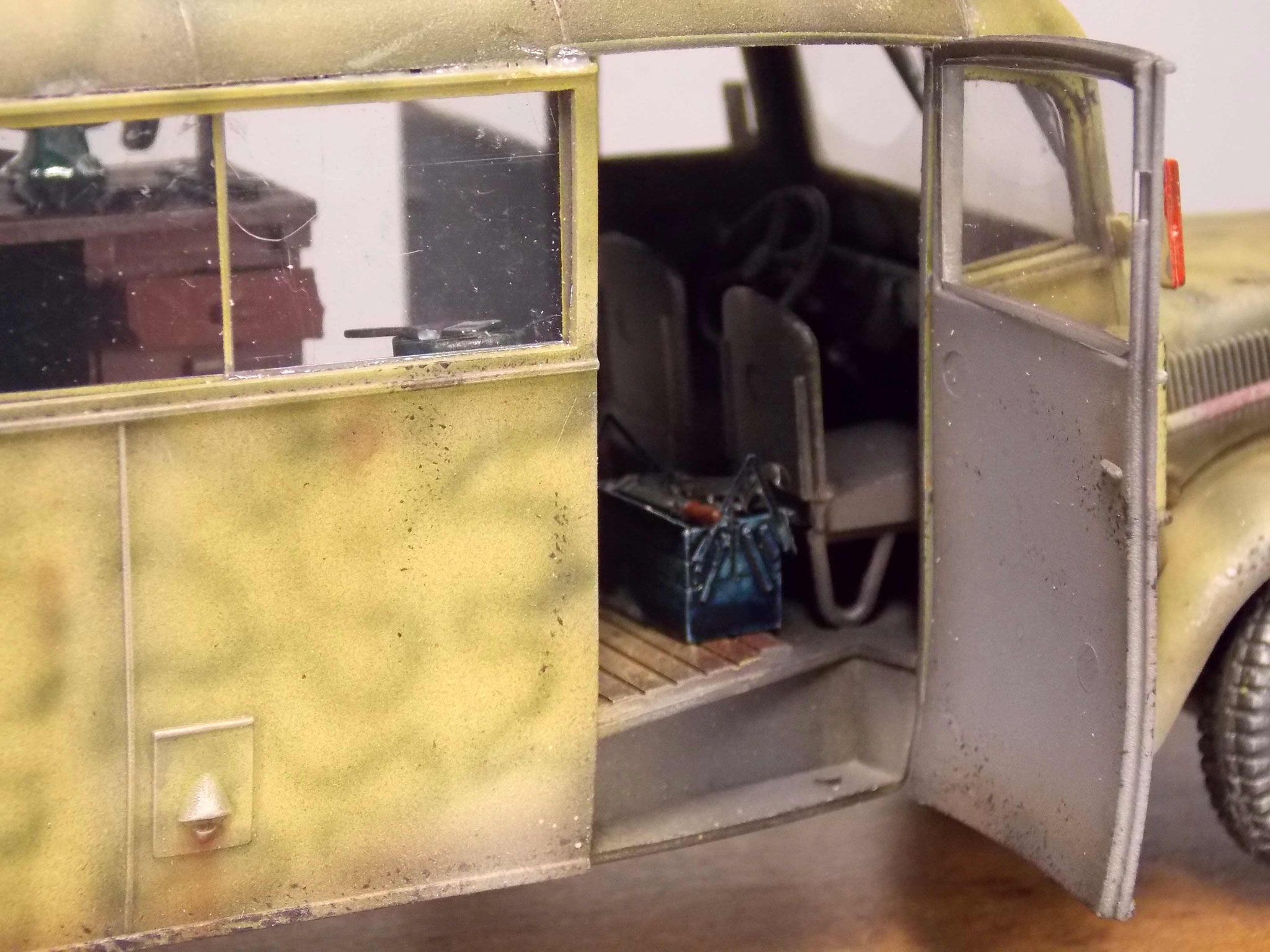 Das Fahrzeug wurde beim Airbrushen in ein Fahrzeug der Wehrmacht in Italien 1943-44 abgetarnt. Nach dem Einbau der Inneneinrichtung kann das Dach geschlossen werden. Die Frontscheiben haben noch die Flächen für die Scheibenwischerbereich abgeklebt.
