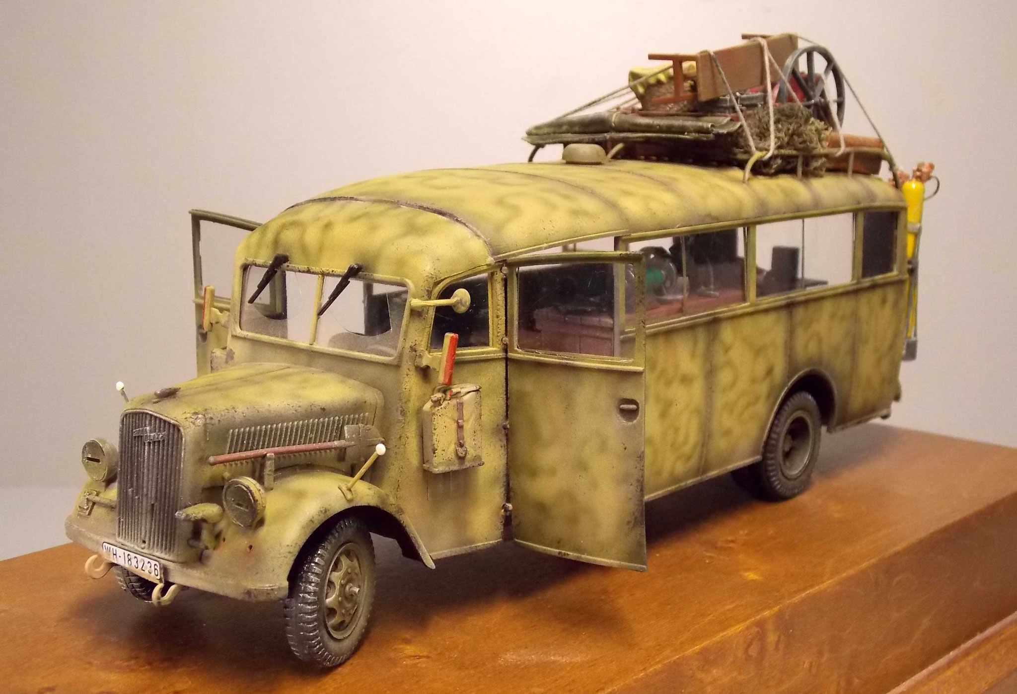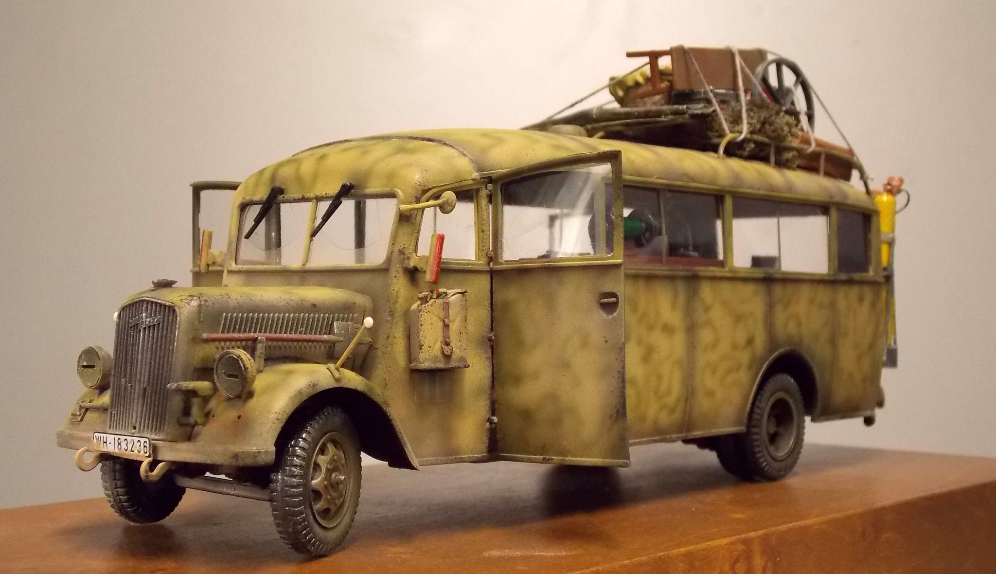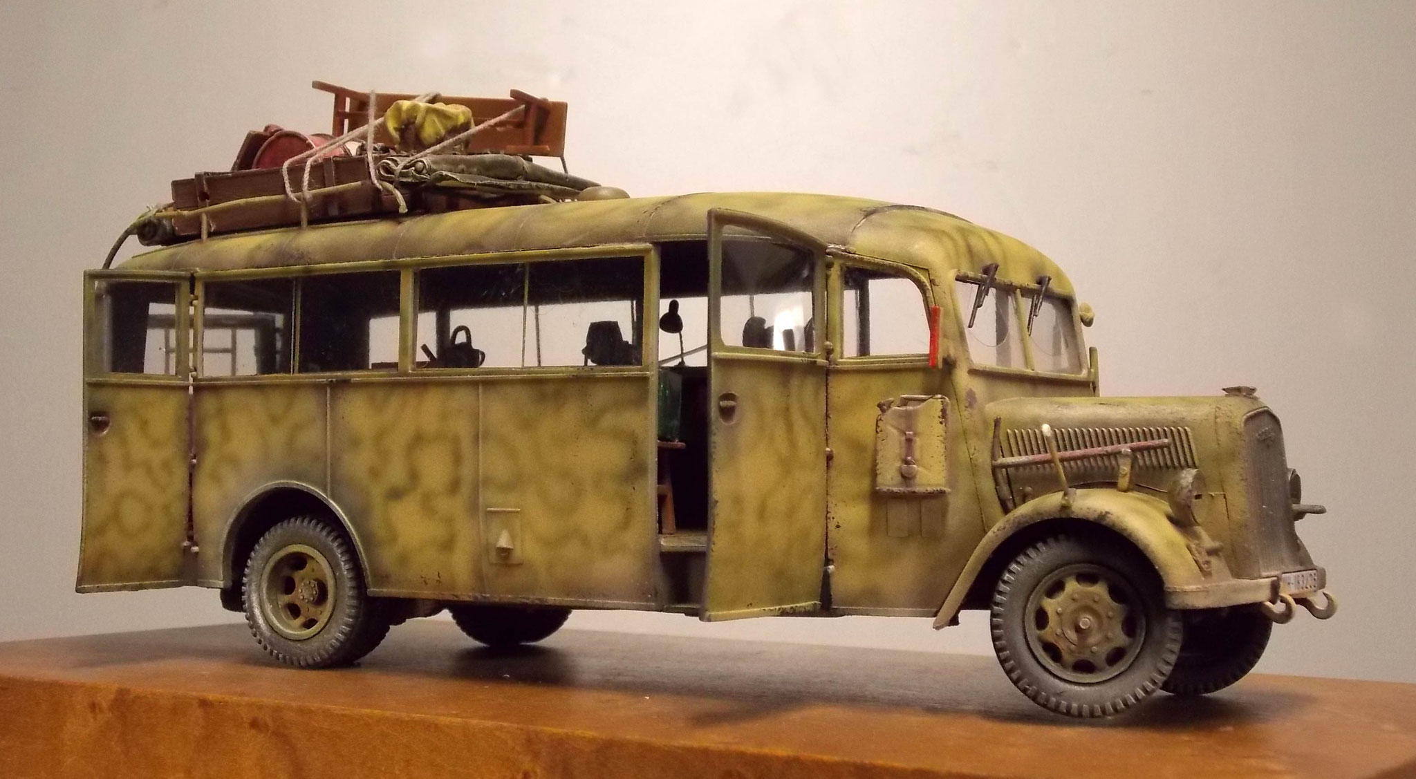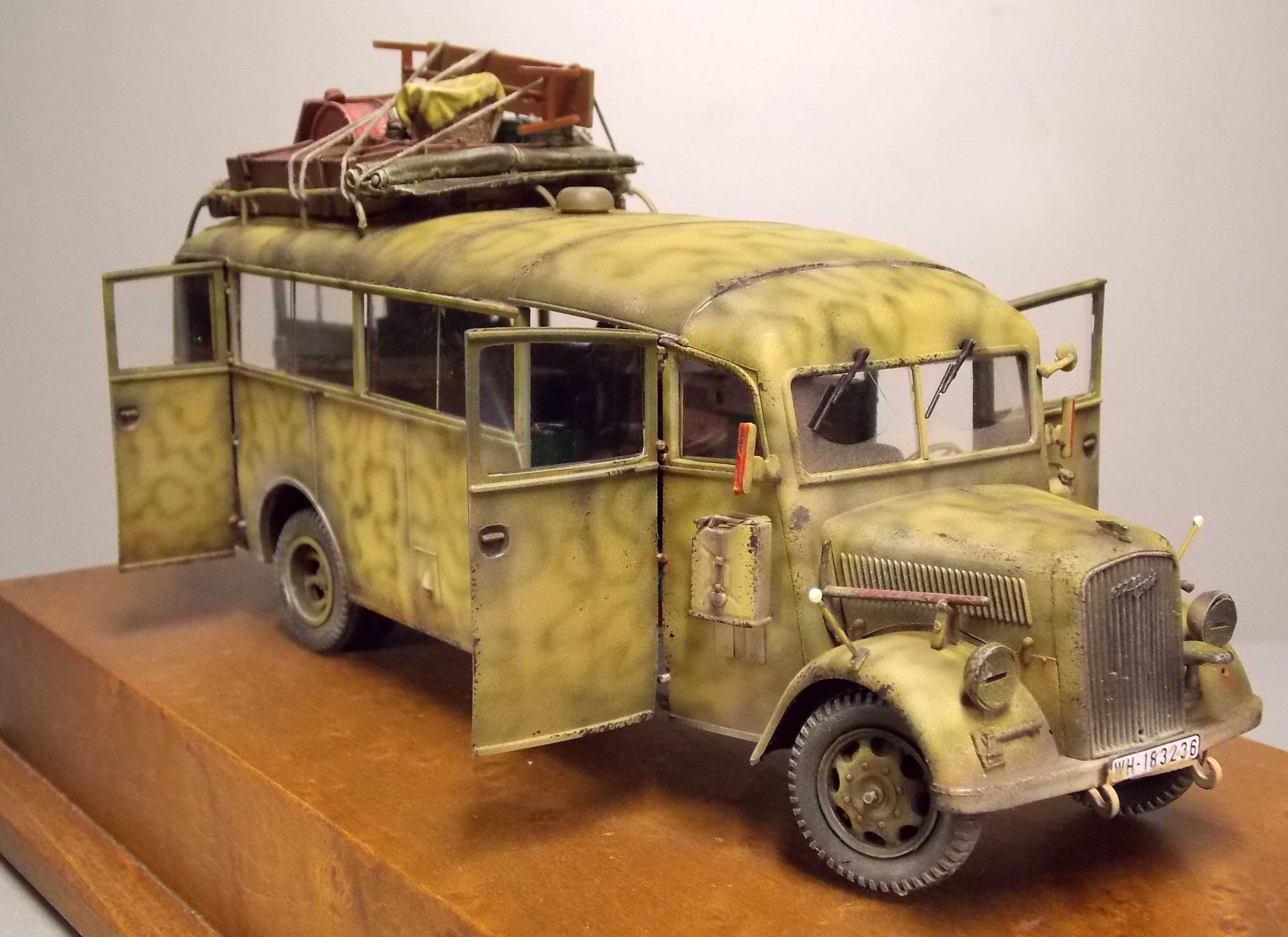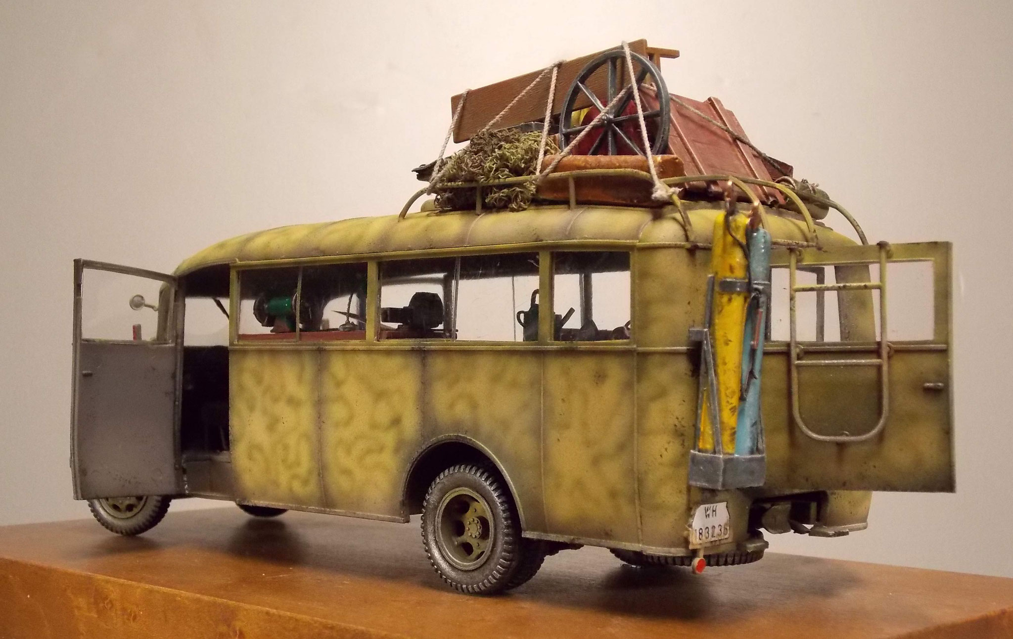 Das Fahrzeug wurde beim Airbrushen in ein Fahrzeug der Wehrmacht in Italien 1943-44 abgetarnt. Nach dem Einbau der Inneneinrichtung kann das Dach geschlossen werden. Die Frontscheiben haben noch die Flächen für die Scheibenwischerbereich abgeklebt.