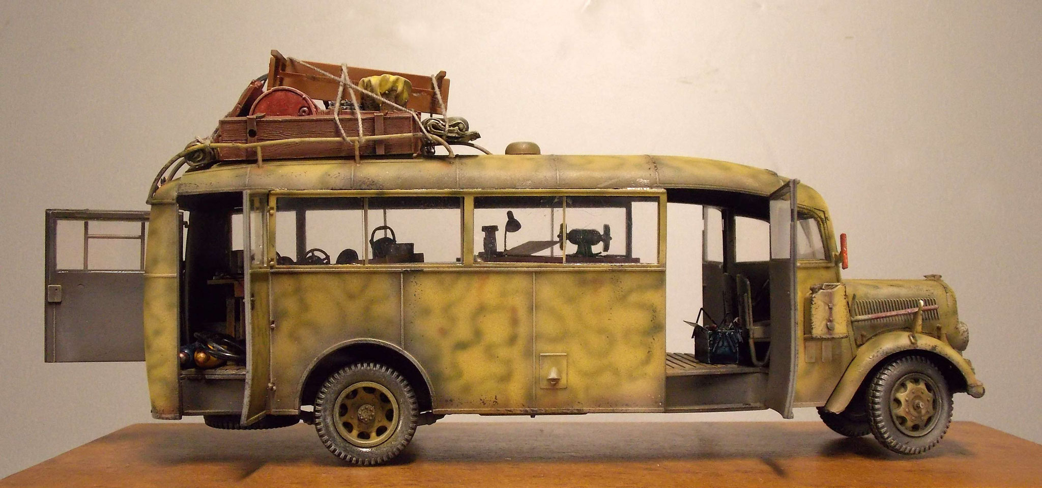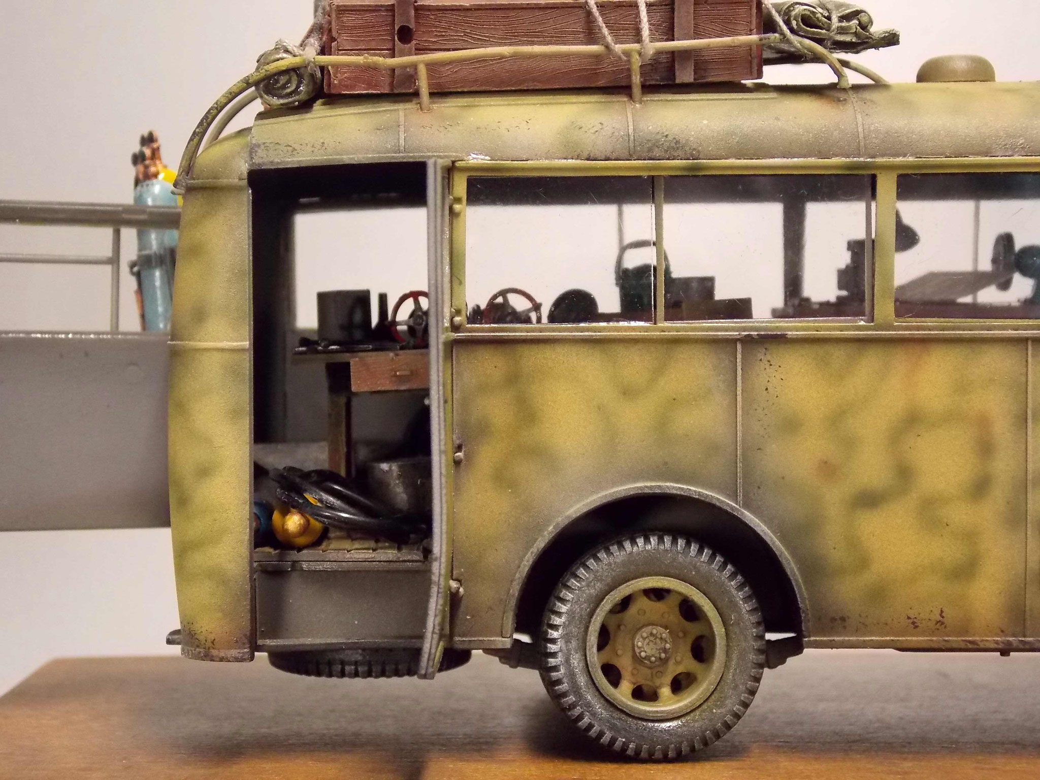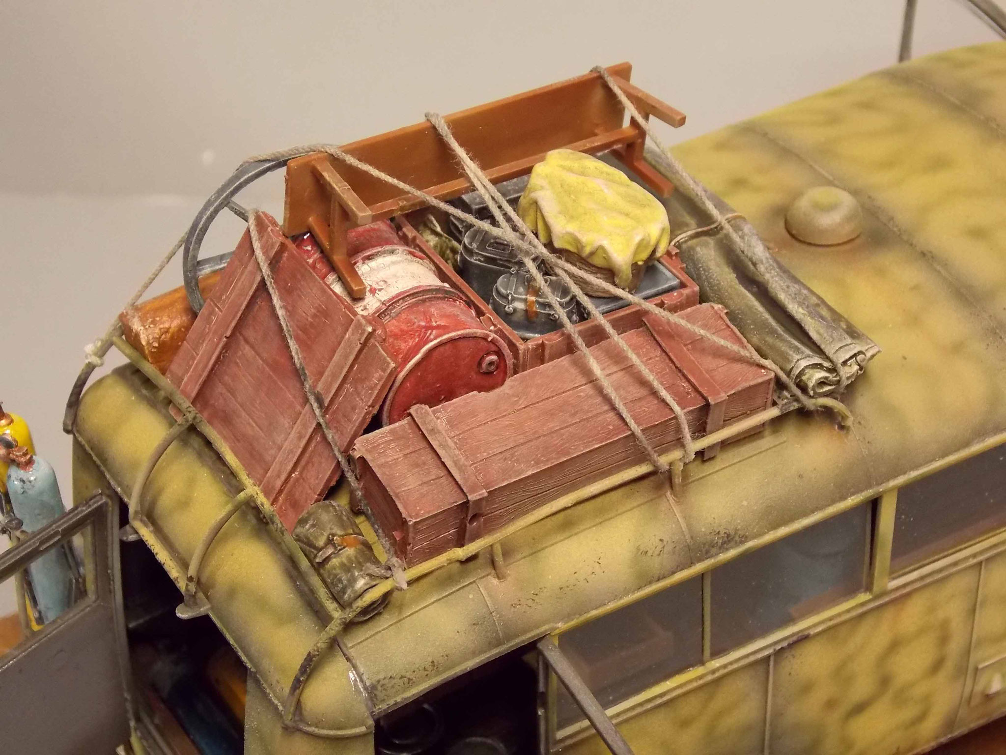 Als Basisbausatz kommt das aktuelle Kit von Roden zur Verwendung. Dabei werden die Sitzreihen nicht verbaut, sondern eine Werkstatt-Inneneinrichtung eingebaut. Die Baugruppen können mit geöffneten Dach soweit vorgebaut werden, sodaß man alle Bereich noch gut erreichen kann.